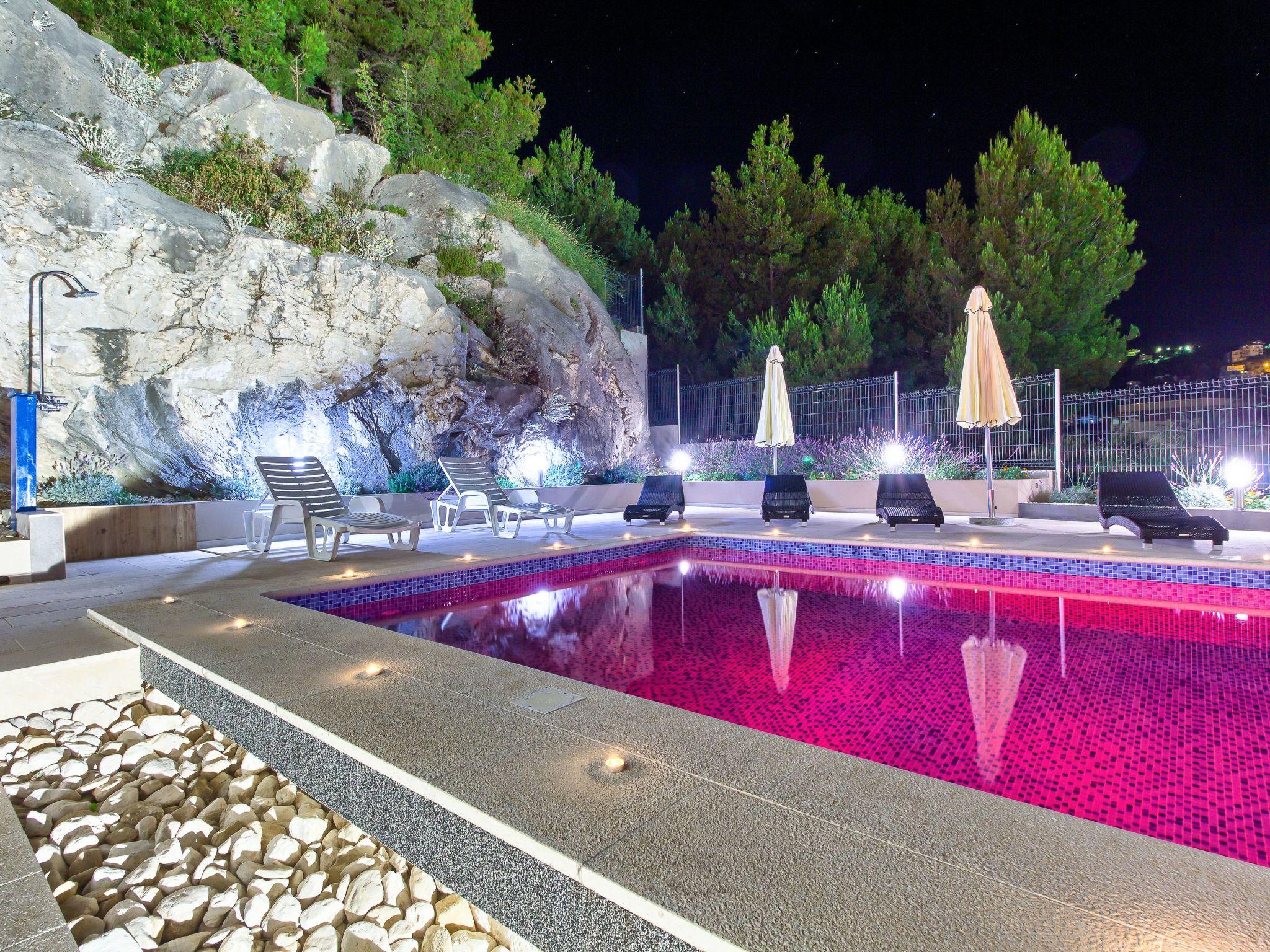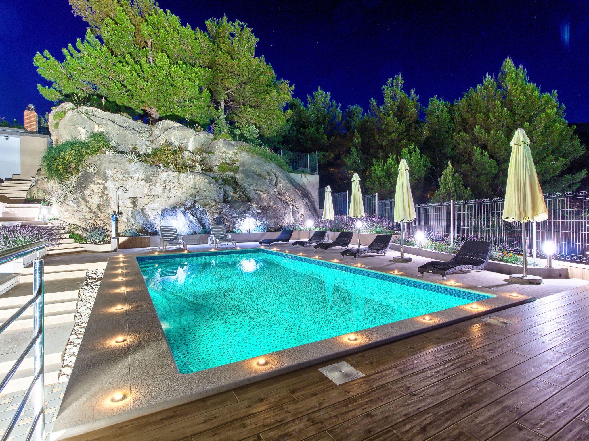 This light and spacious villa is near the beach in the little community of Podstrana outside of Split in the sunny region of Dalmatia, offering luxurious accommodation for a relaxing holiday with family or friends, as well as an ideal starting point for experiencing the long beaches and romantic bays in the region. Villa Rock has 200m² of indoor living space, big pool, spacious parking, garden full of vegetation and barbecue.Modern and tastefully decorated villa, with a private pool illuminated at night and a panoramic sea view from the private sunny balcony