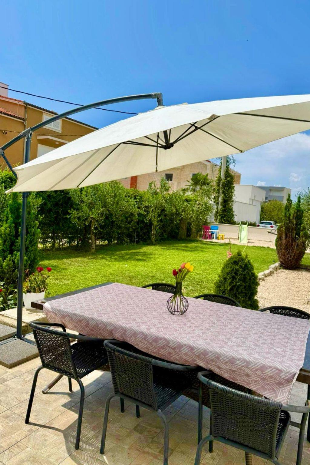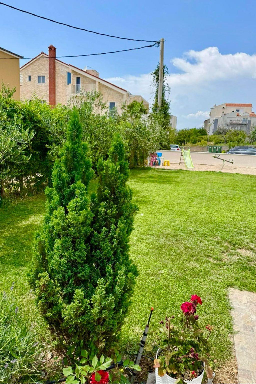 The terrace is equipped with garden furniture, The property is fenced and is therefore suitable for children, beautiful garden, lawn, kids playground, free parking area and outside grill/barbecue.