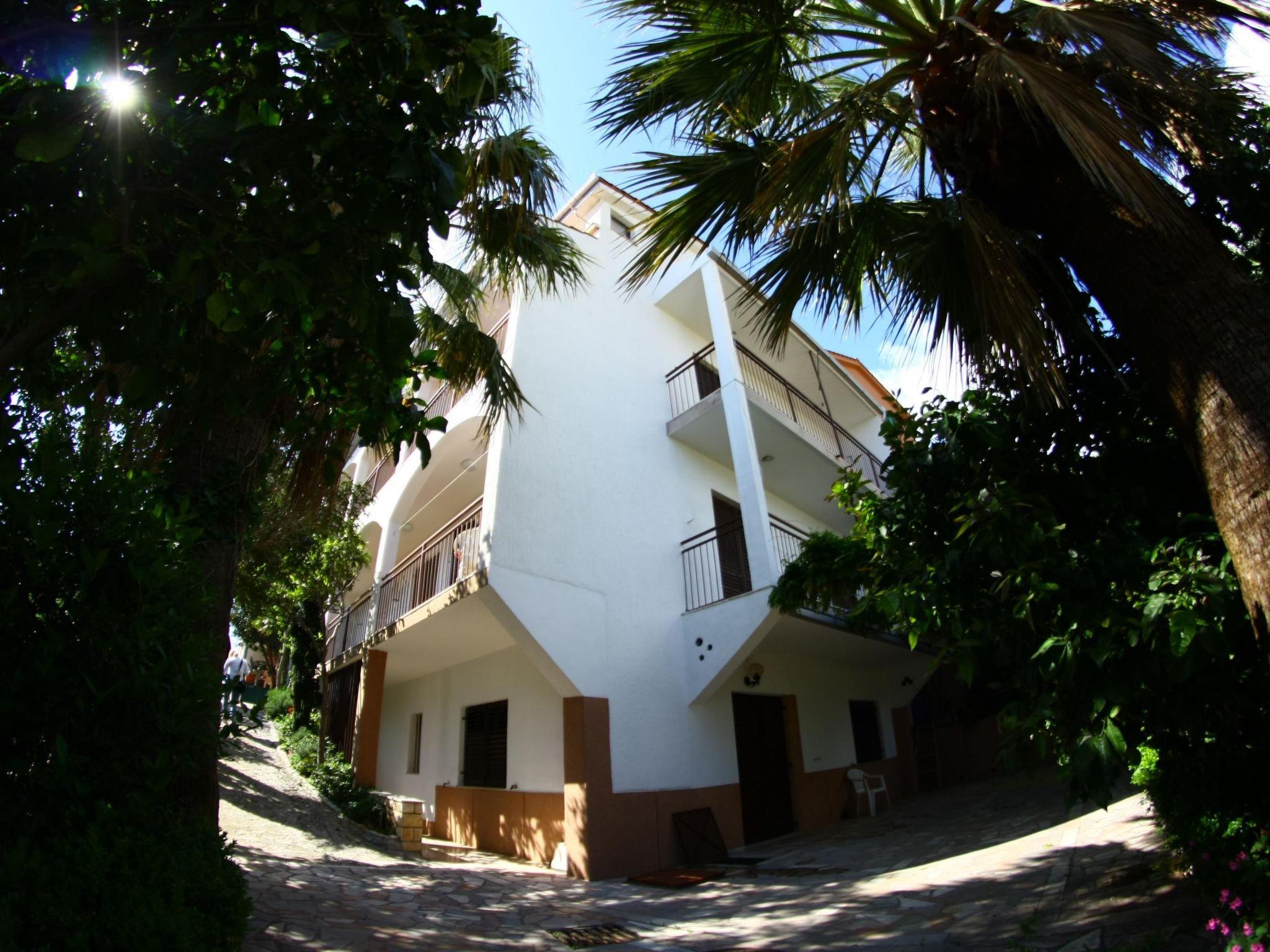 This 64m² apartment is on the ground floor of the house. The living room has a TV and three single beds. The kitchen includes a dining space and is equipped with a hob, fridge and freezer compartment. The bedroom provides a double bed. The bathroom has a bath, washbasin and WC.