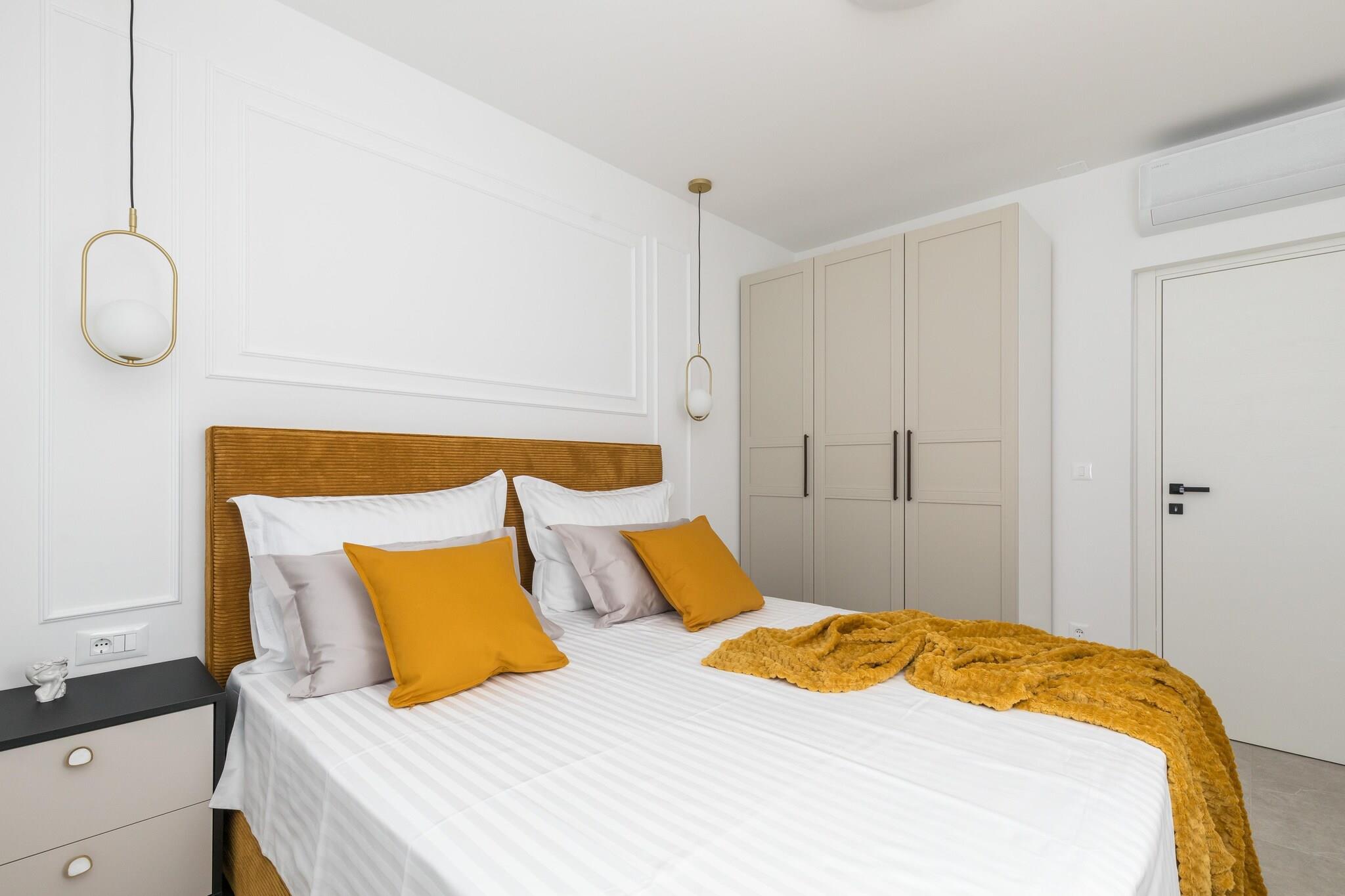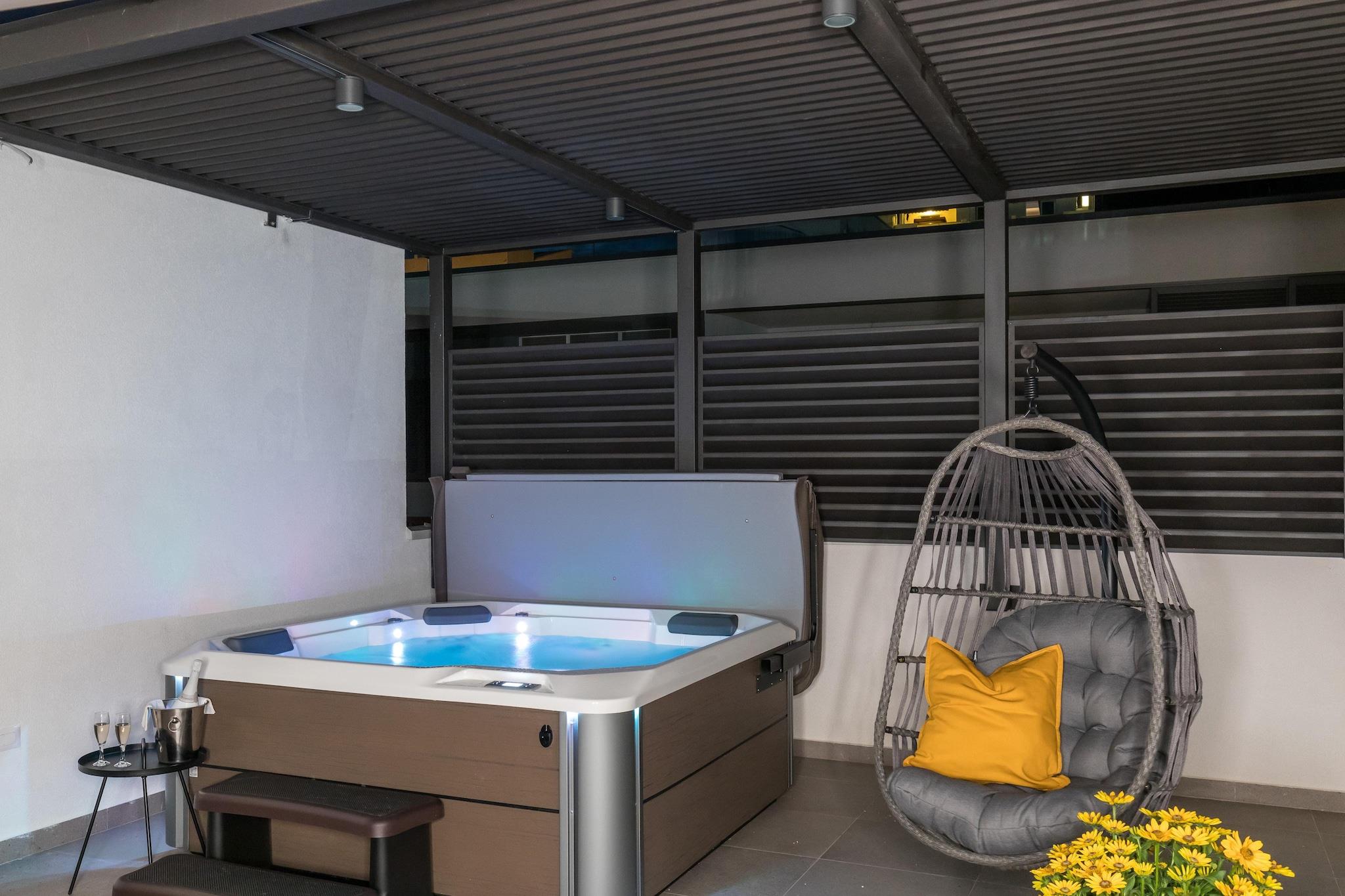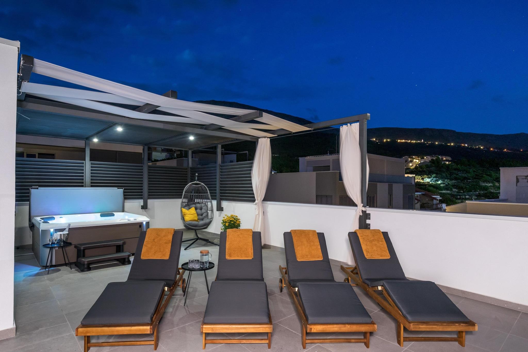 På 1. etage: (Stue(Fjernsyn(fladskærm), sofahjørne), Køkken(spisebord, elkedel, komfur, kaffemaskine, ovn, mikrobølgeovn, opvaskemaskine , køle-fryseskab), soveværelse(dobbeltseng), soveværelse(dobbeltseng), badeværelse(bruser, håndvask, toilet), Bubble bath(privat), terrasse(privat, indhegnet)) vaskemaskine, klimaanlæg, havemøbler, solstole, parkering, loungemøbler
