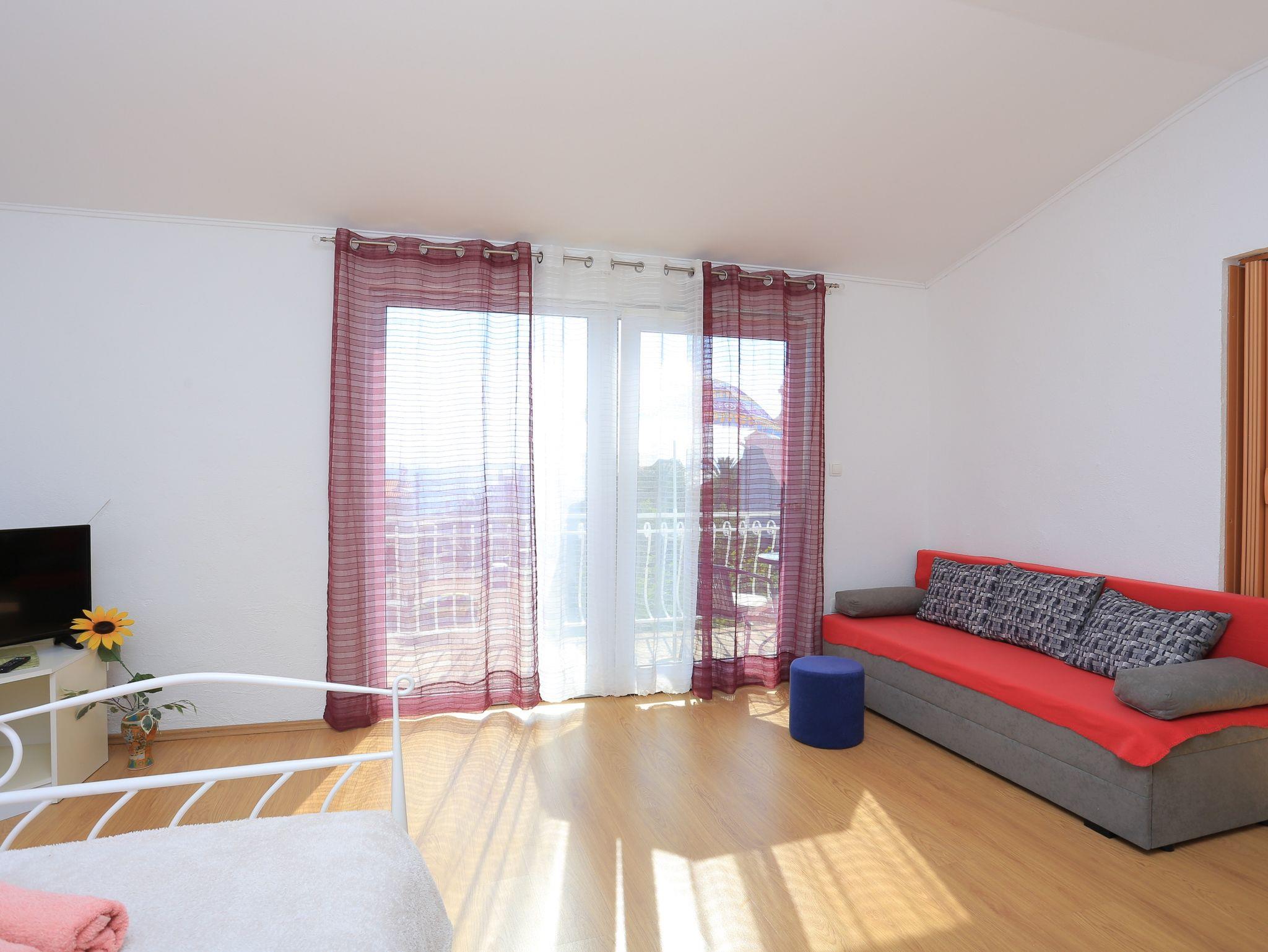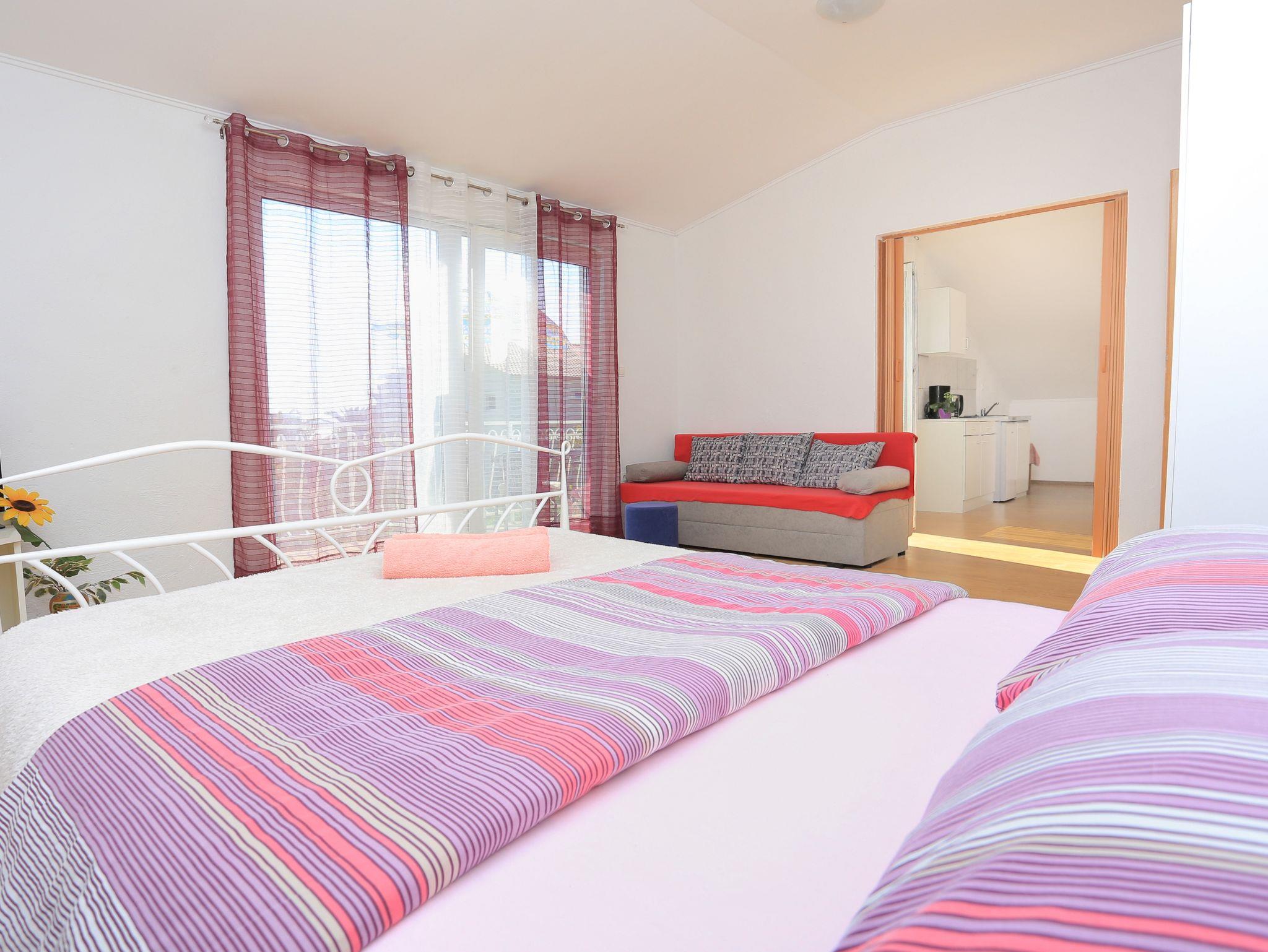 Studio bietet Platz für 4 Gäste. Die Betten sind in Schlafzimmern, die es 1 gibt, und in Wohnzimmer und Esszimmer, innerhalb einer Gesamtfläche von 41m2, angeordnet. Die Gäste haben einen eigenen Balkon zur Verfügung, auf der sie in warmen Sommernächten genießen können. Das Studio-Apartment bietet Meerblick. IM PREIS INBEGRIFFEN: Kurtaxe, Endreinigung, Klimatisierung, Parkplatz, Internet, Bügeleisen, Bügelbrett, Föhn. VERBINDLICHE ZUSÄTZLICHE KOSTEN: Aufzahlung für Kurzaufenthalte (prozentualer Zuschlag pro Nächtigungsanzahl: 30% - 1, 20% - 2, 10% - 3). Die Verfügbarkeit zusätzlicher Dienstleistungen in Ihrem reservierten Termin und die Preise derselben (falls nicht aufgeführt) müssen im Voraus überprüft werden. Zusätzliche Dienstleistungen die in der Zahlungsaufforderung nicht aufgeführt sind werden direkt beim Vermieter bezahlt, angenommen der Gast nutzt auch diese.