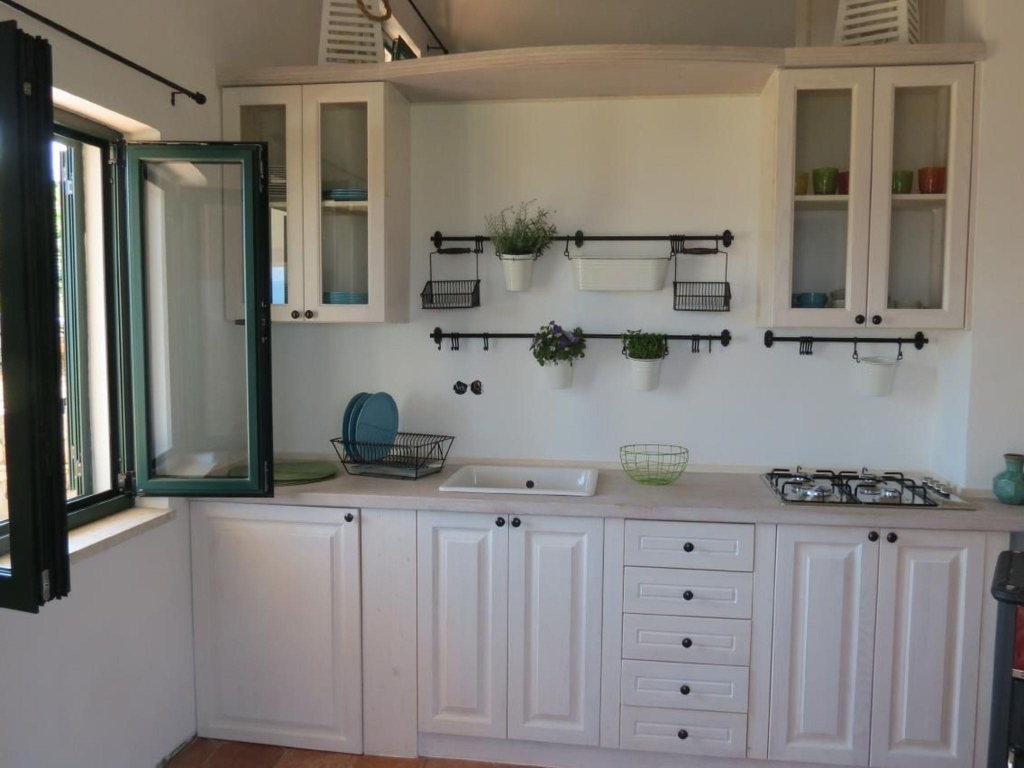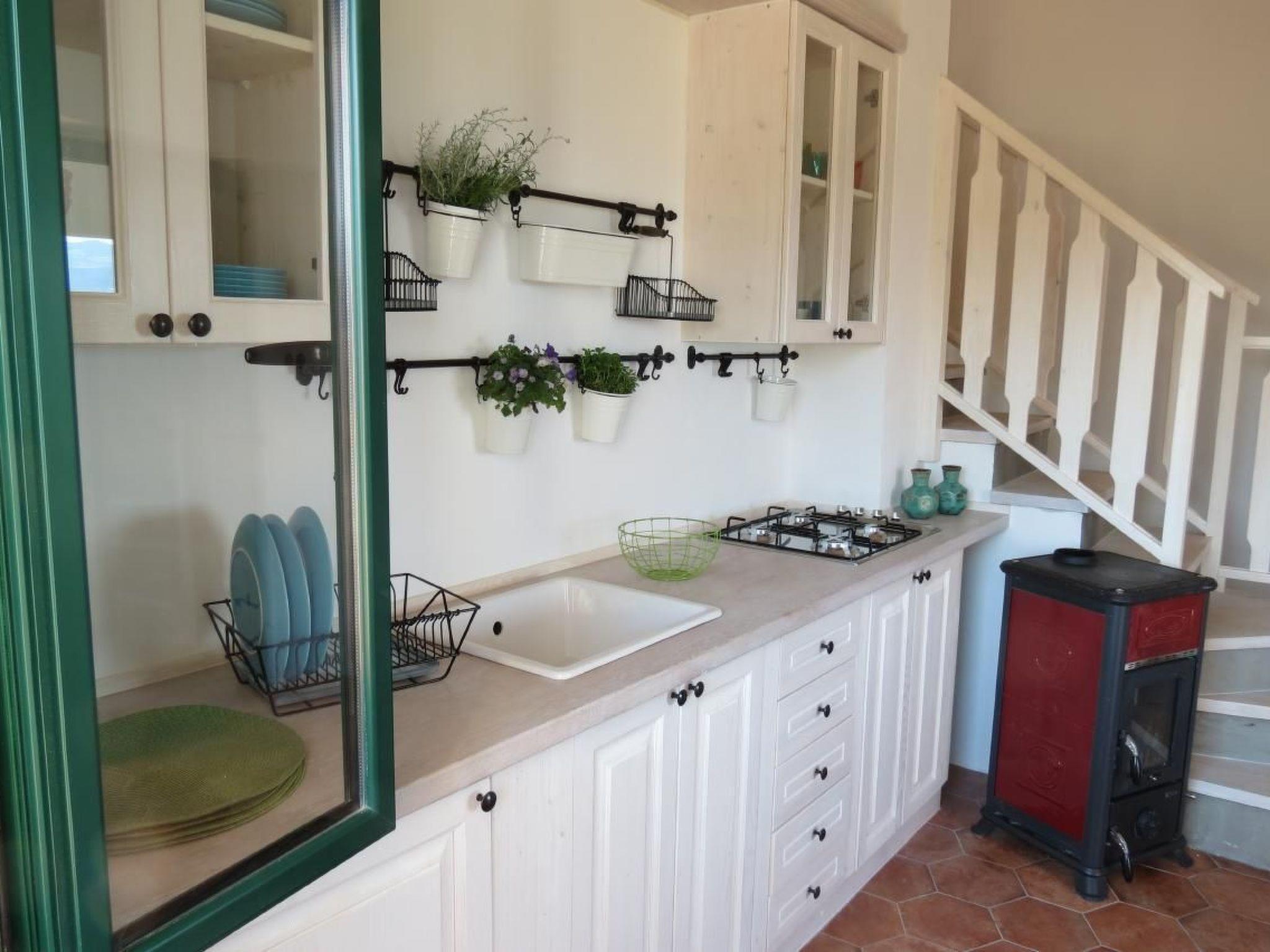 The house is on three levels: on the ground floor is the kitchen, three steps down is a bedroom with a double bed and on the third floor is the living room with a double sofa bed and satellite TV. Also on the third floor is a bathroom with shower. On the large covered terrace there is a dining table. The sea is ideal for fishing and snorkelling.