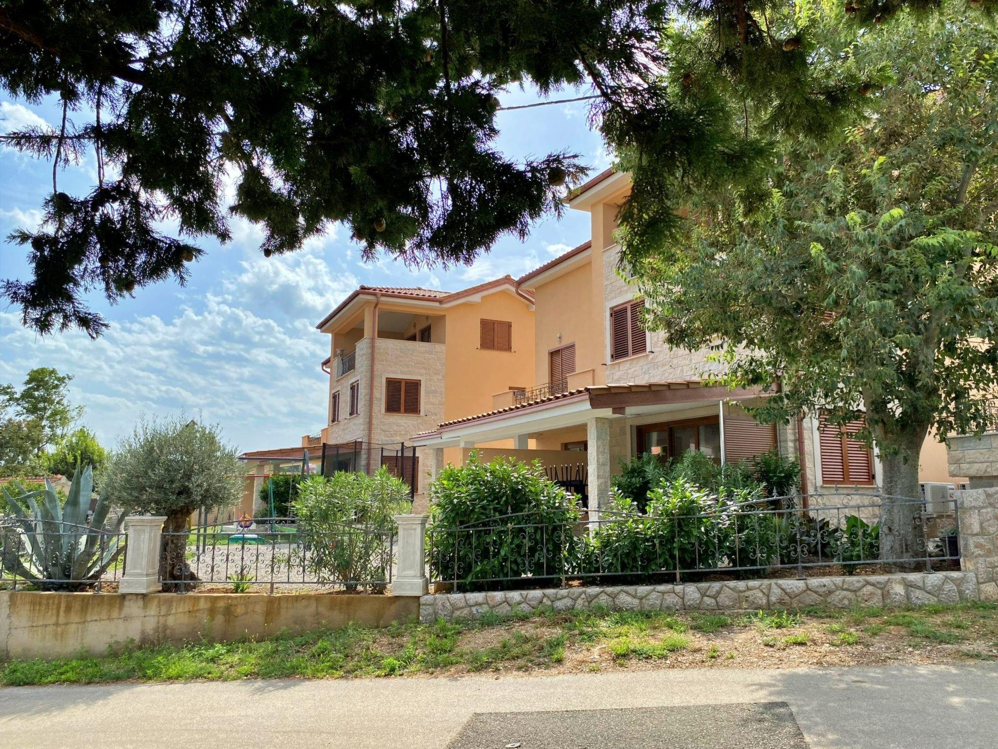 This charming flat is located on several floors: ground floor and 1st floor. On the 1st floor there are two bedrooms with double beds and sea views. The ground floor has a 15 m2 covered terrace with dining table and sea view. The kitchen is equipped with a ceramic hob, microwave, fridge with freezer compartment, dishwasher, coffee machine and kettle, as well as a dining table. The living room has air conditioning, satellite TV, a cosy sofa and access to the terrace. The flat has a bathroom with shower, toilet and hairdryer, as well as a separate bathroom with toilet. Guests have free Wi-Fi, private parking, a gas barbecue and access to a children's playground in the communal courtyard. The house is just 160 metres from the concrete and pebble beach and also offers underfloor cooling and heating for year-round comfort.