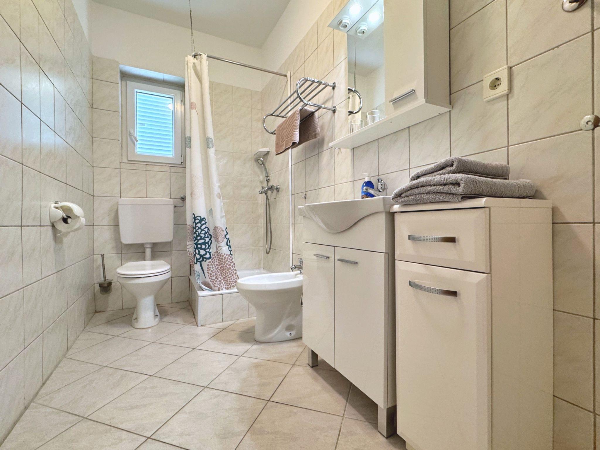 Inside the flat you will find two inviting bedrooms with comfortable double beds, one of which has direct access to the balcony. An open-plan living room harmoniously integrates the kitchen and is fully equipped with modern amenities such as an electric hob, oven, fridge, microwave, toaster, kettle and coffee machine. The adjoining bathroom offers a refreshing shower, toilet, bidet and hairdryer to make your stay as comfortable as possible.