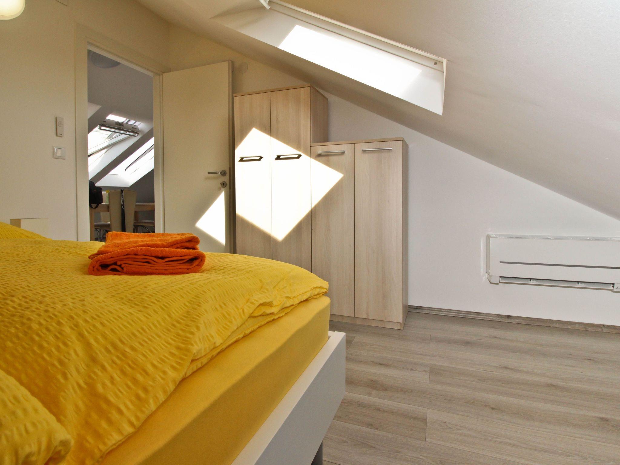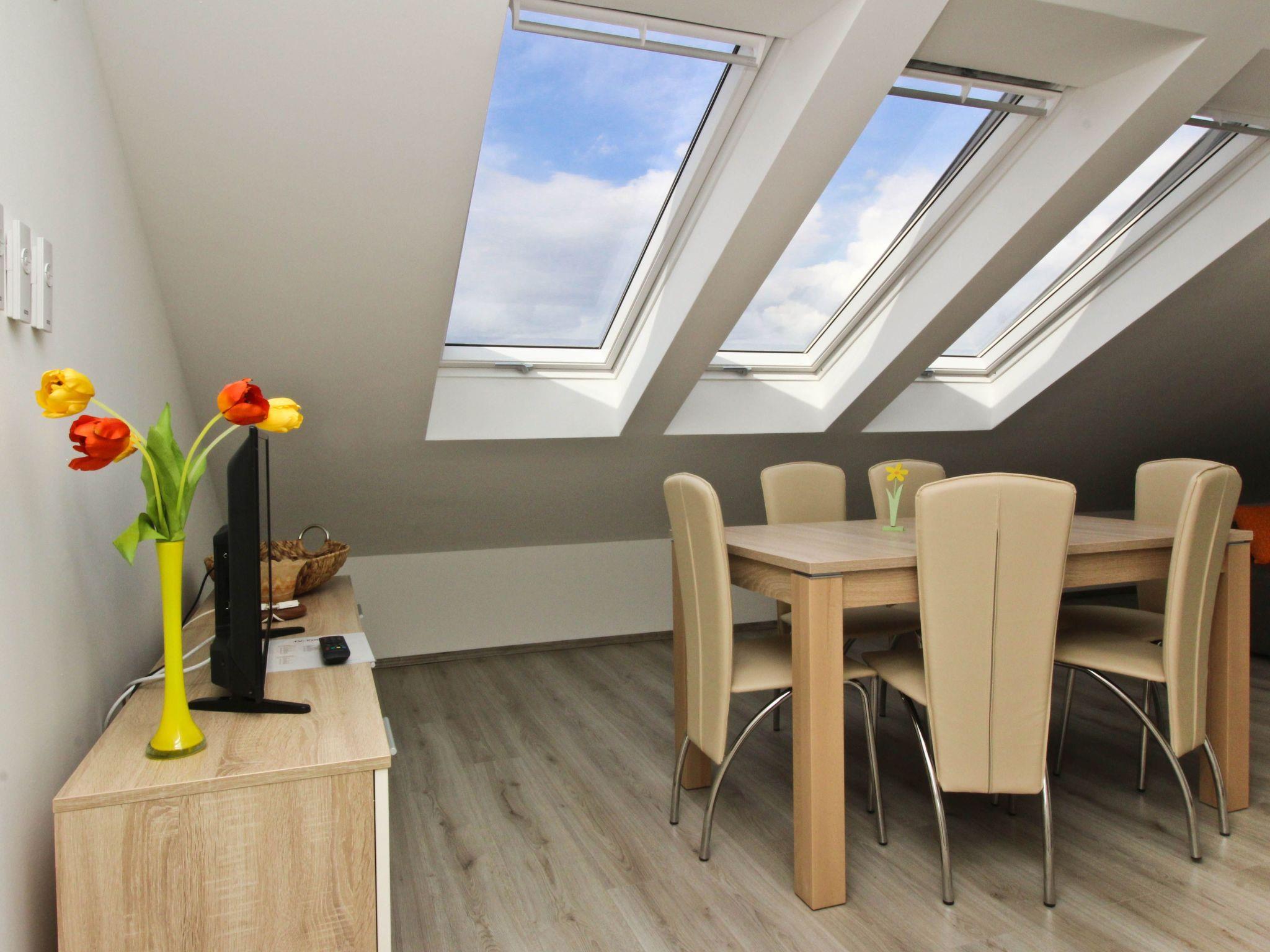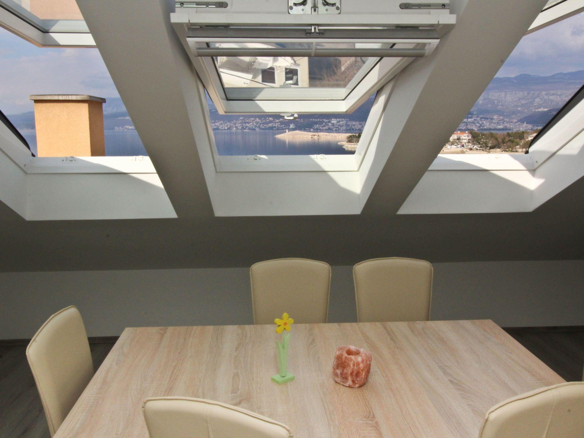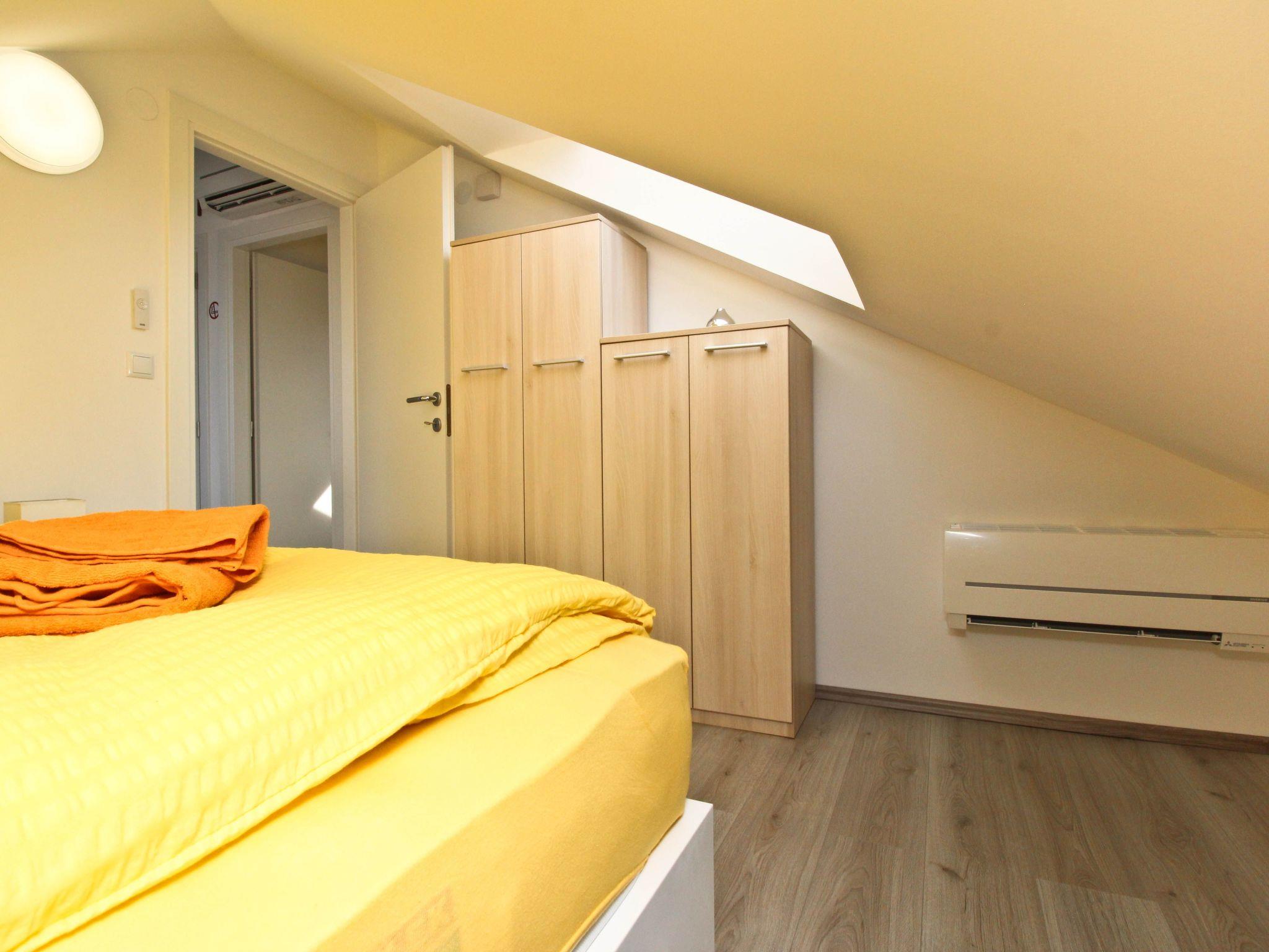 This cosy top floor flat is located just 60 metres from a sandy beach and 260 metres from the town centre and is ideal for families or groups of 4-6 guests. It has two air-conditioned bedrooms, each with a double bed, and a living room with a pull-out sofa for two more guests. The open-plan dining area offers a beautiful sea view. The kitchenette is well equipped with an electric cooker, mini fridge with freezer compartment, coffee maker, kettle and microwave.