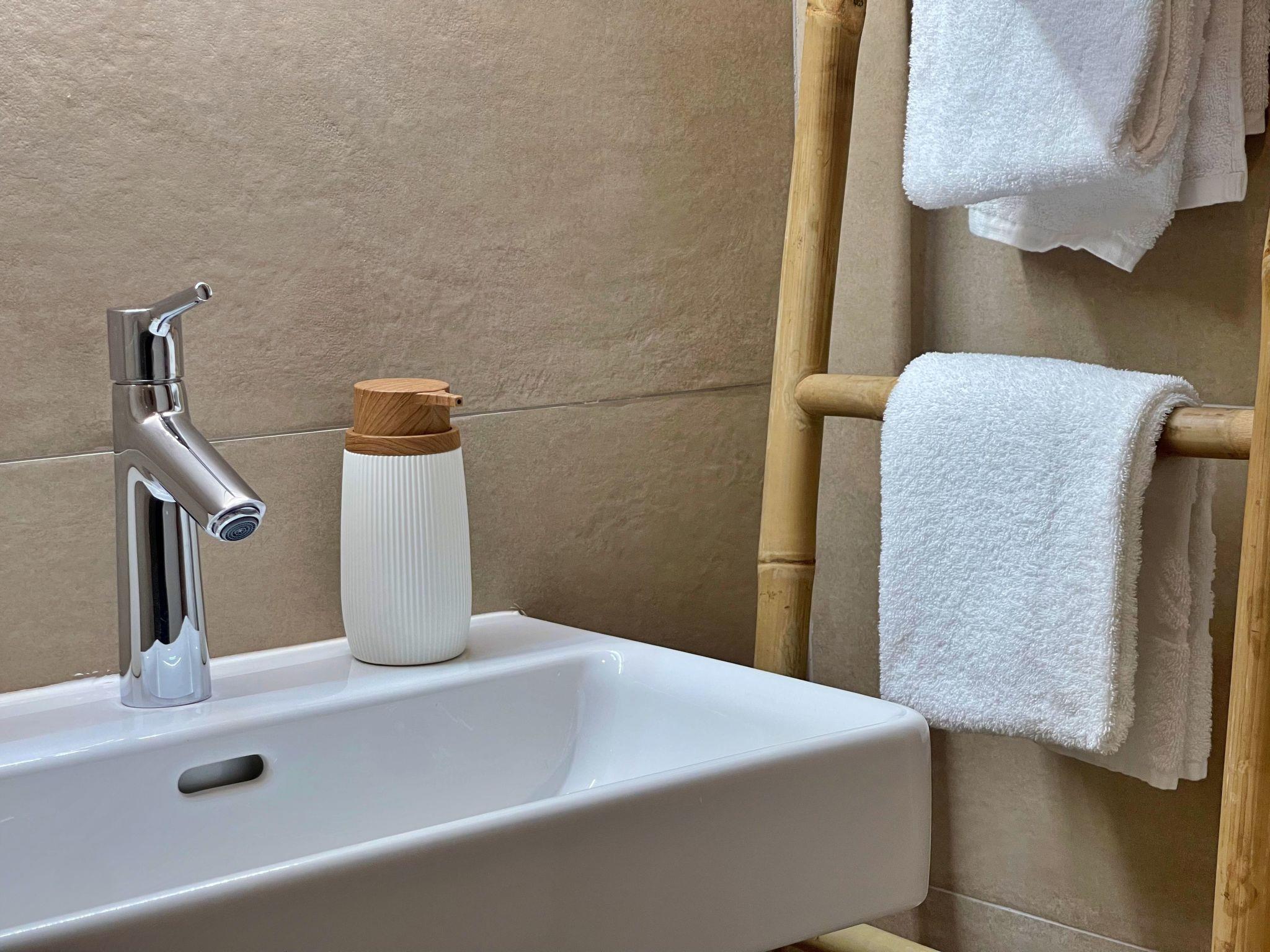 The outdoor area is characterised by a private, fully fenced terrace, which creates an oasis of relaxation with sun loungers, a hot tub and an additional dining area with parasol. An outdoor shower and a private drinks fridge round off the outdoor experience. The nearby pool for communal use is a refreshing alternative to a visit to the beach.