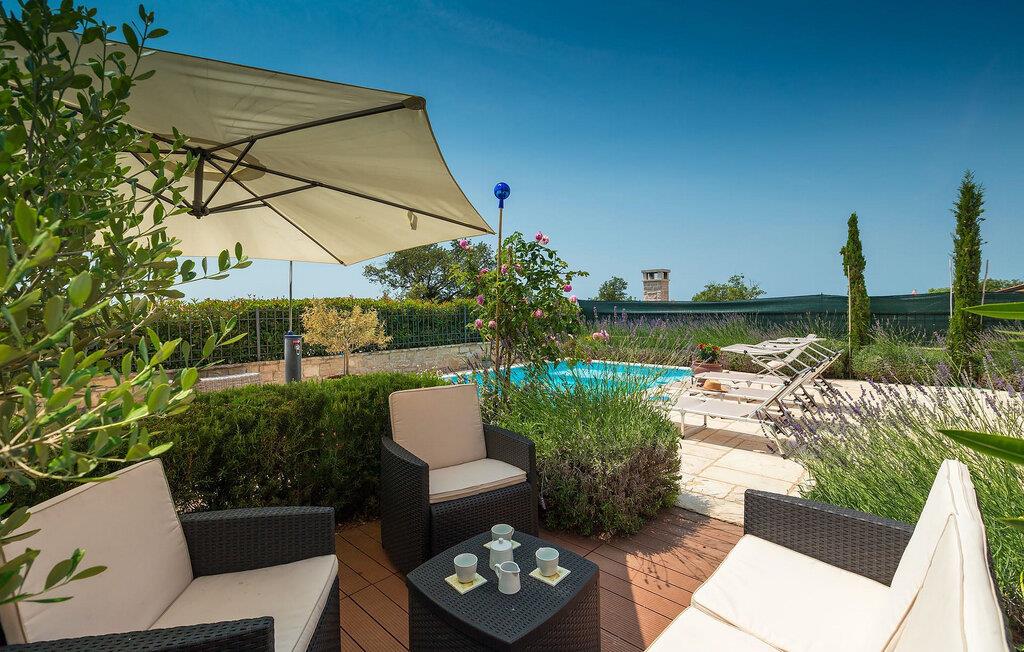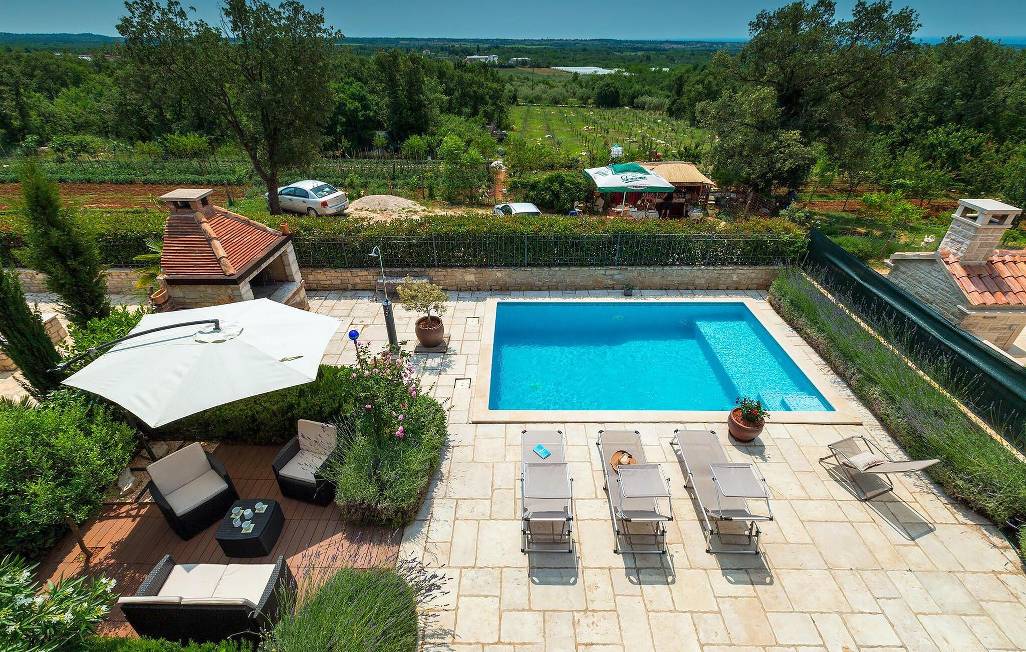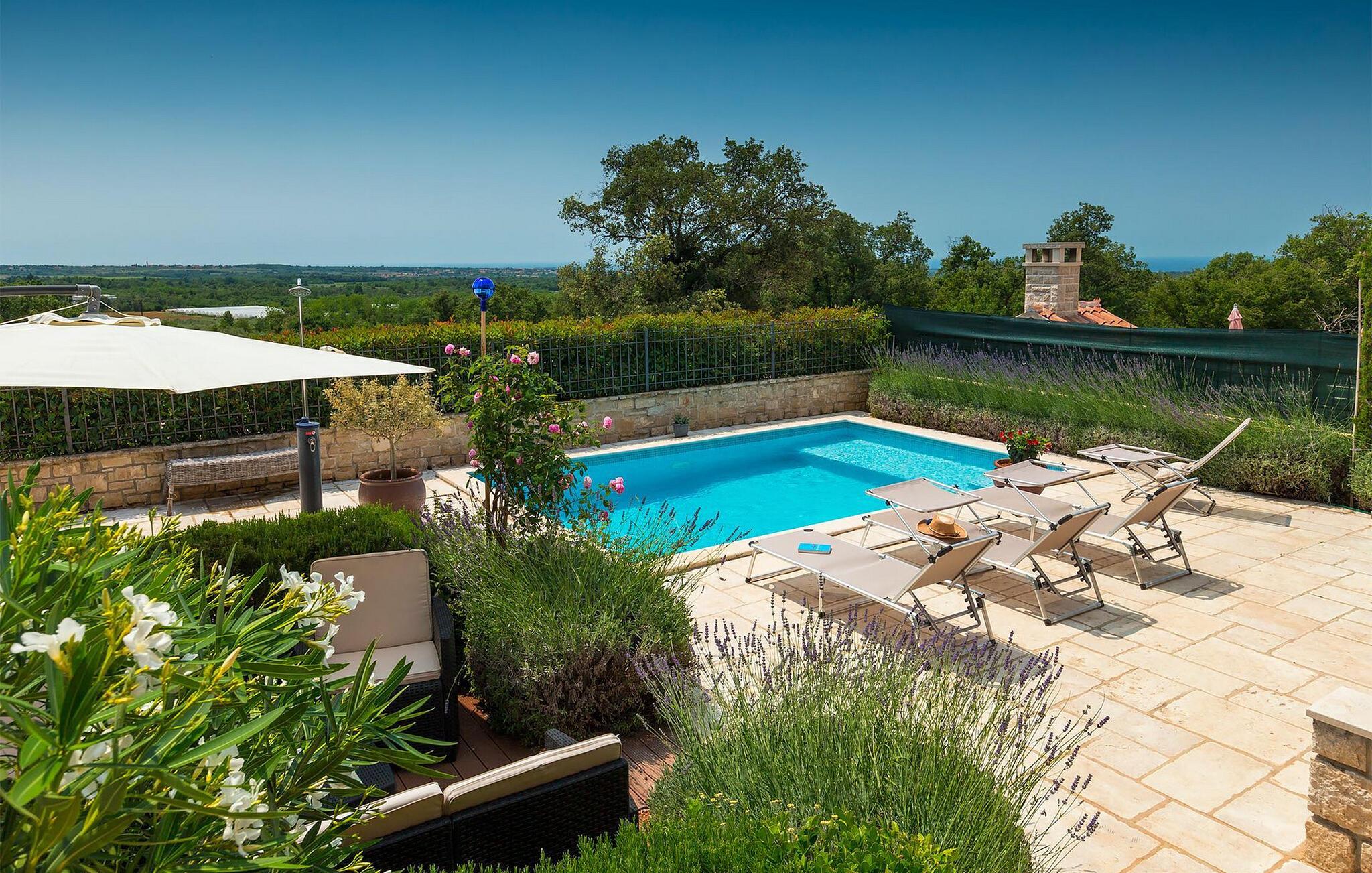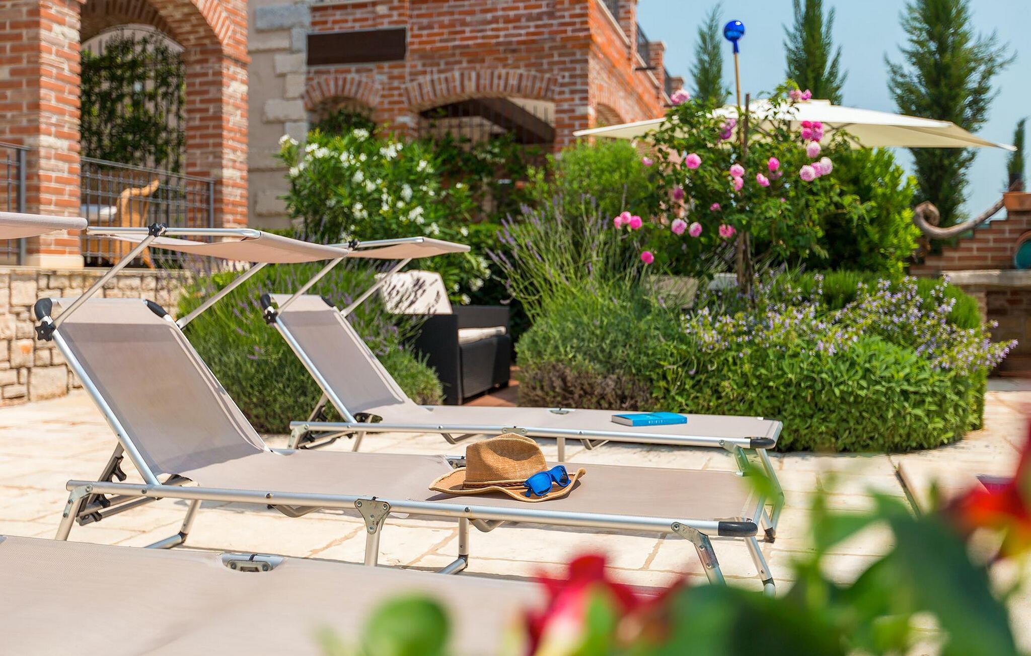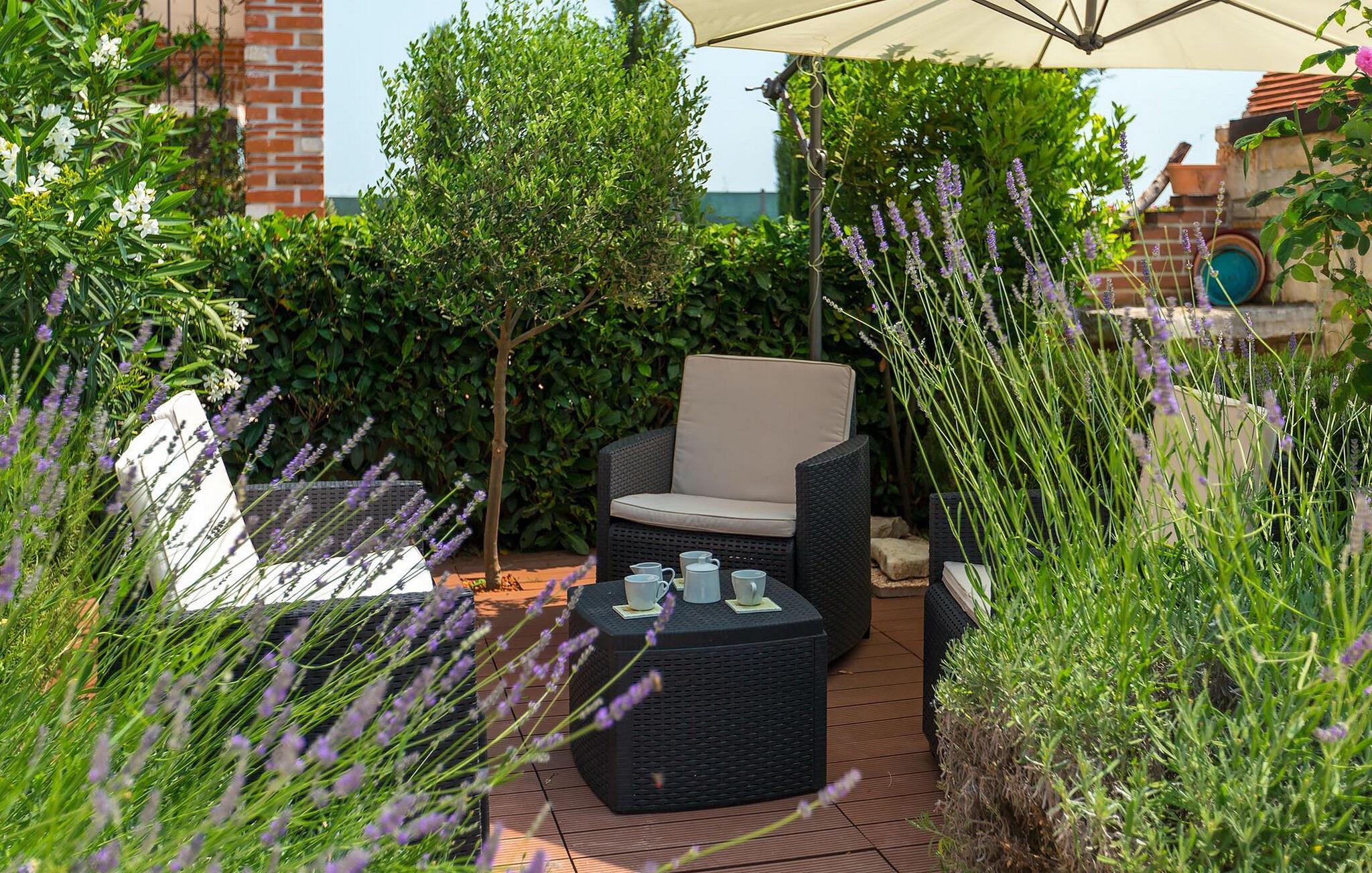 snup en frisk dukkert i poolen, og slap derefter af på liggestolene. Tilbered en saftig bøf eller frisk fisk på murstensgrillen. Tag plads i det hyggelige siddeområde blandt blomstrende lavendel og nyd den afslappende atmosfære i haven. Når aftenen falder på, ledsager et atmosfærisk lysspil jer gennem sommertimerne under åben himmel.