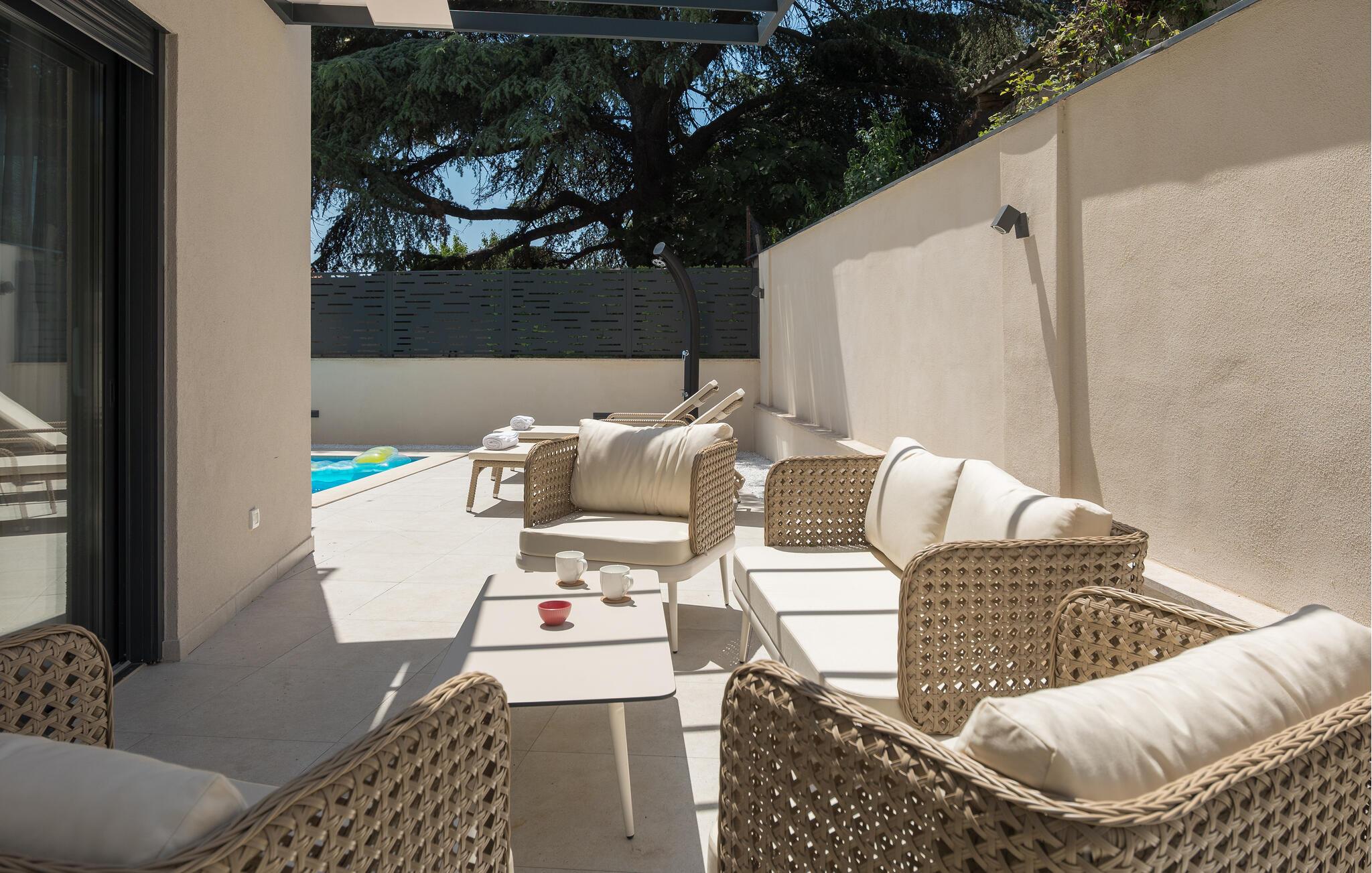 Udenfor venter en solrig oase på jer, helt for jer selv. Snup en frisk dukkert i poolen, slap af på behagelige liggestole, og forkæl jer selv med en solnedgang i den indbydende lounge, inden I tænder op i grillen til en stemningsfuld aften under åben himmel.