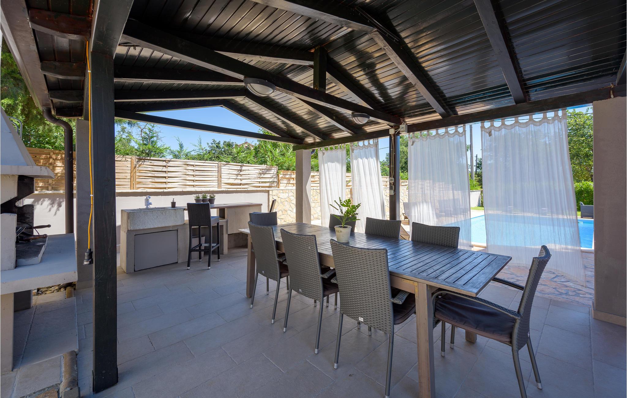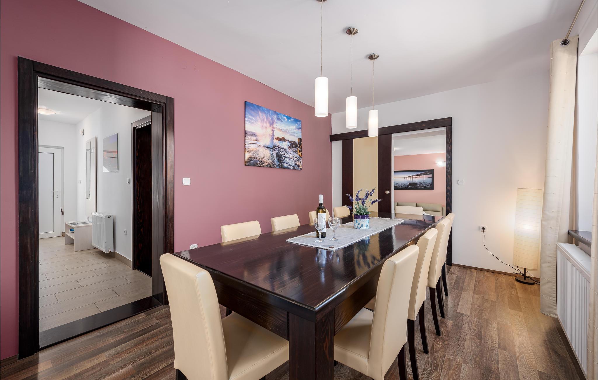 Dette feriehus i Perci fordeler sig på hele tre etager, forbundet med indendørs trapper. Husets moderne indretning, lægger op til en afslappet og komfortabel ferie. På øverste etage ligger et rummeligt soveværelse, med eget køkken og en lille stue, samt terrasse. På den indhegnede grund kan I forfriske jer i poolen på de varme sommerdage. Den overdækkede terrasse indbyder til hyggelige aftner, mens børnene tumler sig og leger i haven. Besøg den historisk interessante by Porec og forkæl jer selv på en af de dejlige restauranter hvor I kan smage regionens traditionelle retter. Er I naturelskere så besøg nationalparken Brijuni og Limski kanalen, her vil I se betagende naturskønhed, husk kameraet.