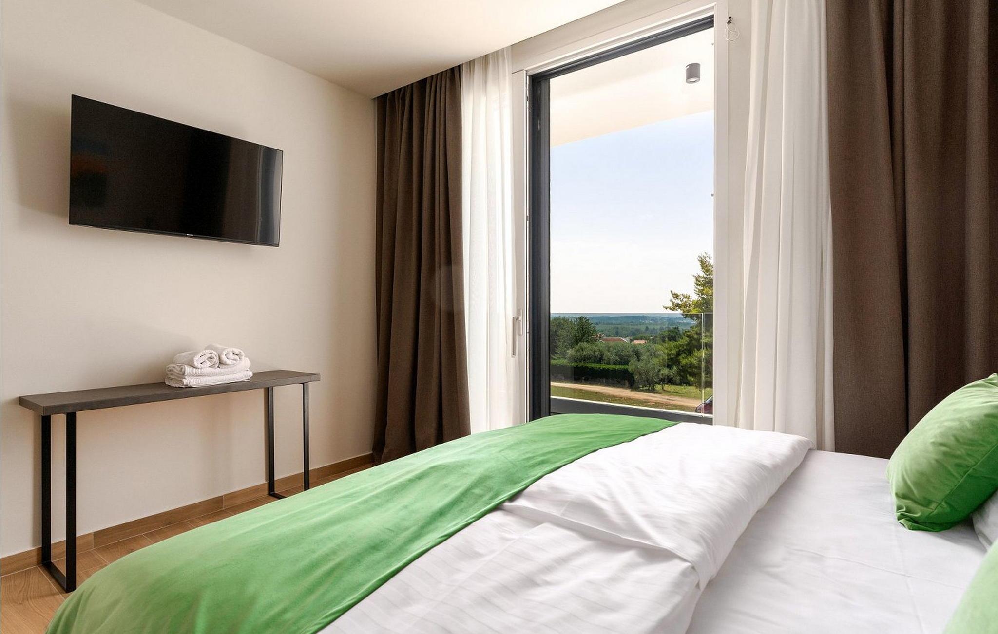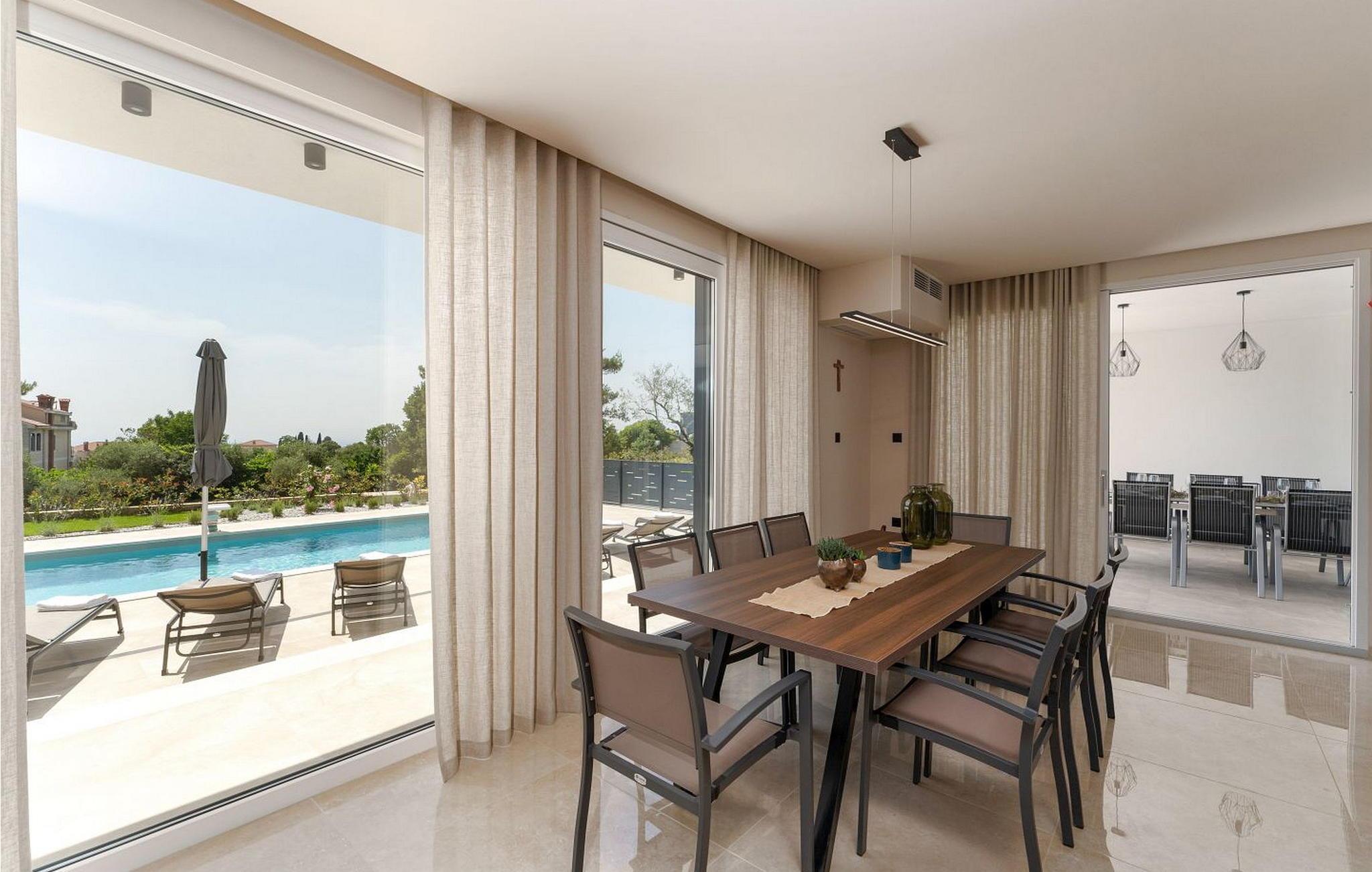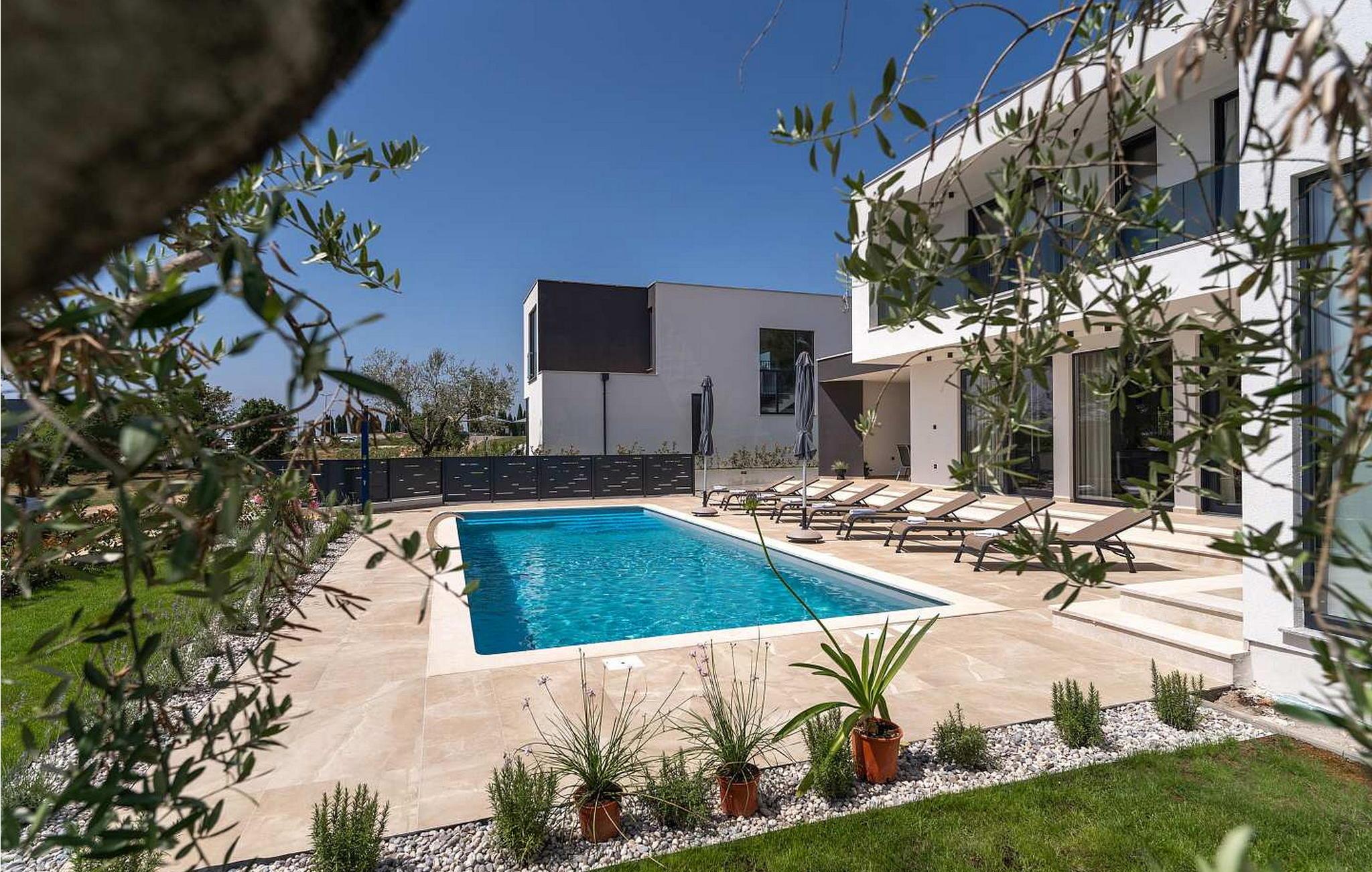 Velkommen til, dit rolige tilflugtssted med panoramaudsigt over havet og en glitrende saltvandspool. Luksusvillaen Gloria ligger i den lille landsby Tar, nær byen Porec, på den Istriske halvøs vestkyst. Denne smukt møblerede oase tilbyder det perfekte tilflugtssted for op til 8 gæster. Kun en kort gåtur fra din hoveddør finder du lokale butikker, en dejlig restaurant, en hyggelig café og de uberørte strande på den nærliggende Lanterna-campingplads. Omgivet af en indhegnet, omhyggeligt vedligeholdt have, inviterer udendørsområdet dig til at slappe af. Slap af ved poolen på en af de otte liggestole, spis al fresco på den overdækkede terrasse eller nyd en hyggelig grill i disse rolige omgivelser. Selve villaen er fordelt på to etager med aircondition og har en rummelig opholdsstue, et fuldt udstyret køkken og en stilfuld spiseplads. Porec Riviera er rig på smukke strande, taverner og restauranter, natklubber og barer. Fritidsentusiaster vil nyde det brede udvalg af sportsmuligheder, mens vinelskere blandt jer vil nyde muligheden for at forkæle din gane med regionens bedste vine. Istrien betragtes med rette som en yderst attraktiv rejsedestination, der fortryller mennesker fra hele verden med sin ekstremt rige kulturarv, historie, talrige monumenter og betagende landskaber og natur. Bemærk venligst, at denne ejendom ikke accepterer ungdomsgrupper eller polterabender. En ungdomsgruppe på denne ejendom består af personer på 26 år eller derunder. Nyd freden og luksusen i Villa Gloria for en uforglemmelig ferieoplevelse.