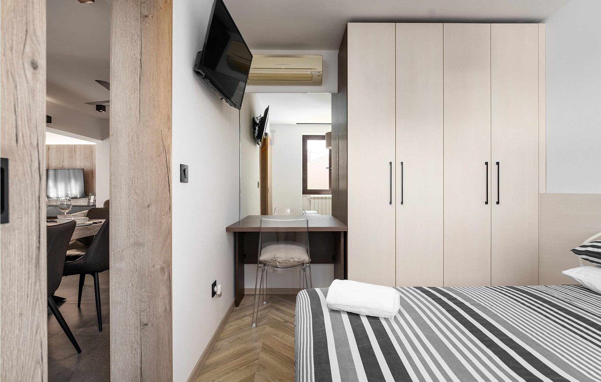 Apartment Larisa er beliggende i et familiehus i centrum af stedet Tar, cirka 10 km fra Porec og 4 km fra turiststedet Lanterna. Stedet Tar ligger halvvejs mellem Novigrad og Porec. Ca. 3 km fra Tar ligger feriestedet Lanterna med smukke stenstrande og sportsfaciliteter. I umiddelbar nærhed er der butik, restaurant, hæveautomat, kaffebarer, apotek og tankstation. På egen lukket grund på 200 kvm har gæsterne brug af en swimmingpool på 25 kvm, terrasse med siddemøbler og spisebord, grill og parkeringsplads til 2 biler. Lejlighed Larisa til 4-6 gæster med et samlet boligareal på 70 kvm ligger på husets første sal. Den består af fuldt udstyret køkken, opholdsstue med sovesofa til to gæster, spiseplads, badeværelse og to soveværelser, hvorfra det ene har adgang til balkonen. Lejligheden er fuldt airconditioneret. BEMÆRK: Gæster har gratis adgang til feriestedet Lanterna under deres ophold. Bemærk venligst, at denne ejendom ikke accepterer ungdomsgrupper eller polterabends. En ungdomsgruppe på denne ejendom er en gruppe bestående af personer på 26 år eller derunder. Book ikke denne ejendom, hvis du er en ungdomsgruppe eller et polterabend, da din reservation vil blive afvist efter booking, hvilket kan omfatte ved ankomst til ejendommen eller under dit ophold, og du vil ikke blive refunderet.