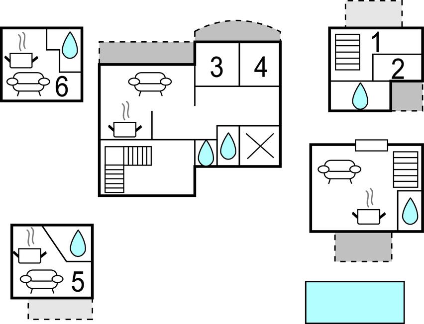 De to huse er ideelle til flere familier eller en stor gruppe venner. Det ene er ideelt til fire personer og har køkken med stue og badeværelse i stueetagen og det andet soveværelse på øverste etage gennem et gennemgangsrum. Det andet hus har tre etager, hver med en boligenhed, der kun kan nås udefra, og udlejeren bor i den anden halvdel af huset. Ovenpå er der en stor lejlighed med soveværelser, køkken, spisestue og badeværelser. En studiolejlighed med tekøkken ligger i stueetagen og mezzaninen.