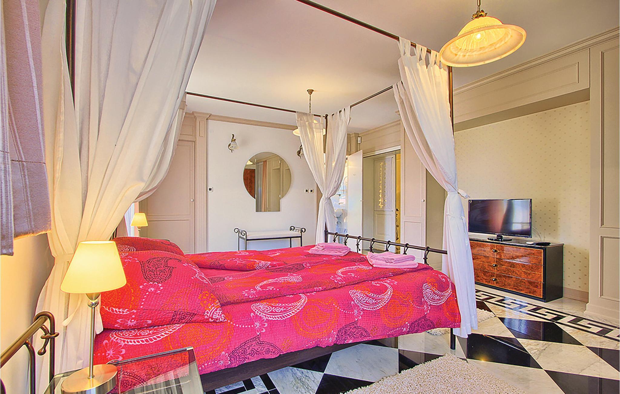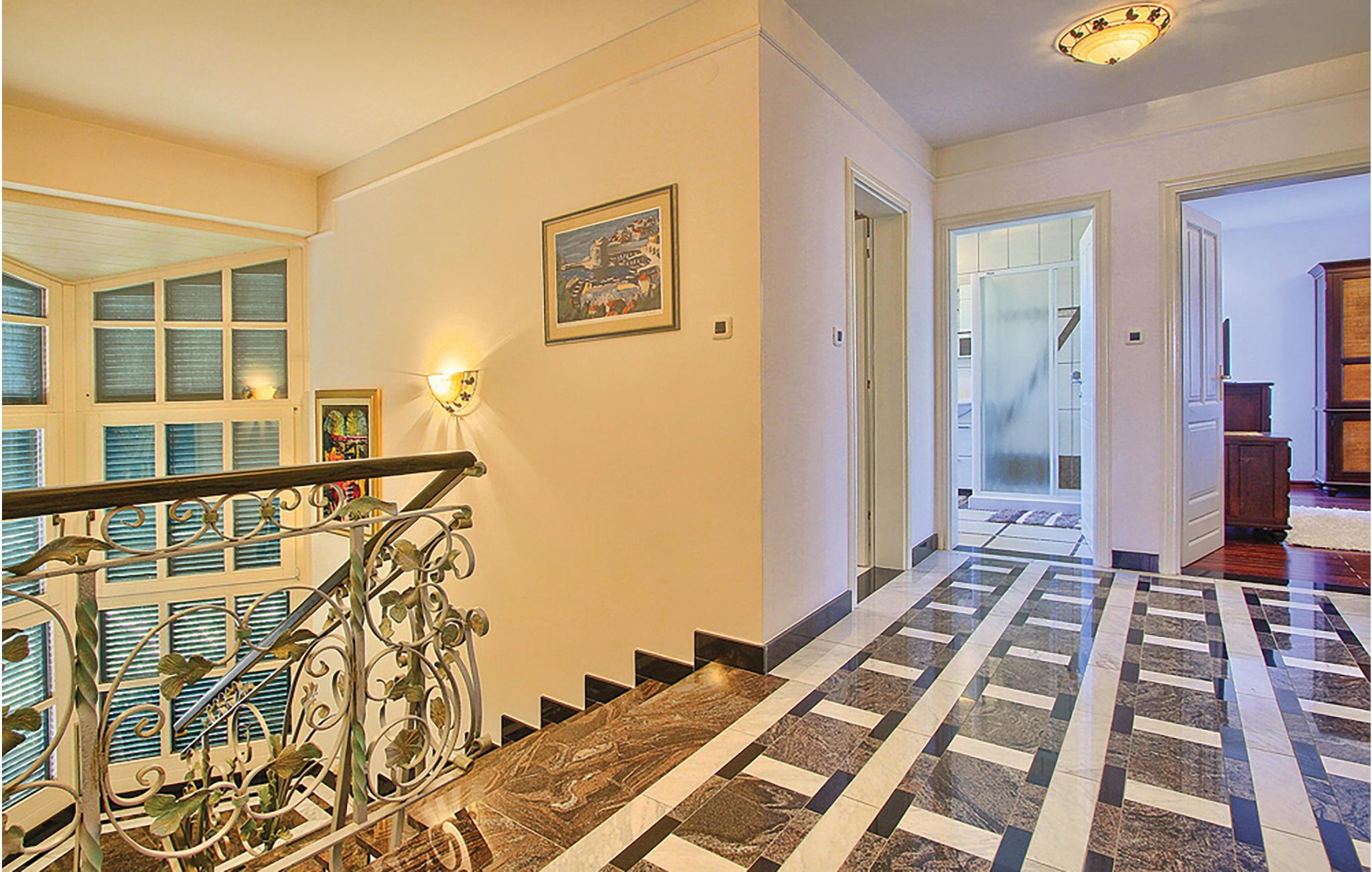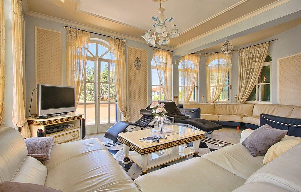 Velkommen til det luksuriøse hjem, der byder jer velkommen i et eksklusivt boligområde. Høje, lyse lokaler, komfortabel indretning, dekorative søjler og velholdte mosaikgulve samt moderne møbler danner rammen om en vellykket pause. Slap af i en elegant stemning, spis sammen ved det lange spisebord og sæt jer godt til rette i sofaen efter en begivenhedsrig dag, måske med en god film.