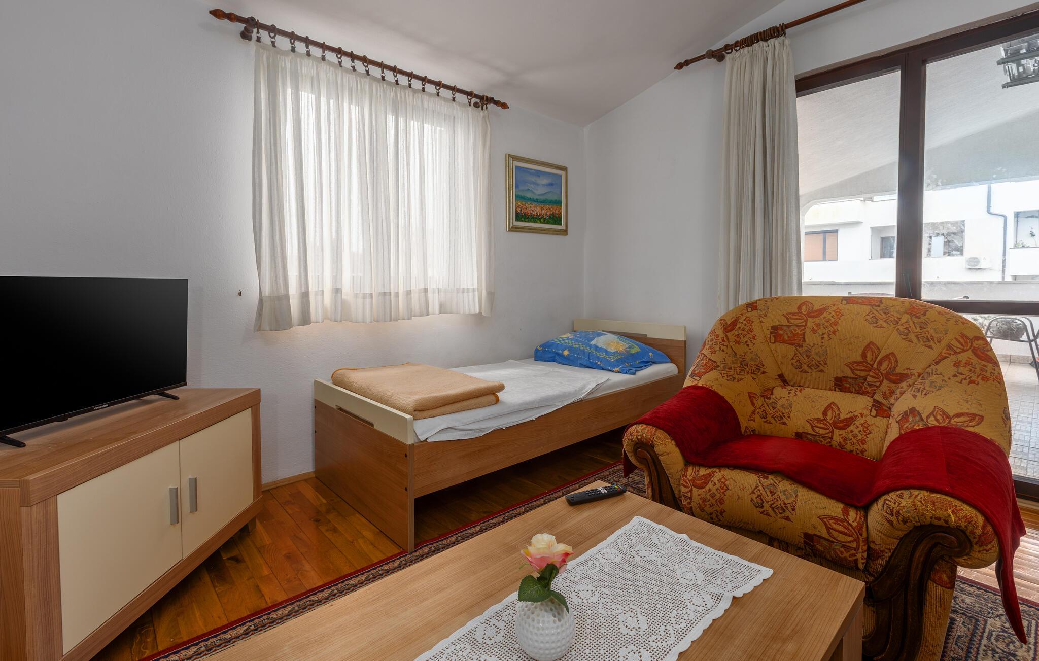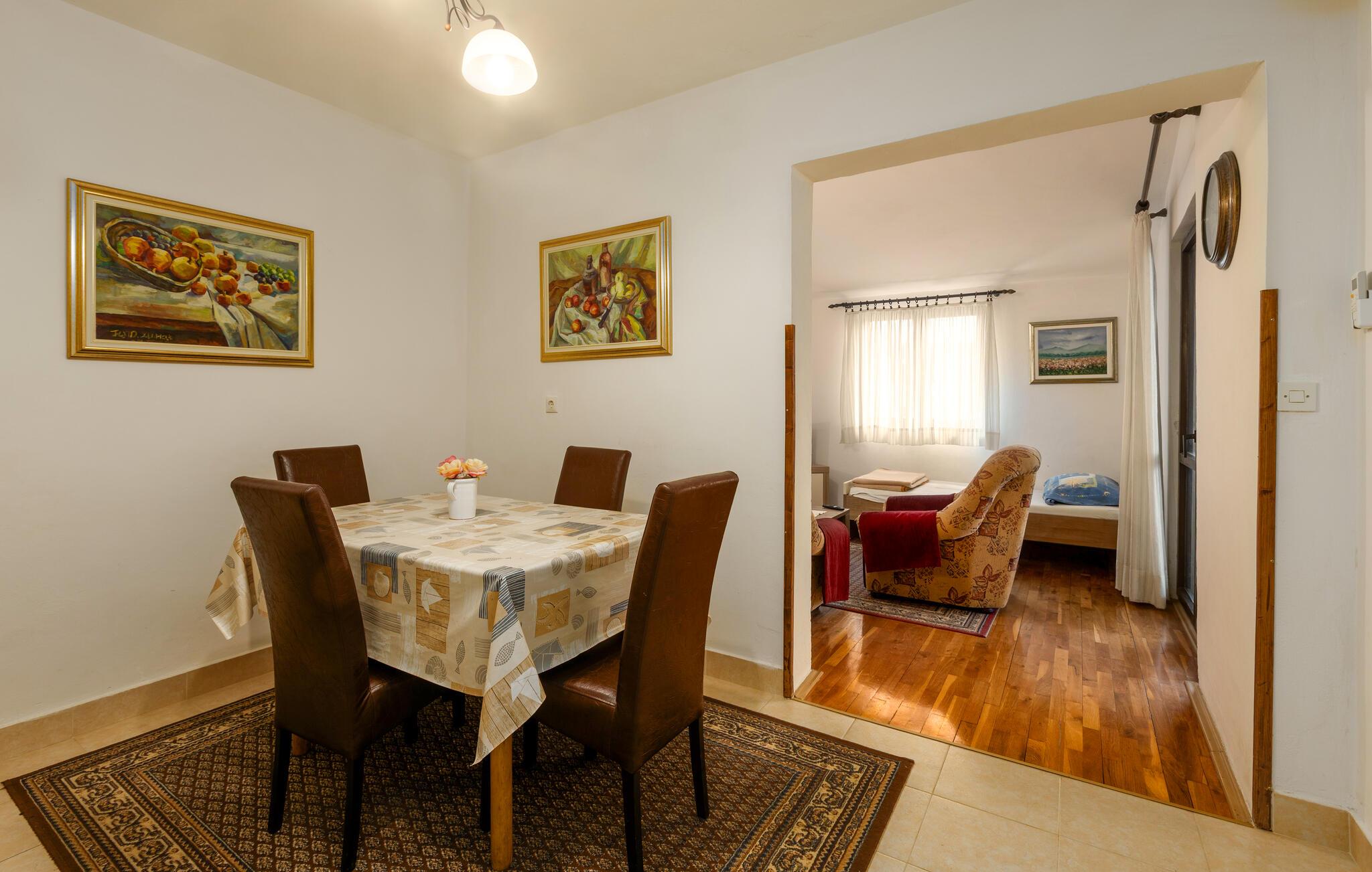 Denne praktisk indrettede lejlighed tilbyder jer et komfortabelt tilflugtssted, perfekt til at kombinere en strandferie med spændende udflugter. Tilbered lækre retter og planlæg jeres aktiviteter i ro og mag. Efter en lang dag kan I slappe af i stuen, være vært for en spilleaften eller fordybe jer i jeres ferielæsning.