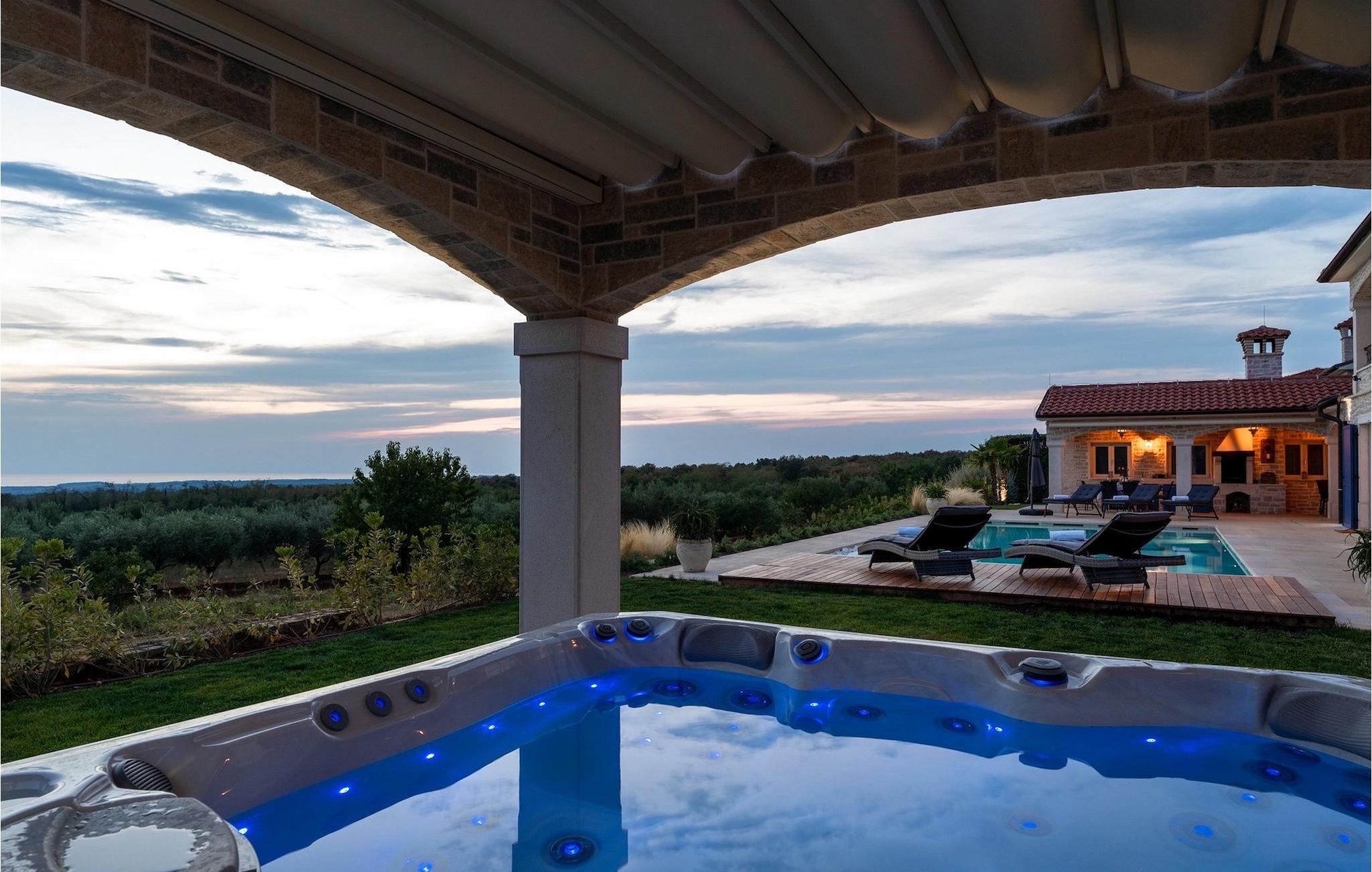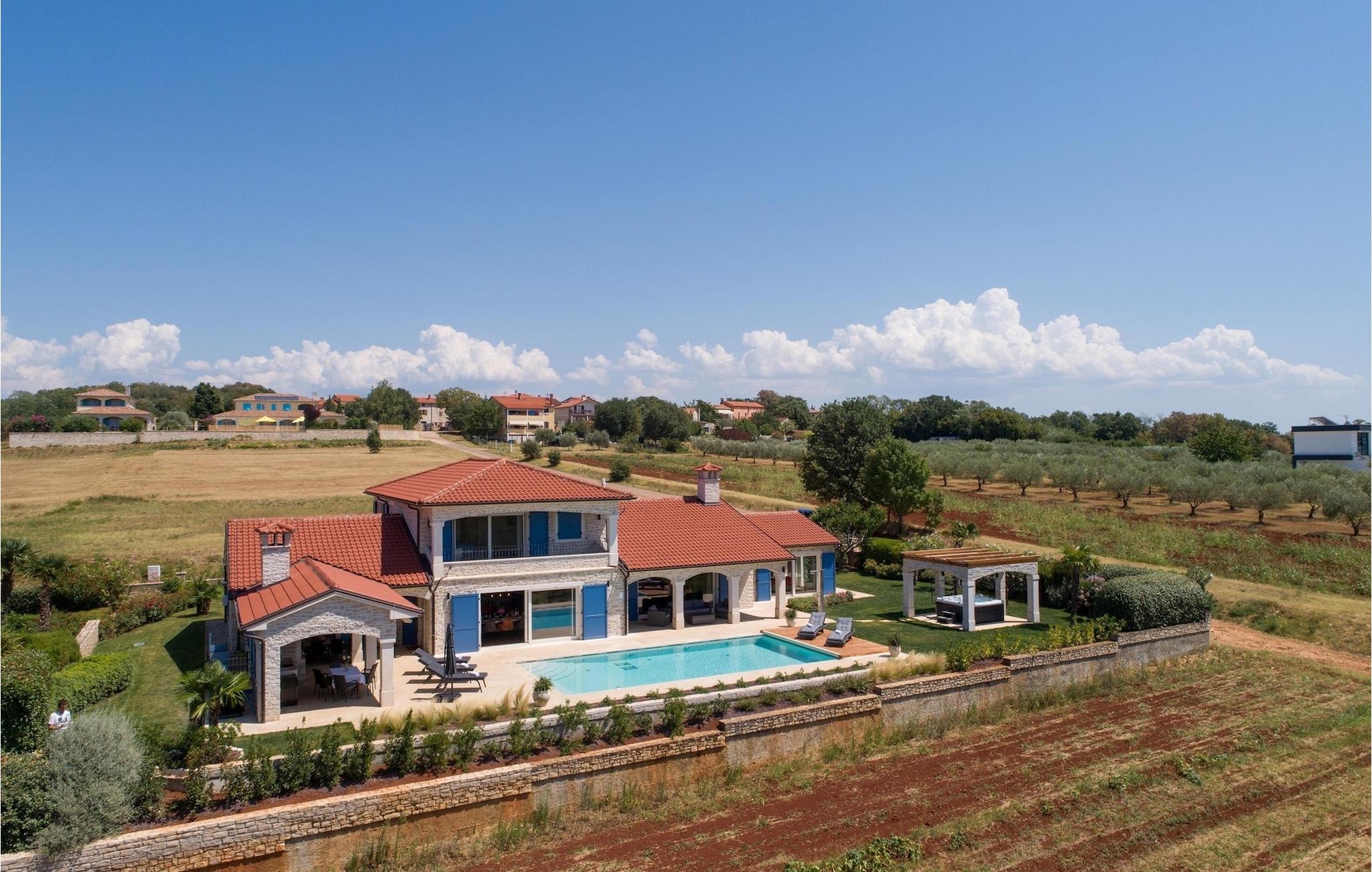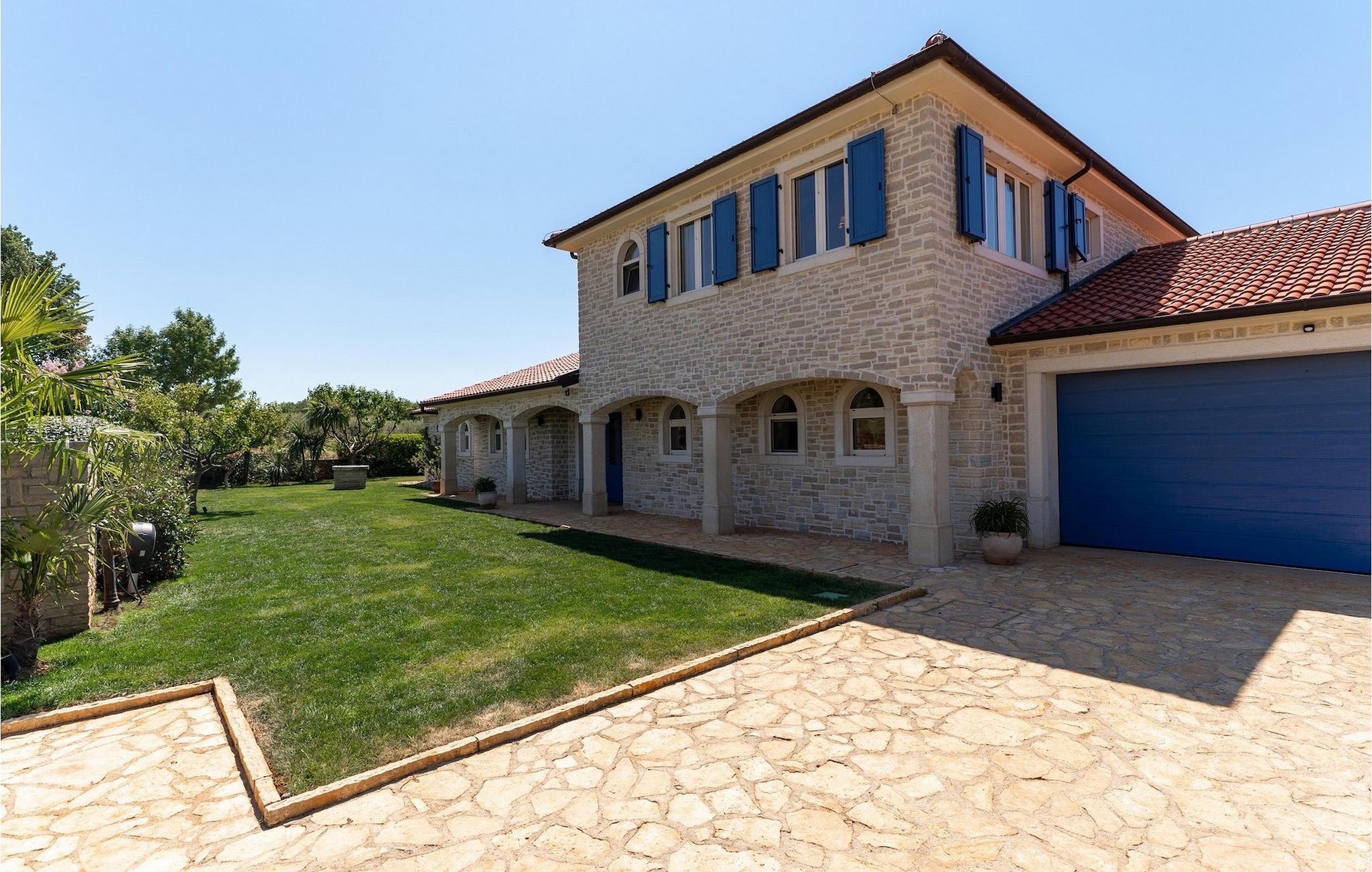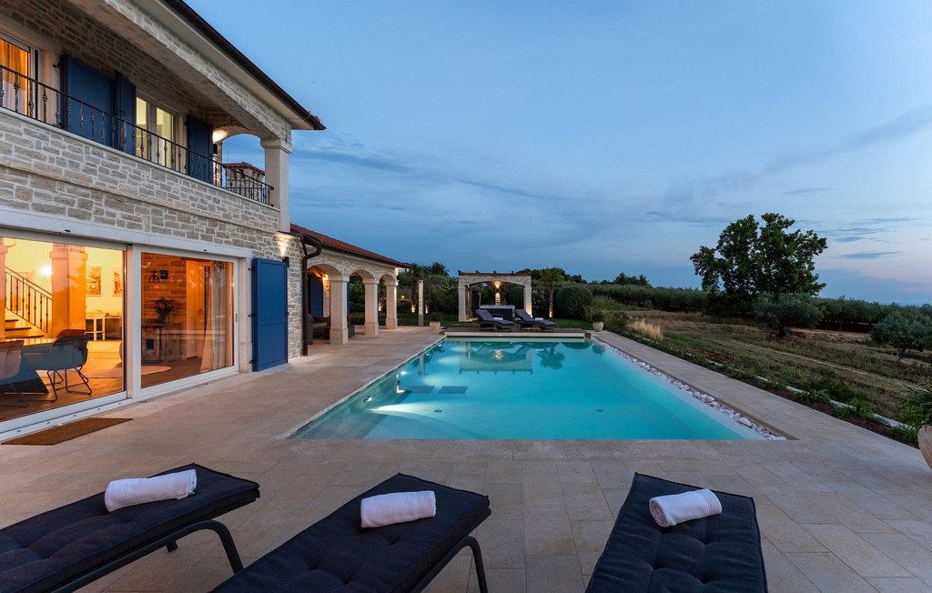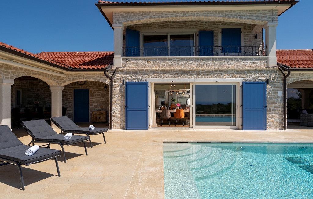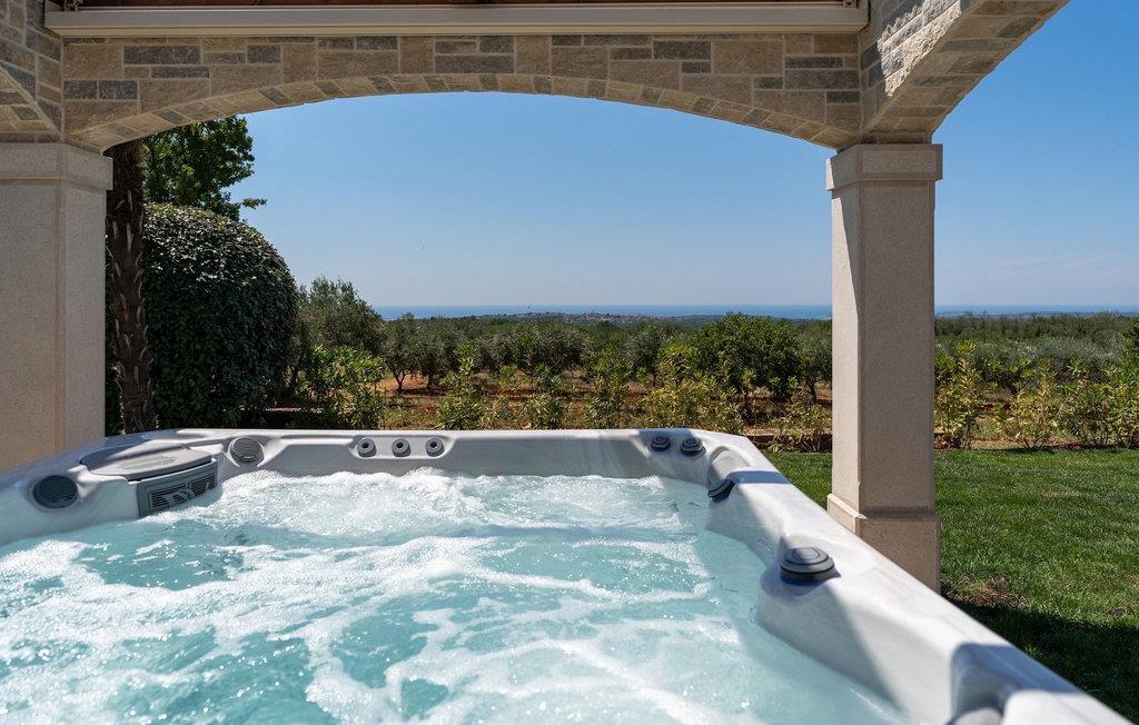 Denne smukke villa er beliggende nær Porec, i en lille landsby, som er 10 km væk fra havet og byens centrum. Villaen er bygget med sten og gode kvalitetsmaterialer, og den har en størrelse på 354m2, med 265m2 i stueetagen og 89m2 på første sal. Denne ejendom er beliggende på en 1.400m2 grund bestående af en velholdt have og eng. Ved siden af huset er der en garage på 58m2 til 2 køretøjer. Stueetagen har en stor stue med pejs, spisestue, køkken, spisekammer og 2 soveværelser med badeværelser (et af soveværelserne er placeret ved siden af køkkenet og det har en komfortabel sovesofa til 2 personer). Første sal har to soveværelser med ensuite badeværelser. Fra stuen har gæsterne let adgang til poolområdet og 40m2 privat swimmingpool. Soveværelserne ovenpå og poolområdet har en betagende havudsigt, så du kan nyde at svømme med udsigt til olivenlunde og Middelhavet. Udendørs kan du også slappe af i jacuzzien, som er tilgængelig på anmodning mod et ekstra gebyr. Denne ejendom er perfekt beliggende i fredelige olivenlunde og omkringliggende vinmarker, hvilket gør det til et perfekt tilflugtssted fra det hektiske moderne liv. Villaen er beliggende i udkanten af en lille landsby, der tilbyder fred og privatliv til familieferier, og alligevel er det kun 10-15 minutters kørsel fra den istriske juvel - Porec. Porec er det største turisthotspot i Istrien, hvor du vil finde alle slags aktiviteter, bemærkelsesværdige oplevelser og rig kulturarv. Det har 100 års erfaring inden for gæstfrihed og turisme. Sørg for ikke at gå glip af de mange fester, der arrangeres i turistlandsbyer og byens centrum. Der er strandklubber, kaffebarer, og efter midnat kan du nyde den behagelige atmosfære på natbarer og diskoteker. Intet andet end sjov fra solnedgang til solopgang! En bil anbefales. Temperaturen i den opvarmede swimmingpool er afhængig af eksterne faktorer, herunder vejrforhold, og som sådan kan temperaturen på vandet ikke garanteres.