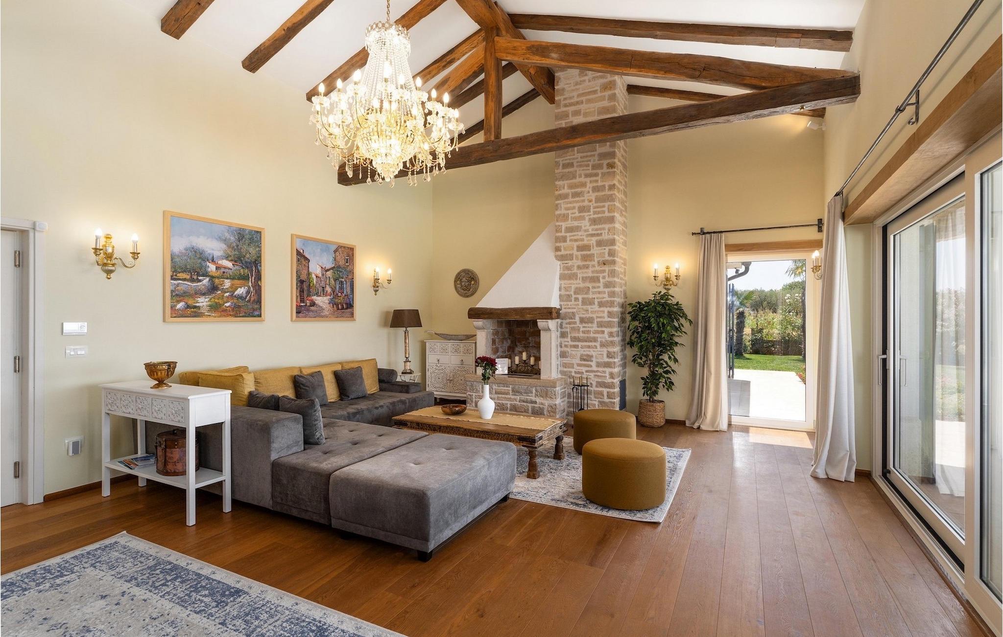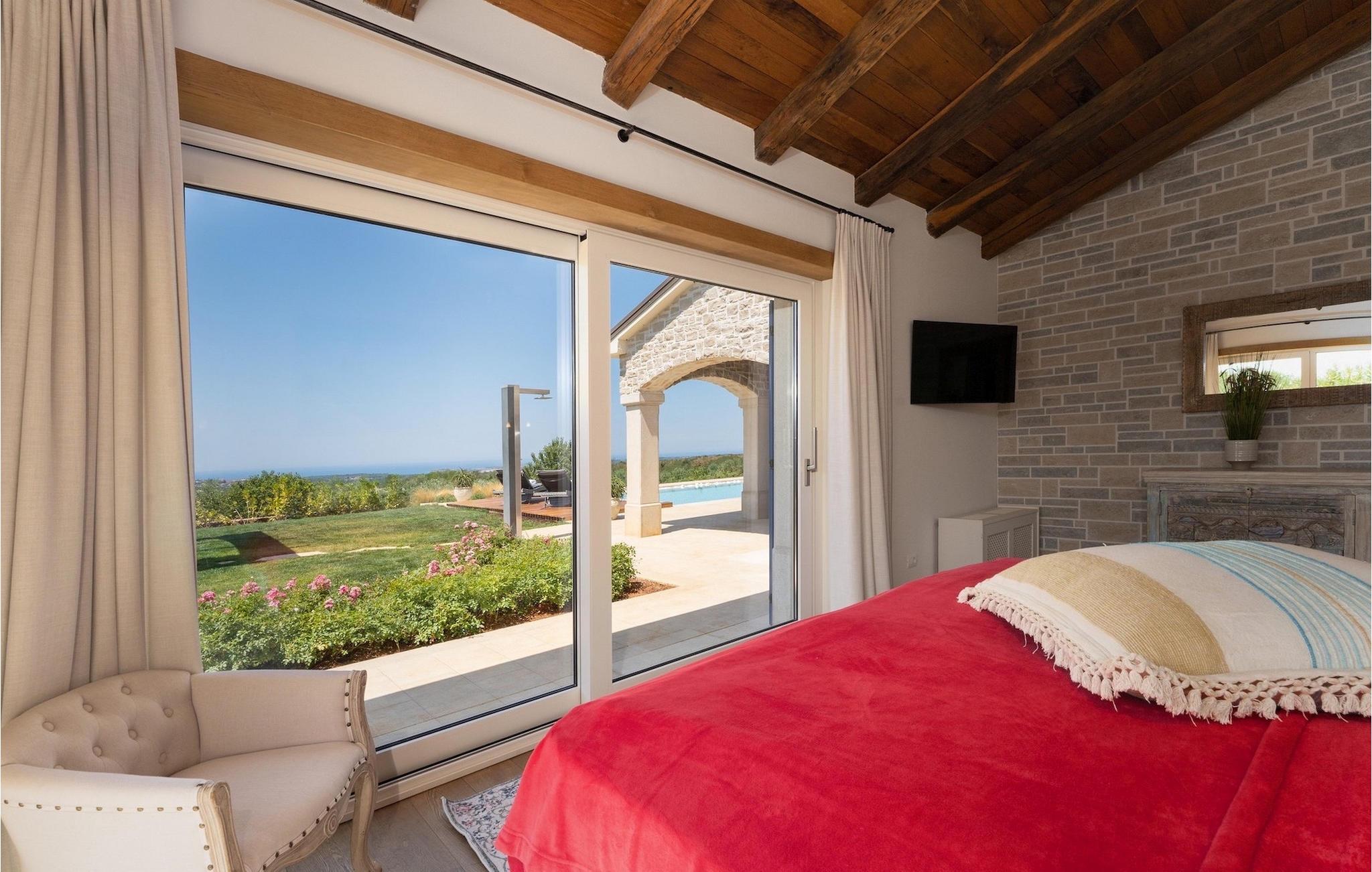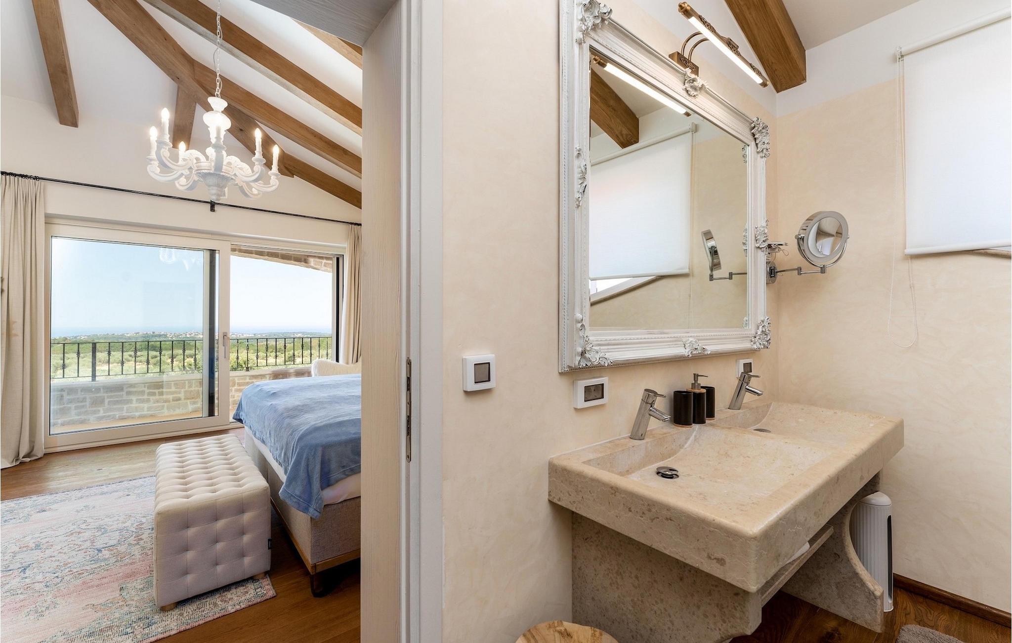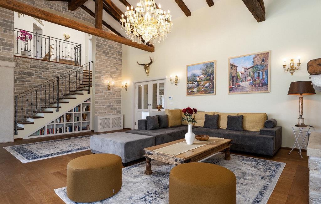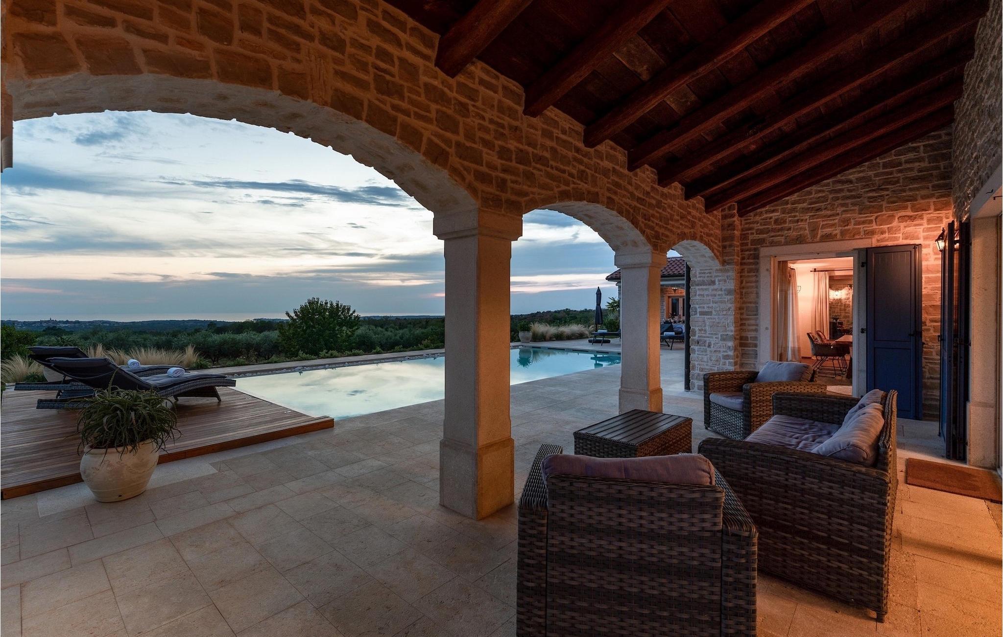 Denne smukke villa er beliggende nær Porec, i en lille landsby, som er 10 km væk fra havet og byens centrum. Villaen er bygget med sten og gode kvalitetsmaterialer, og den har en størrelse på 354m2, med 265m2 i stueetagen og 89m2 på første sal. Denne ejendom er beliggende på en 1.400m2 grund bestående af en velholdt have og eng. Ved siden af huset er der en garage på 58m2 til 2 køretøjer. Stueetagen har en stor stue med pejs, spisestue, køkken, spisekammer og 2 soveværelser med badeværelser (et af soveværelserne er placeret ved siden af køkkenet og det har en komfortabel sovesofa til 2 personer). Første sal har to soveværelser med ensuite badeværelser. Fra stuen har gæsterne let adgang til poolområdet og 40m2 privat swimmingpool. Soveværelserne ovenpå og poolområdet har en betagende havudsigt, så du kan nyde at svømme med udsigt til olivenlunde og Middelhavet. Udendørs kan du også slappe af i jacuzzien, som er tilgængelig på anmodning mod et ekstra gebyr. Denne ejendom er perfekt beliggende i fredelige olivenlunde og omkringliggende vinmarker, hvilket gør det til et perfekt tilflugtssted fra det hektiske moderne liv. Villaen er beliggende i udkanten af en lille landsby, der tilbyder fred og privatliv til familieferier, og alligevel er det kun 10-15 minutters kørsel fra den istriske juvel - Porec. Porec er det største turisthotspot i Istrien, hvor du vil finde alle slags aktiviteter, bemærkelsesværdige oplevelser og rig kulturarv. Det har 100 års erfaring inden for gæstfrihed og turisme. Sørg for ikke at gå glip af de mange fester, der arrangeres i turistlandsbyer og byens centrum. Der er strandklubber, kaffebarer, og efter midnat kan du nyde den behagelige atmosfære på natbarer og diskoteker. Intet andet end sjov fra solnedgang til solopgang! En bil anbefales. Temperaturen i den opvarmede swimmingpool er afhængig af eksterne faktorer, herunder vejrforhold, og som sådan kan temperaturen på vandet ikke garanteres.