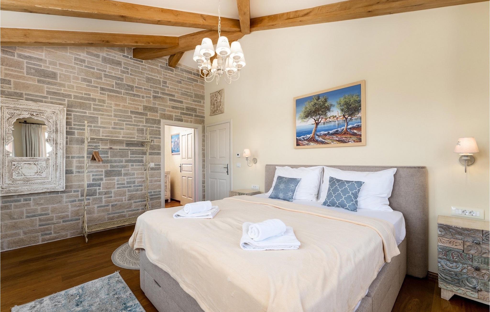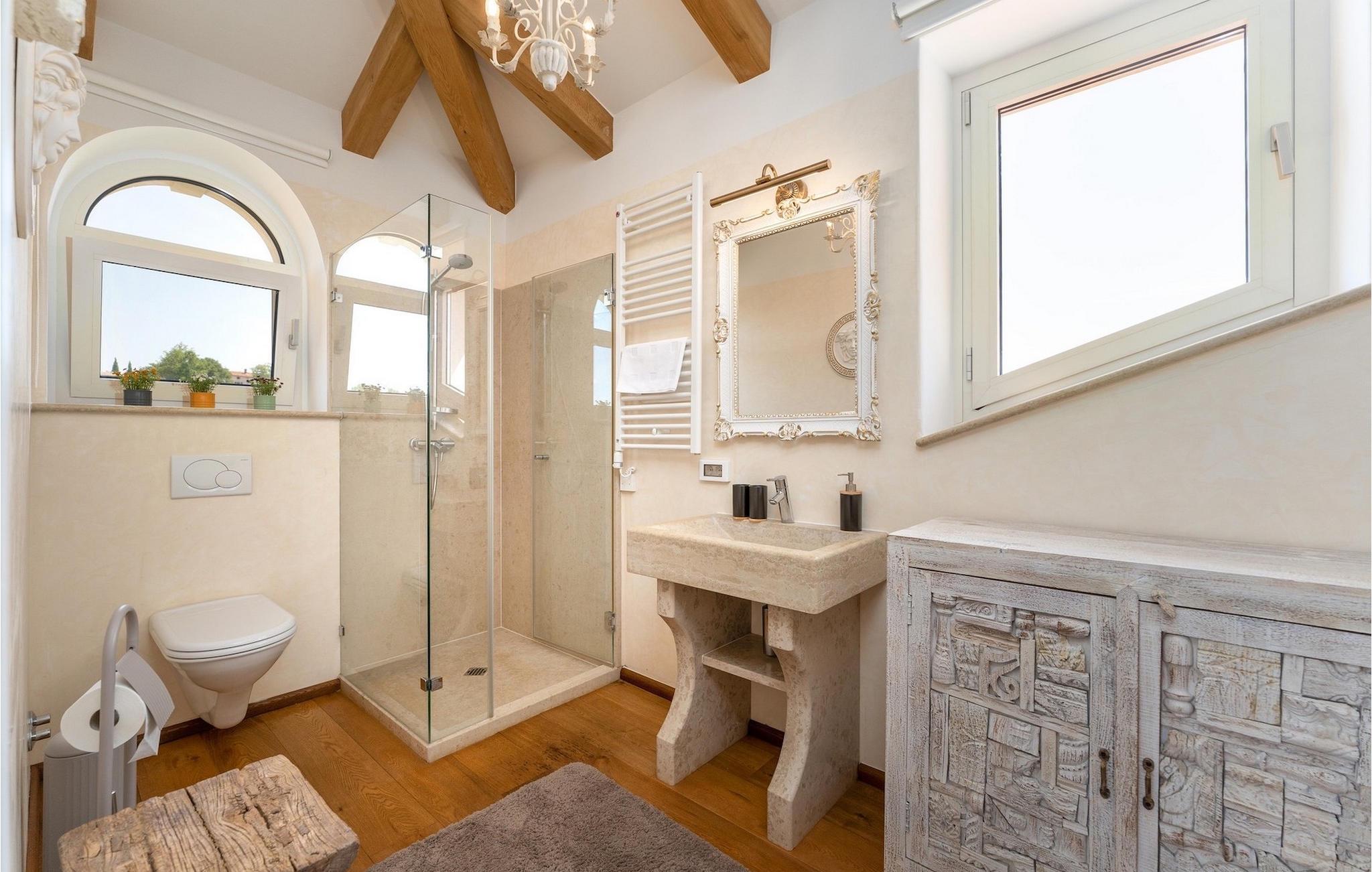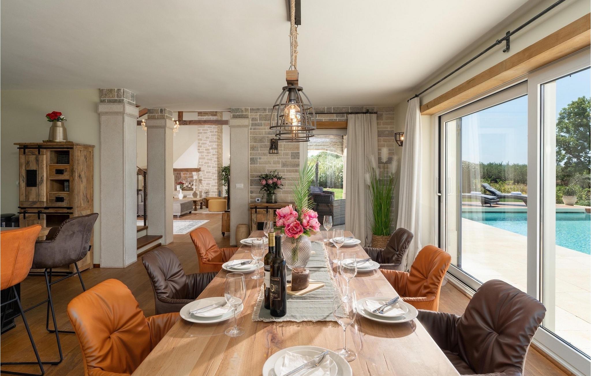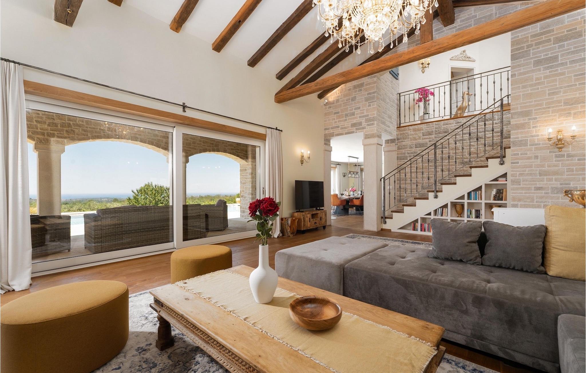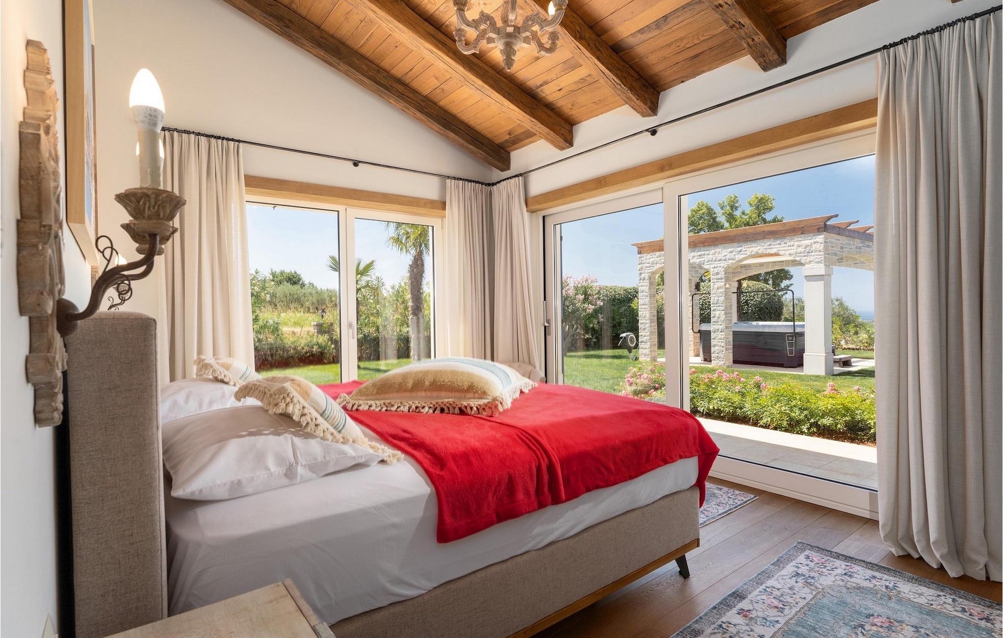 Denne smukke villa er beliggende nær Porec, i en lille landsby, som er 10 km væk fra havet og byens centrum. Villaen er bygget med sten og gode kvalitetsmaterialer, og den har en størrelse på 354m2, med 265m2 i stueetagen og 89m2 på første sal. Denne ejendom er beliggende på en 1.400m2 grund bestående af en velholdt have og eng. Ved siden af huset er der en garage på 58m2 til 2 køretøjer. Stueetagen har en stor stue med pejs, spisestue, køkken, spisekammer og 2 soveværelser med badeværelser (et af soveværelserne er placeret ved siden af køkkenet og det har en komfortabel sovesofa til 2 personer). Første sal har to soveværelser med ensuite badeværelser. Fra stuen har gæsterne let adgang til poolområdet og 40m2 privat swimmingpool. Soveværelserne ovenpå og poolområdet har en betagende havudsigt, så du kan nyde at svømme med udsigt til olivenlunde og Middelhavet. Udendørs kan du også slappe af i jacuzzien, som er tilgængelig på anmodning mod et ekstra gebyr. Denne ejendom er perfekt beliggende i fredelige olivenlunde og omkringliggende vinmarker, hvilket gør det til et perfekt tilflugtssted fra det hektiske moderne liv. Villaen er beliggende i udkanten af en lille landsby, der tilbyder fred og privatliv til familieferier, og alligevel er det kun 10-15 minutters kørsel fra den istriske juvel - Porec. Porec er det største turisthotspot i Istrien, hvor du vil finde alle slags aktiviteter, bemærkelsesværdige oplevelser og rig kulturarv. Det har 100 års erfaring inden for gæstfrihed og turisme. Sørg for ikke at gå glip af de mange fester, der arrangeres i turistlandsbyer og byens centrum. Der er strandklubber, kaffebarer, og efter midnat kan du nyde den behagelige atmosfære på natbarer og diskoteker. Intet andet end sjov fra solnedgang til solopgang! En bil anbefales. Temperaturen i den opvarmede swimmingpool er afhængig af eksterne faktorer, herunder vejrforhold, og som sådan kan temperaturen på vandet ikke garanteres.