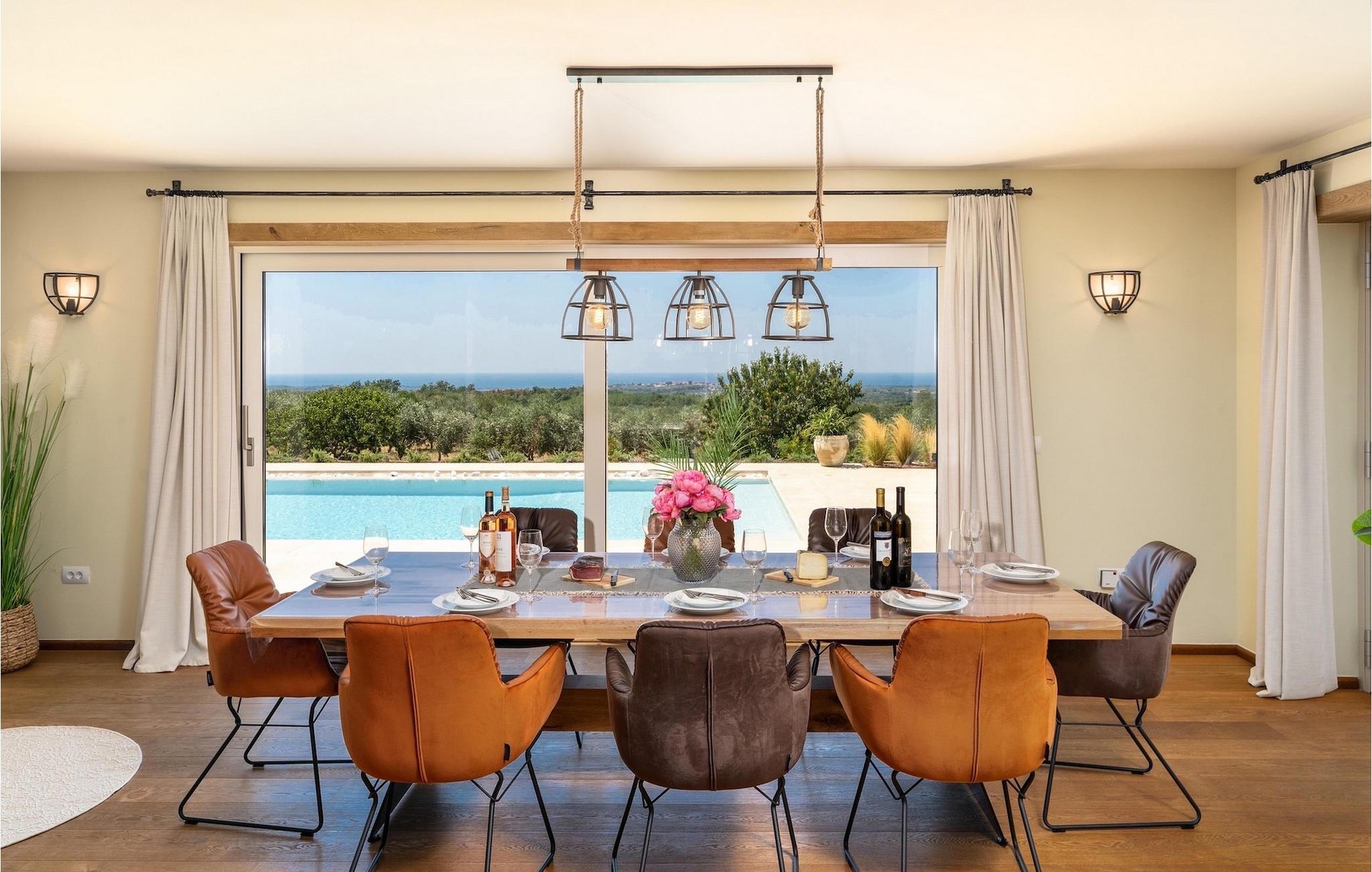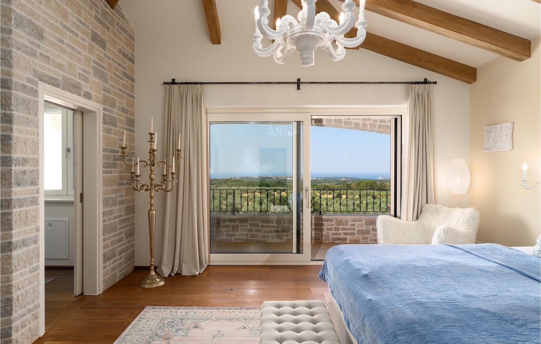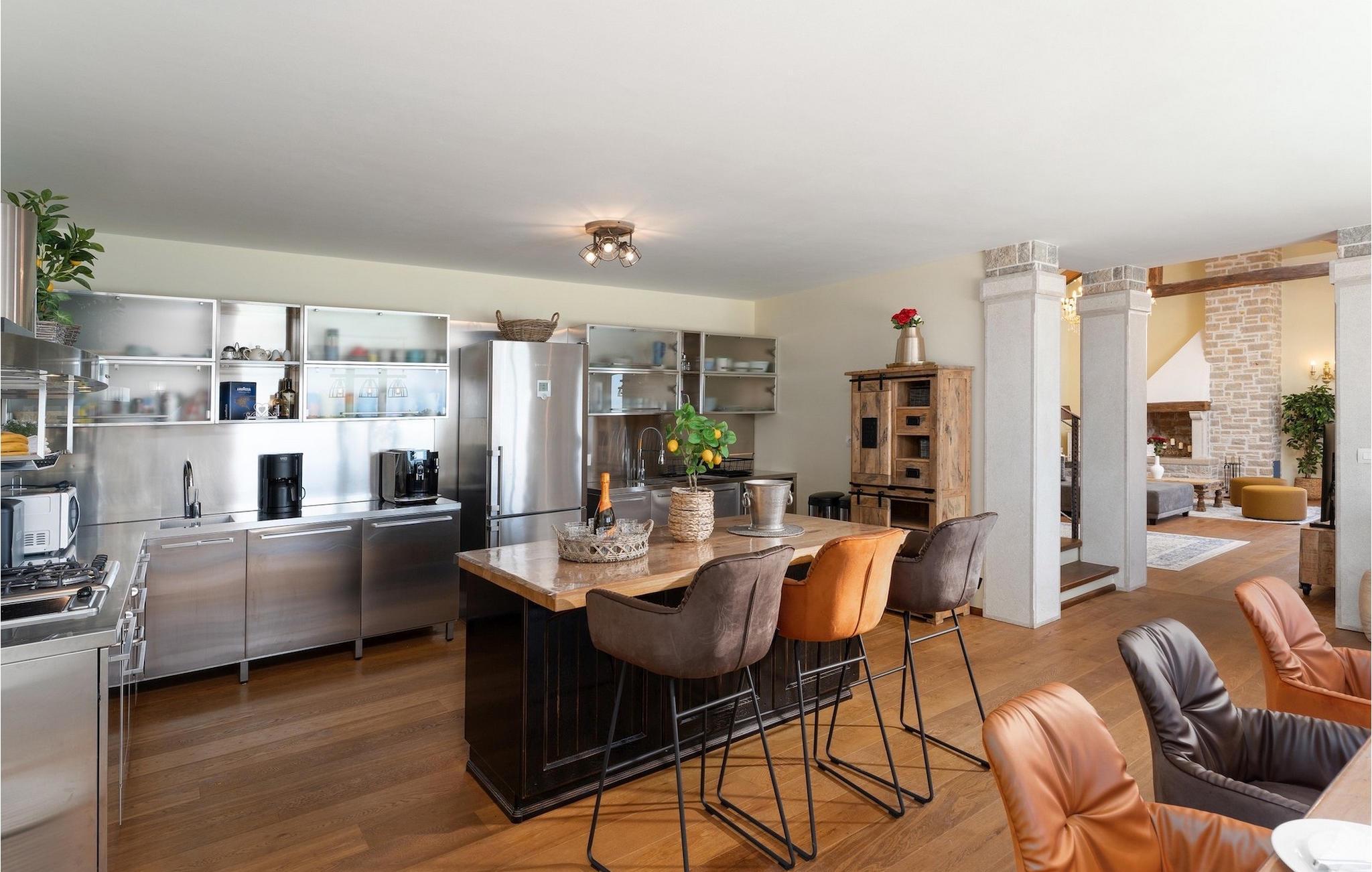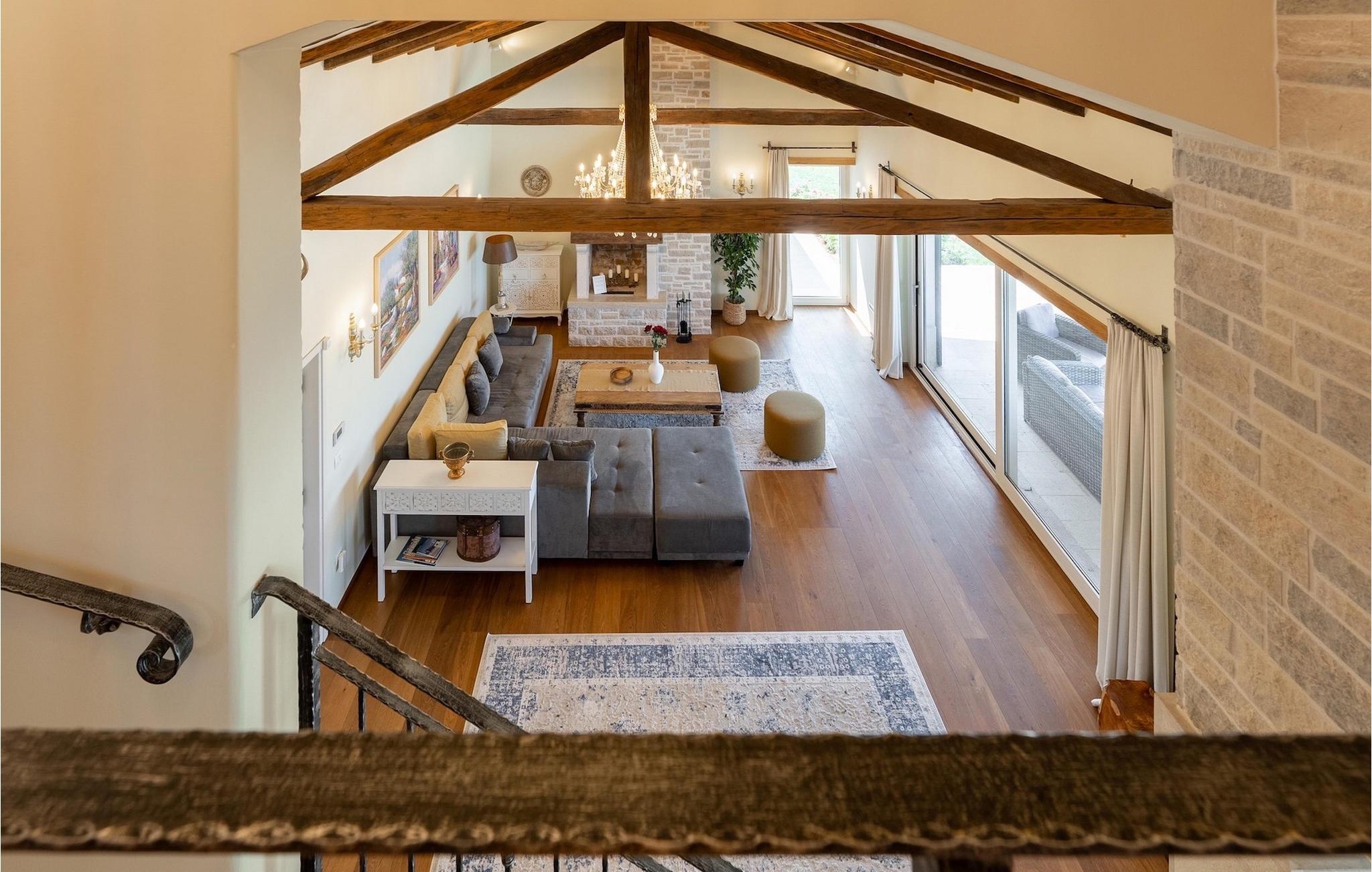 Denne smukke villa er beliggende nær Porec, i en lille landsby, som er 10 km væk fra havet og byens centrum. Villaen er bygget med sten og gode kvalitetsmaterialer, og den har en størrelse på 354m2, med 265m2 i stueetagen og 89m2 på første sal. Denne ejendom er beliggende på en 1.400m2 grund bestående af en velholdt have og eng. Ved siden af huset er der en garage på 58m2 til 2 køretøjer. Stueetagen har en stor stue med pejs, spisestue, køkken, spisekammer og 2 soveværelser med badeværelser (et af soveværelserne er placeret ved siden af køkkenet og det har en komfortabel sovesofa til 2 personer). Første sal har to soveværelser med ensuite badeværelser. Fra stuen har gæsterne let adgang til poolområdet og 40m2 privat swimmingpool. Soveværelserne ovenpå og poolområdet har en betagende havudsigt, så du kan nyde at svømme med udsigt til olivenlunde og Middelhavet. Udendørs kan du også slappe af i jacuzzien, som er tilgængelig på anmodning mod et ekstra gebyr. Denne ejendom er perfekt beliggende i fredelige olivenlunde og omkringliggende vinmarker, hvilket gør det til et perfekt tilflugtssted fra det hektiske moderne liv. Villaen er beliggende i udkanten af en lille landsby, der tilbyder fred og privatliv til familieferier, og alligevel er det kun 10-15 minutters kørsel fra den istriske juvel - Porec. Porec er det største turisthotspot i Istrien, hvor du vil finde alle slags aktiviteter, bemærkelsesværdige oplevelser og rig kulturarv. Det har 100 års erfaring inden for gæstfrihed og turisme. Sørg for ikke at gå glip af de mange fester, der arrangeres i turistlandsbyer og byens centrum. Der er strandklubber, kaffebarer, og efter midnat kan du nyde den behagelige atmosfære på natbarer og diskoteker. Intet andet end sjov fra solnedgang til solopgang! En bil anbefales. Temperaturen i den opvarmede swimmingpool er afhængig af eksterne faktorer, herunder vejrforhold, og som sådan kan temperaturen på vandet ikke garanteres.