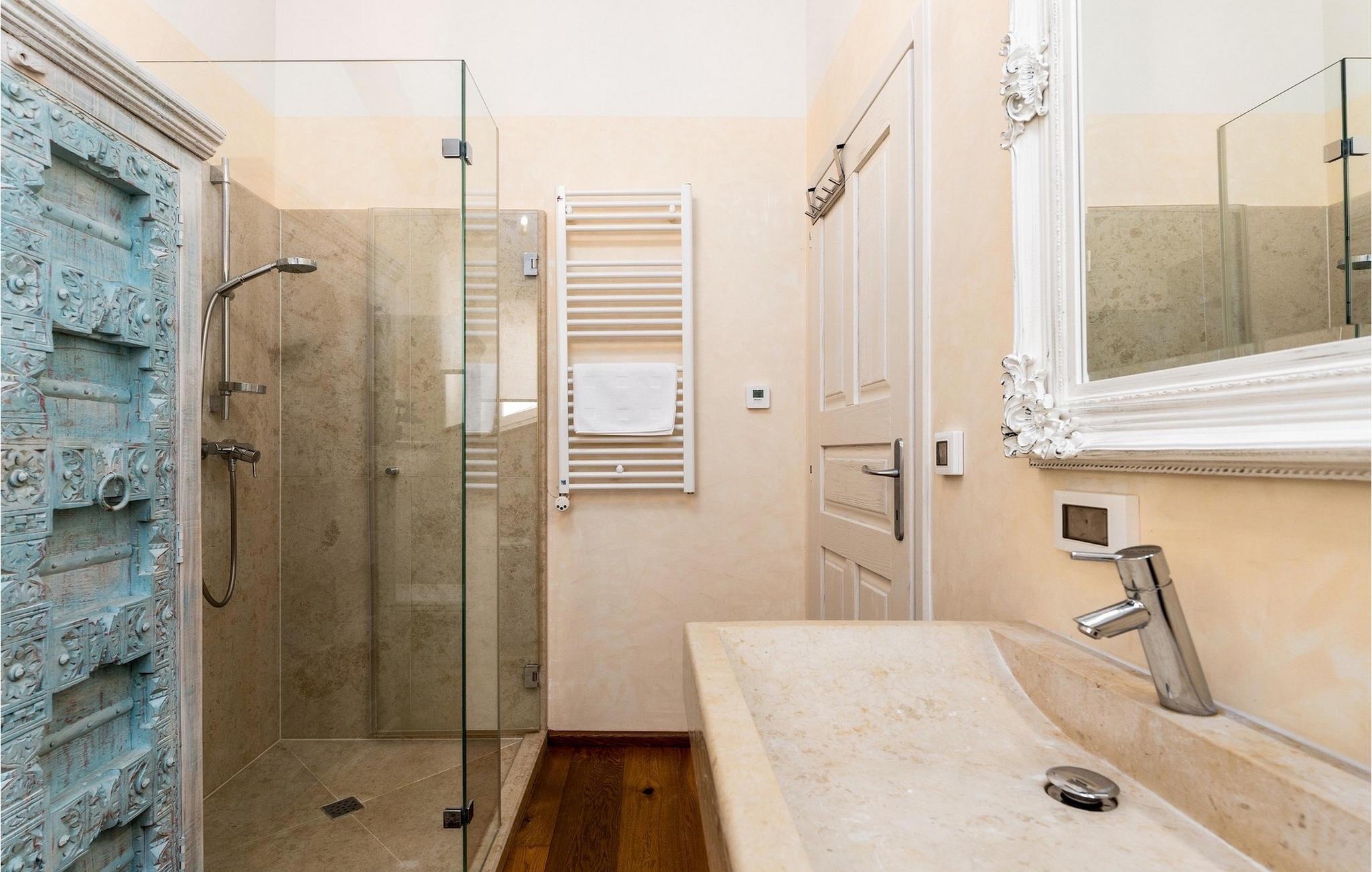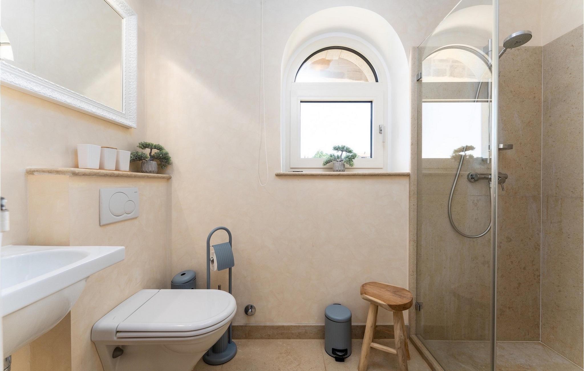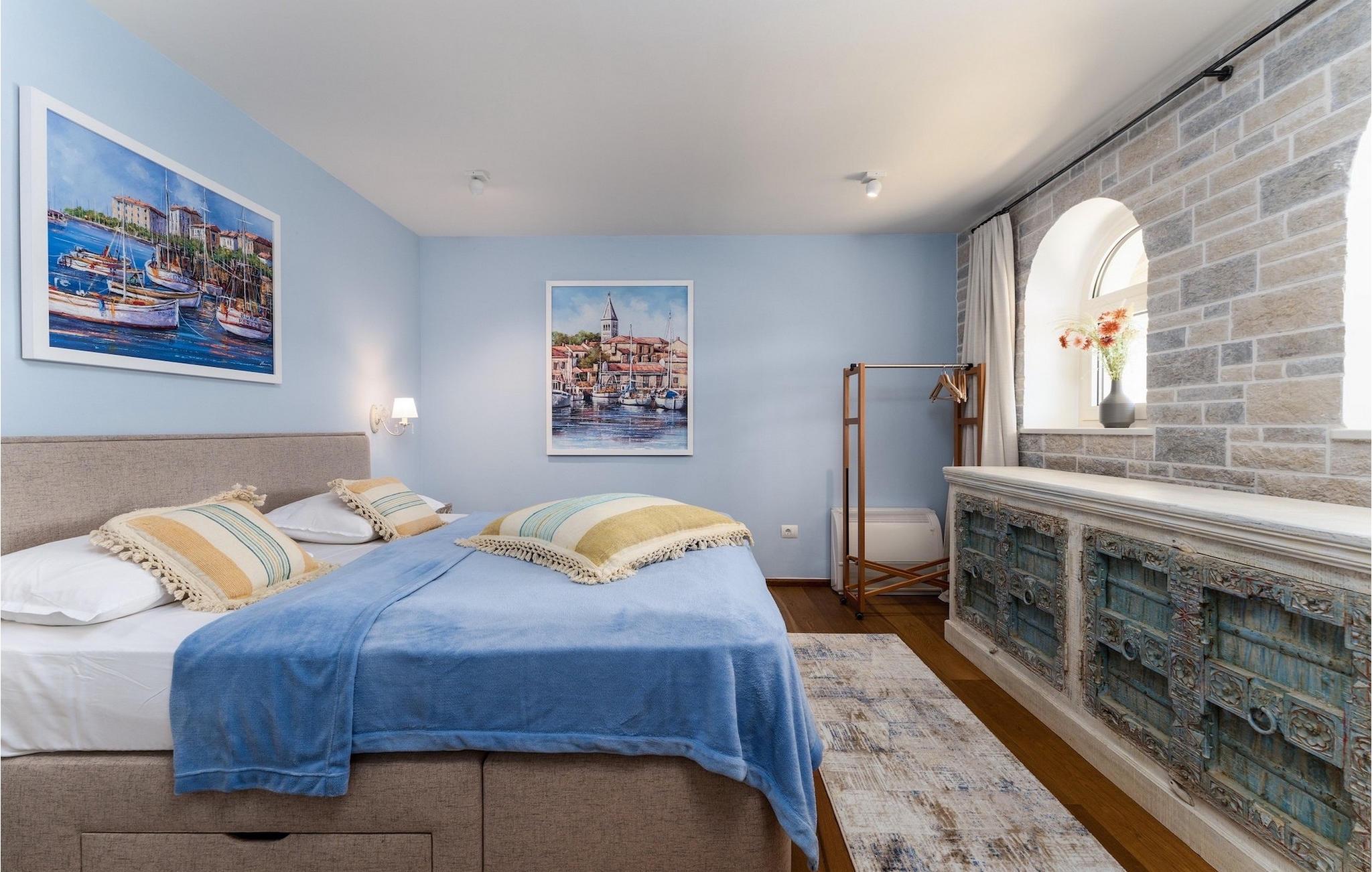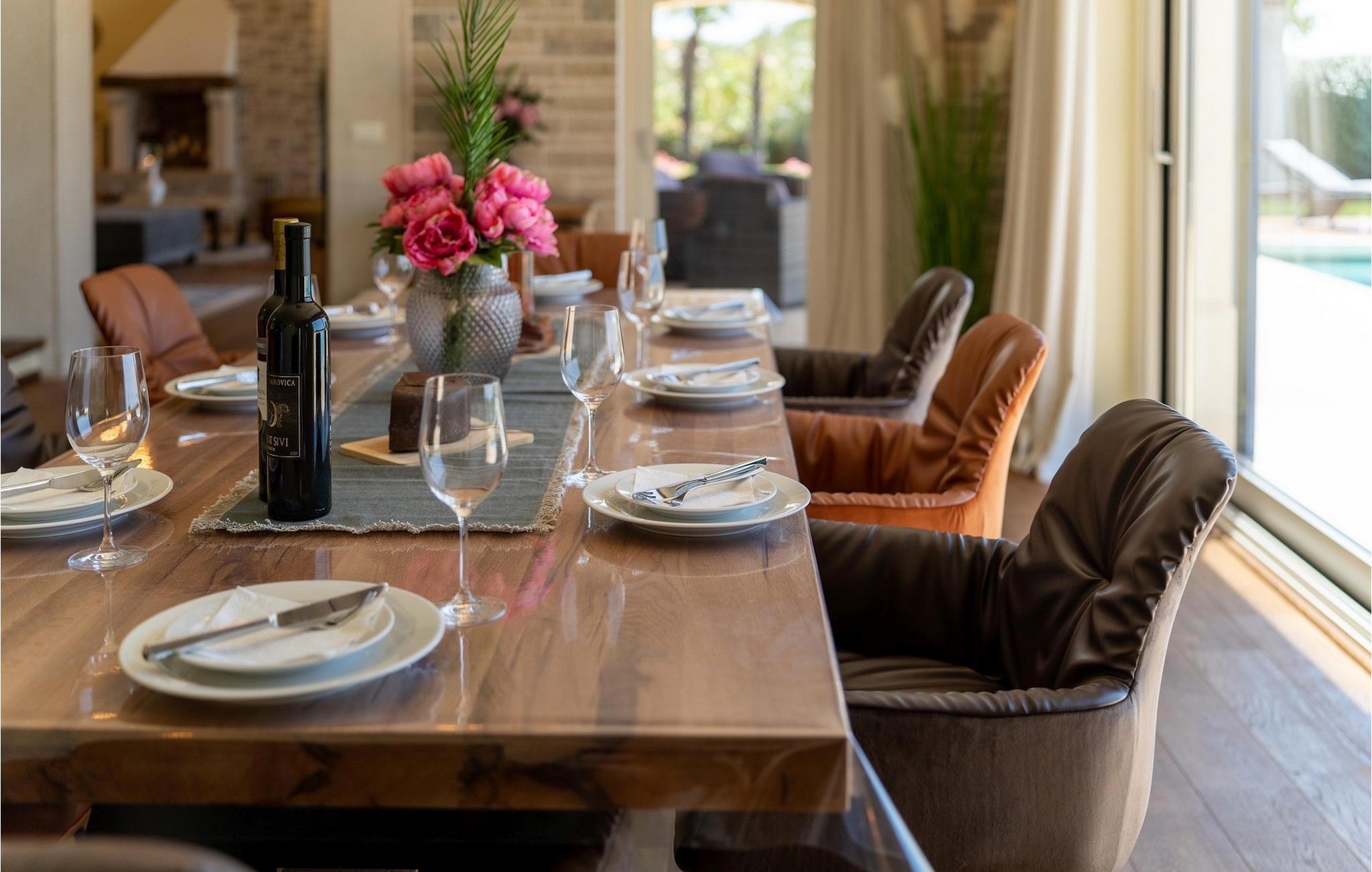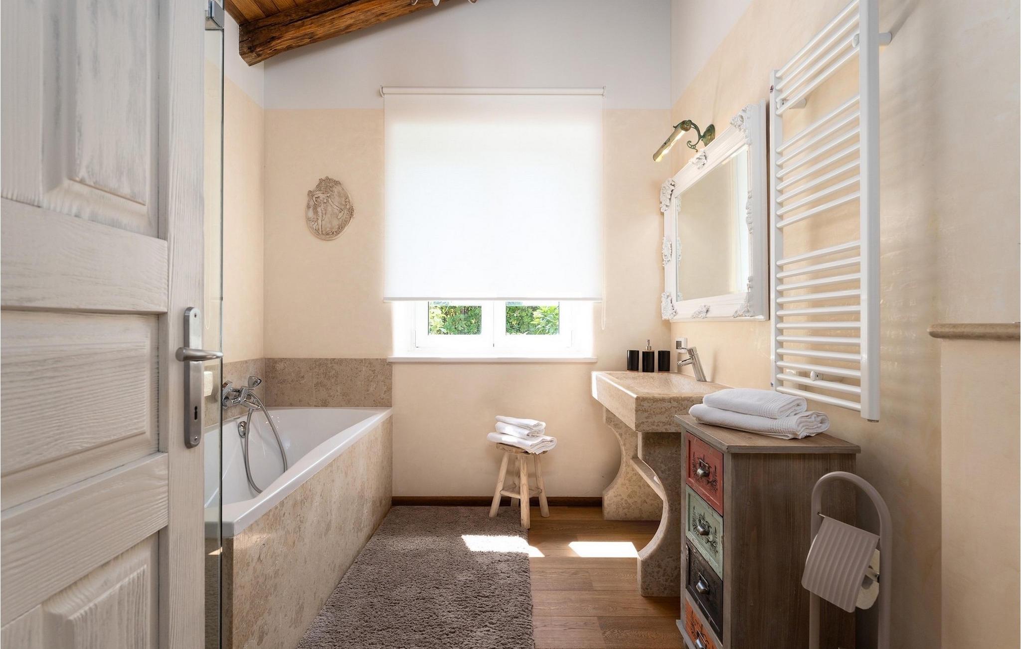 Denne smukke villa er beliggende nær Porec, i en lille landsby, som er 10 km væk fra havet og byens centrum. Villaen er bygget med sten og gode kvalitetsmaterialer, og den har en størrelse på 354m2, med 265m2 i stueetagen og 89m2 på første sal. Denne ejendom er beliggende på en 1.400m2 grund bestående af en velholdt have og eng. Ved siden af huset er der en garage på 58m2 til 2 køretøjer. Stueetagen har en stor stue med pejs, spisestue, køkken, spisekammer og 2 soveværelser med badeværelser (et af soveværelserne er placeret ved siden af køkkenet og det har en komfortabel sovesofa til 2 personer). Første sal har to soveværelser med ensuite badeværelser. Fra stuen har gæsterne let adgang til poolområdet og 40m2 privat swimmingpool. Soveværelserne ovenpå og poolområdet har en betagende havudsigt, så du kan nyde at svømme med udsigt til olivenlunde og Middelhavet. Udendørs kan du også slappe af i jacuzzien, som er tilgængelig på anmodning mod et ekstra gebyr. Denne ejendom er perfekt beliggende i fredelige olivenlunde og omkringliggende vinmarker, hvilket gør det til et perfekt tilflugtssted fra det hektiske moderne liv. Villaen er beliggende i udkanten af en lille landsby, der tilbyder fred og privatliv til familieferier, og alligevel er det kun 10-15 minutters kørsel fra den istriske juvel - Porec. Porec er det største turisthotspot i Istrien, hvor du vil finde alle slags aktiviteter, bemærkelsesværdige oplevelser og rig kulturarv. Det har 100 års erfaring inden for gæstfrihed og turisme. Sørg for ikke at gå glip af de mange fester, der arrangeres i turistlandsbyer og byens centrum. Der er strandklubber, kaffebarer, og efter midnat kan du nyde den behagelige atmosfære på natbarer og diskoteker. Intet andet end sjov fra solnedgang til solopgang! En bil anbefales. Temperaturen i den opvarmede swimmingpool er afhængig af eksterne faktorer, herunder vejrforhold, og som sådan kan temperaturen på vandet ikke garanteres.