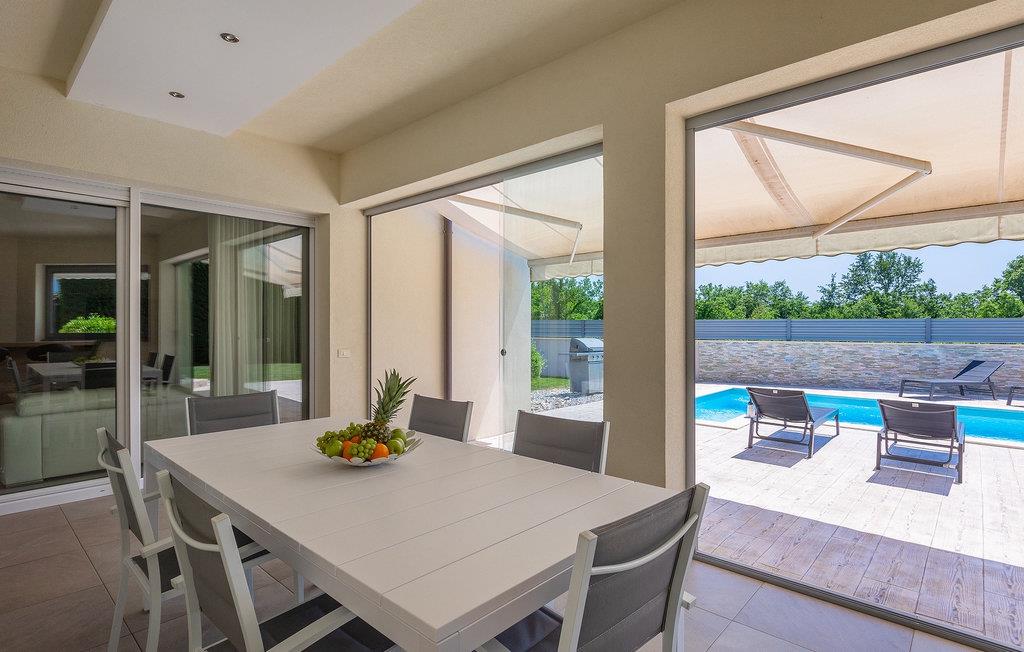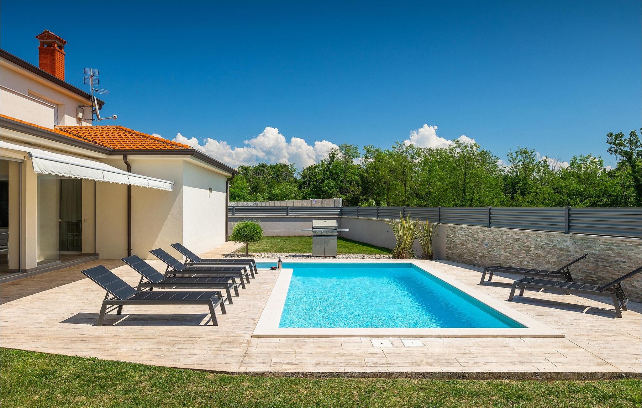 Leder du efter en lys villa med moderne indretning, er Villa Alex Exclusive stedet for dig. Denne villa kan rumme op til 6 gæster i 3 soveværelser med dobbeltsenge, hver med eget badeværelse og tv. Stueetagen byder på et af soveværelserne, en stue med 2 sofaer, et tv og en pejs til en hyggelig aften. Derudover er der et rummeligt fuldt udstyret køkken, en spiseplads med plads til op til 8 personer ved bordet og et separat halvbad. På første sal vil du have yderligere 2 soveværelser med eget badeværelse og tv og et walk-in closet. Begge etager har aircondition og er udstyret med gulvvarme. Uden for villaen, inden I træder ind i haven, finder I et udekøkken på den skyggefulde terrasse med eget køleskab, komfur og vask, ved siden af er der endnu et spisebord til op til 6 personer, til et lækkert måltid i frisk luft. Hvis du foretrækker en dejlig sommer-grill, behøver du ikke bekymre dig, den smukke have har en grill lige ved siden af poolen, sammen med 6 strandstole, så hele gruppen kan slappe af i solen, mens hegnet og den høje hæk tilbyder privatliv. Forsiden af villaen byder på plads nok til at op til 3 biler kan parkeres. Hvis denne elegante villa lyder som den rigtige for dig, så book den nu og sørg for en vidunderlig ferie for dig og din familie og venner. Villa Alex Exclusive ligger i den historiske by Porec på kysten af halvøen Istrien i det vestlige Kroatien. Dette populære feriested er hjemsted for Euphrasian-basilikaen, som er kendt for sine fantastiske byzantinske mosaikker, der skaber indviklede billeder. Bortset fra dens kulturelle og historiske betydning er Porec en fantastisk destination for vandsport. Den tætte kyst byder på mange strande, hvor du kan deltage i aktiviteter fra leje af jetski til golf. Der er masser af charmerende restauranter over hele byen, der serverer lækre lokale retter fra fisk til bøffer. Efter en smuk familiemiddag kan du tage en afslappende gåtur langs den betagende marina, før du går tilbage til din luksuriøse villa.