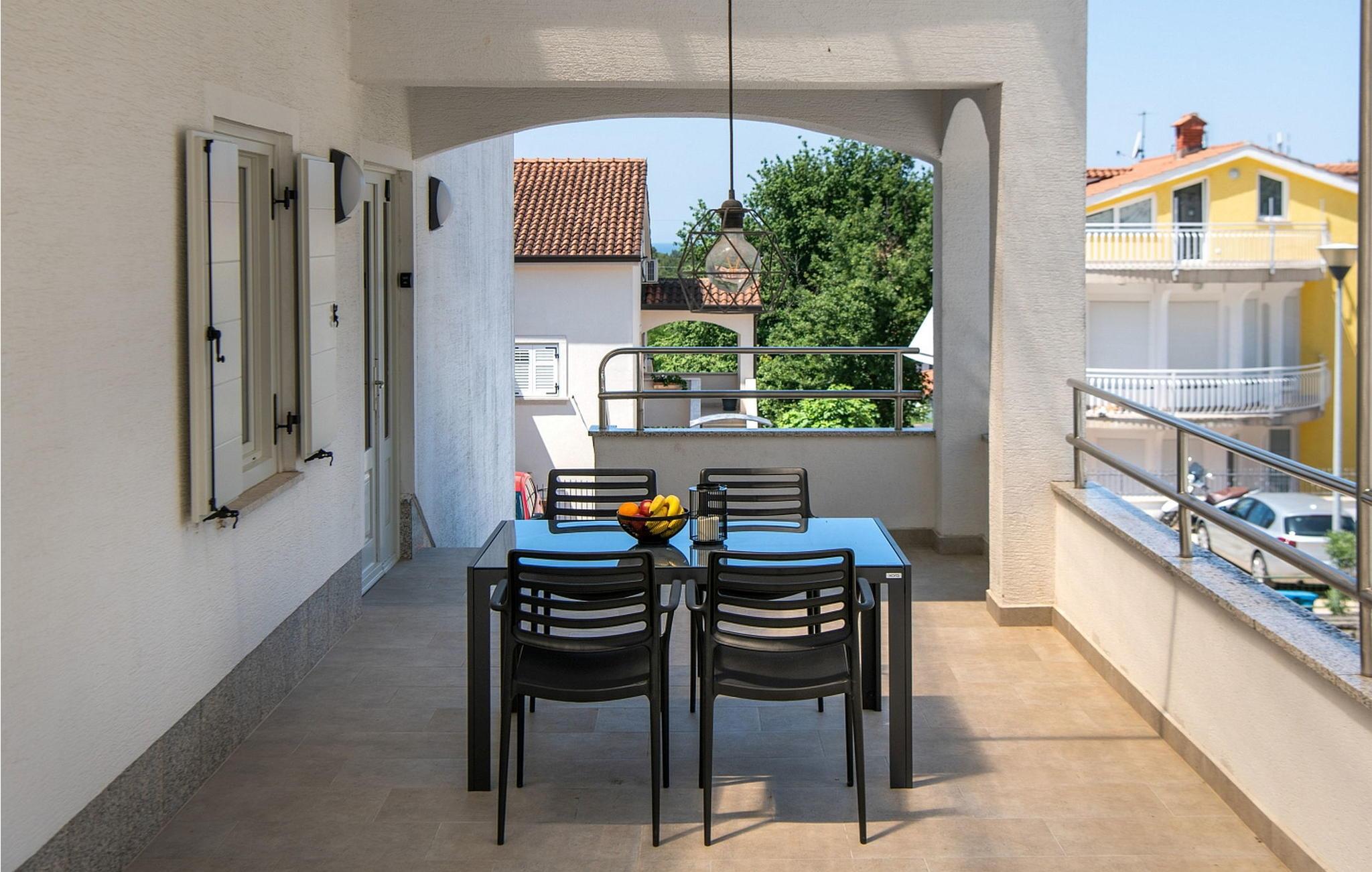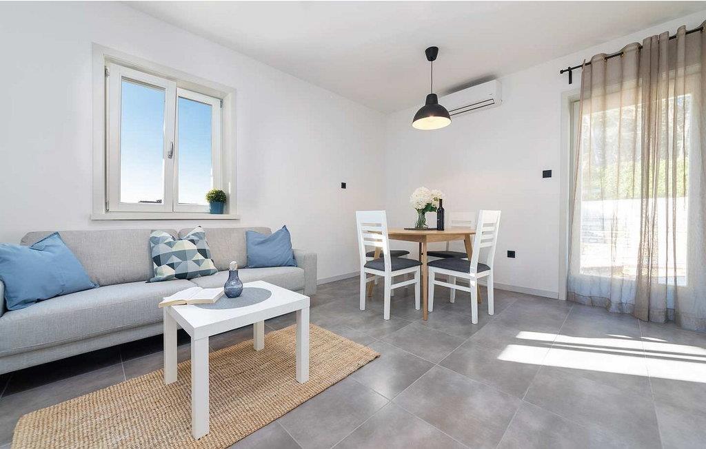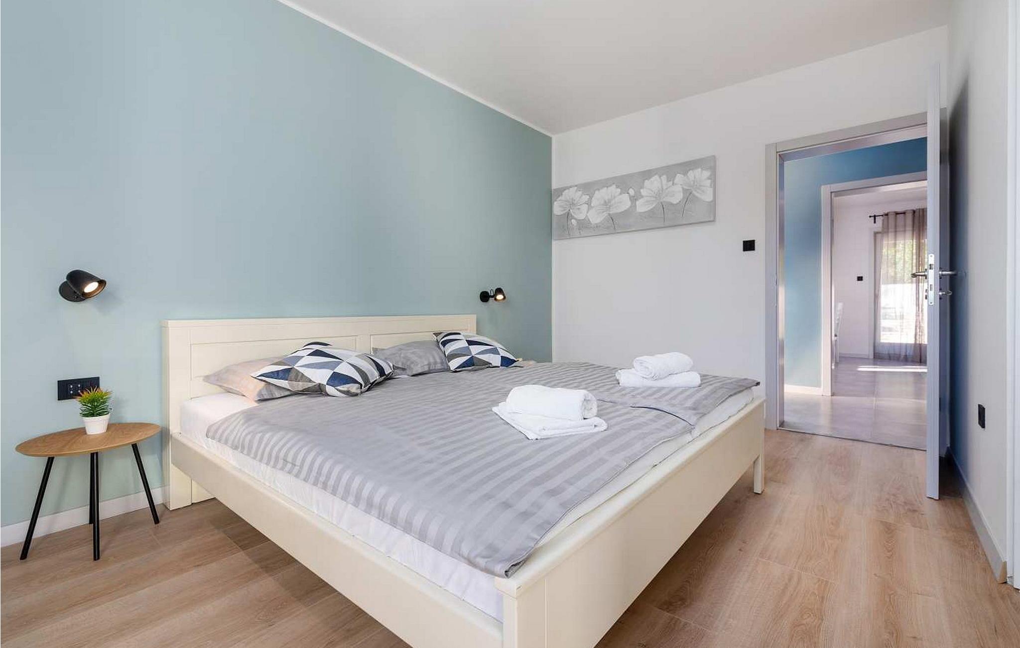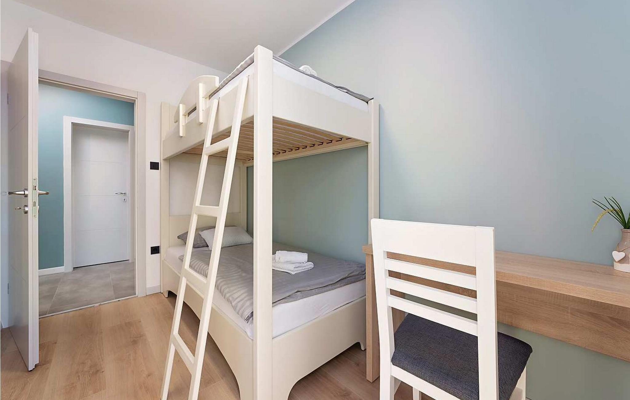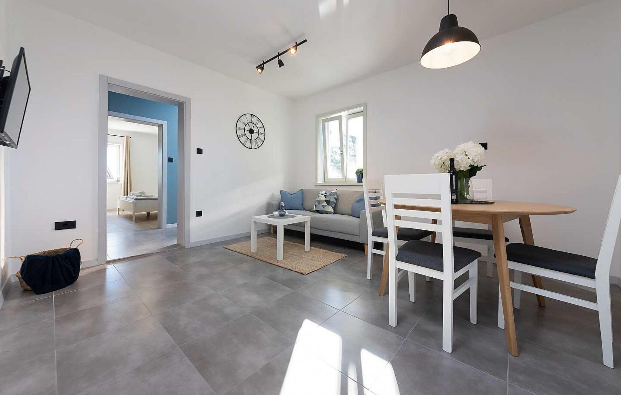 Lejlighederne Marina er beliggende i et lejlighedshus med i alt 4 lejligheder i husets stueetage og første sal. Huset har en fælles swimmingpool på 36 kvm, stor overdækket terrasse med grill og spisebord og en parkeringsplads til hver lejlighed. Lejlighed Marina 4 ligger på husets første sal (i niveau med swimmingpoolen), har en overflade på ca. 50 kvm og er til 4 gæster. Den består af opholdsstue med siddegruppe, udstyret køkken og spisebord, to soveværelser med dobbeltsenge, hvoraf et med dobbeltseng og et med køjesenge, bad/toilet. Lejligheden har en stor terrasse med spisebord til udendørs spisning. Bemærk venligst, at denne ejendom ikke accepterer ungdomsgrupper eller polterabends. En ungdomsgruppe på denne ejendom er en gruppe bestående af personer på 26 år eller derunder. Book ikke denne ejendom, hvis du er en ungdomsgruppe eller et polterabend, da din reservation vil blive afvist efter booking, hvilket kan omfatte ved ankomst til ejendommen eller under dit ophold, og du vil ikke blive refunderet.