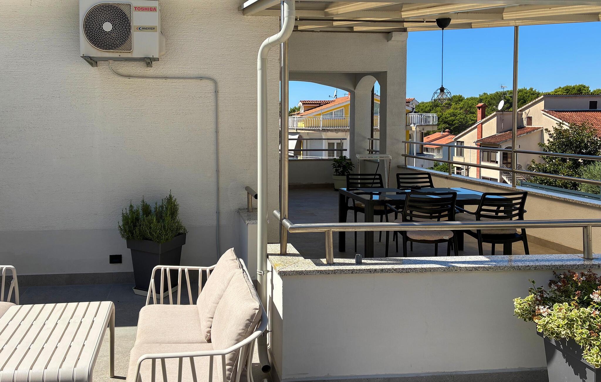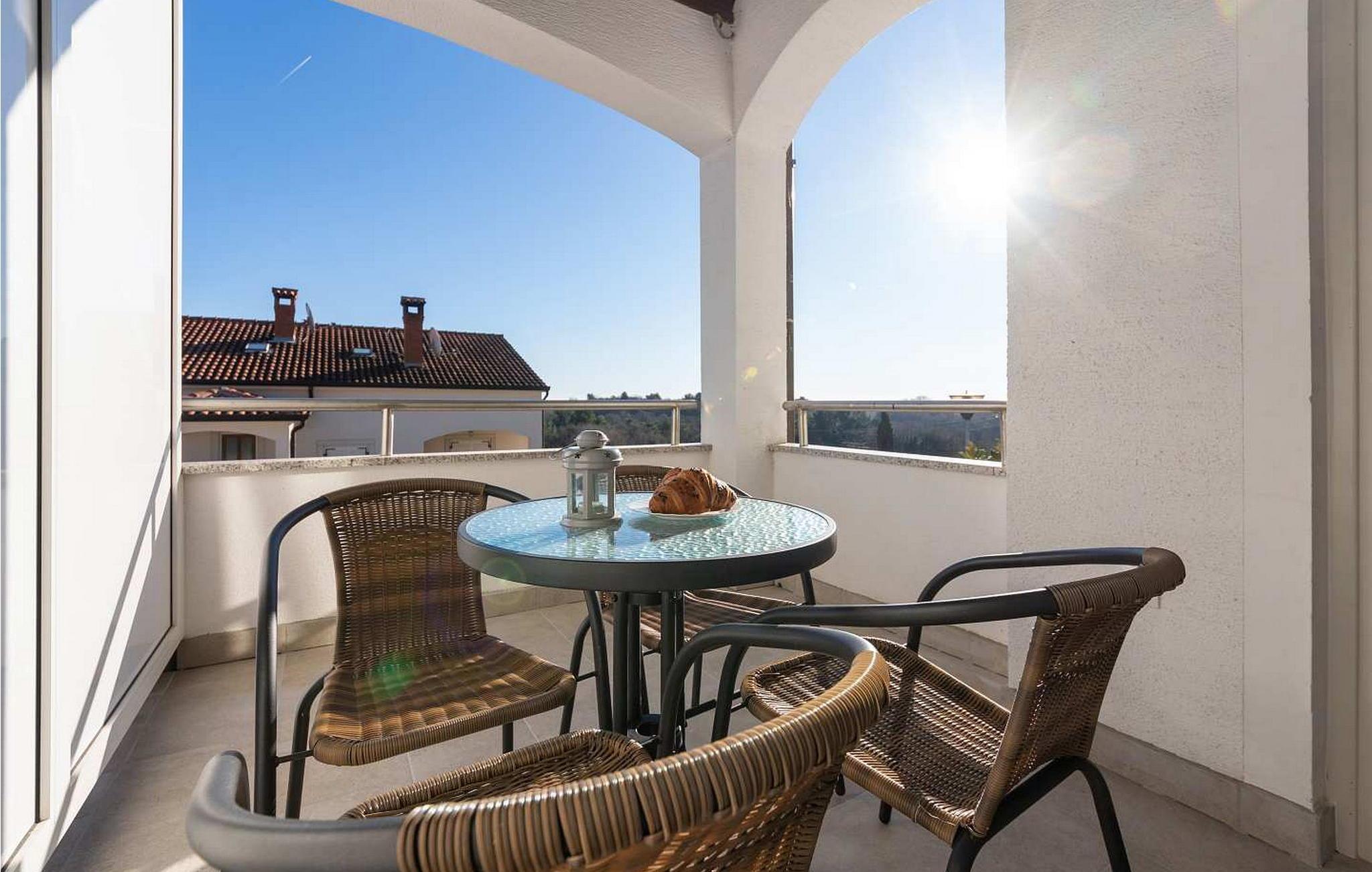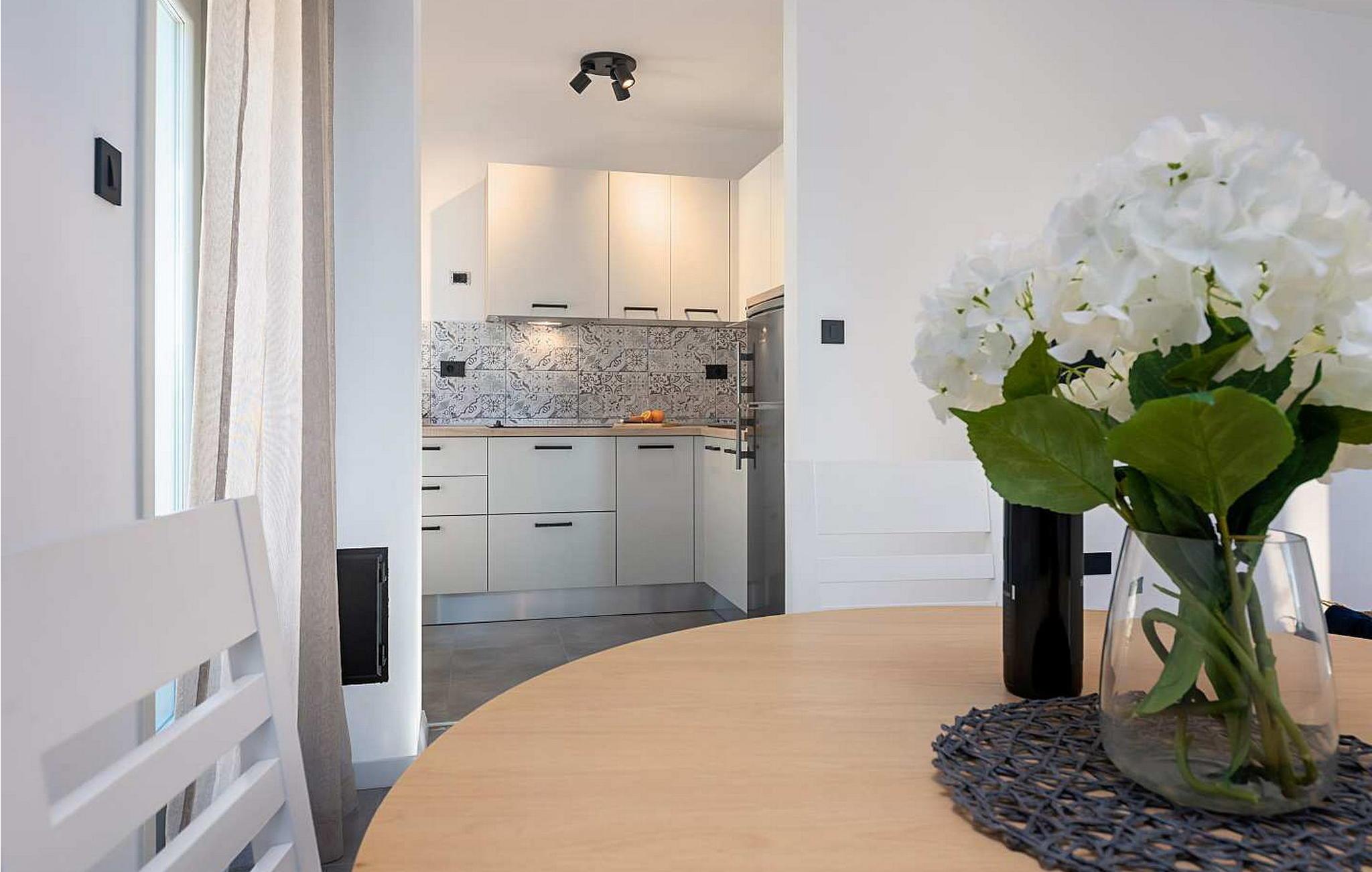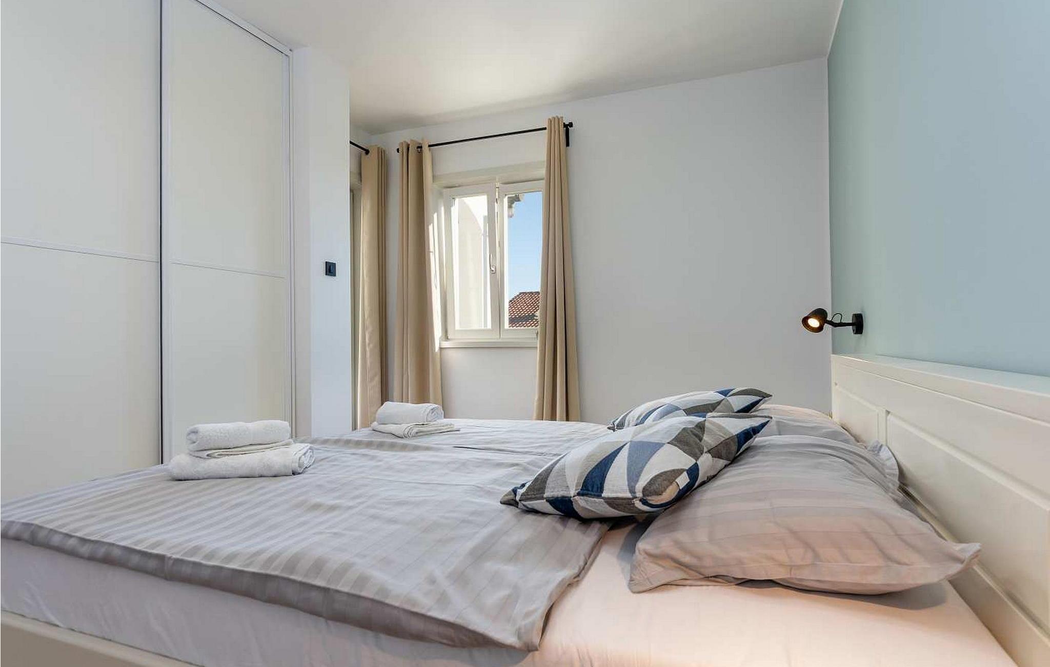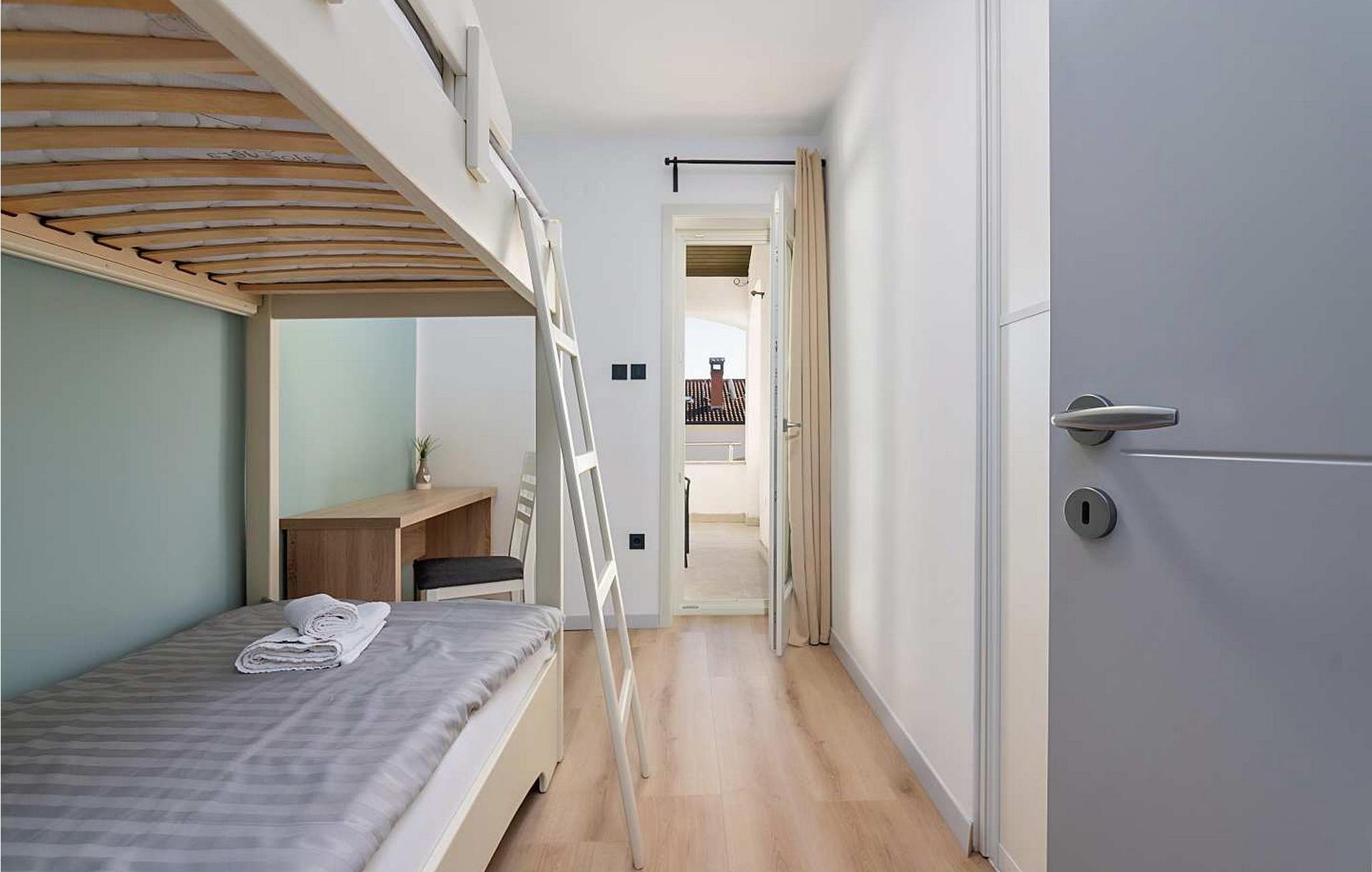 Lejlighederne Marina er beliggende i et lejlighedshus med i alt 4 lejligheder i husets stueetage og første sal. Huset har en fælles swimmingpool på 36 kvm, stor overdækket terrasse med grill og spisebord og en parkeringsplads til hver lejlighed. Lejlighed Marina 4 ligger på husets første sal (i niveau med swimmingpoolen), har en overflade på ca. 50 kvm og er til 4 gæster. Den består af opholdsstue med siddegruppe, udstyret køkken og spisebord, to soveværelser med dobbeltsenge, hvoraf et med dobbeltseng og et med køjesenge, bad/toilet. Lejligheden har en stor terrasse med spisebord til udendørs spisning. Bemærk venligst, at denne ejendom ikke accepterer ungdomsgrupper eller polterabends. En ungdomsgruppe på denne ejendom er en gruppe bestående af personer på 26 år eller derunder. Book ikke denne ejendom, hvis du er en ungdomsgruppe eller et polterabend, da din reservation vil blive afvist efter booking, hvilket kan omfatte ved ankomst til ejendommen eller under dit ophold, og du vil ikke blive refunderet.