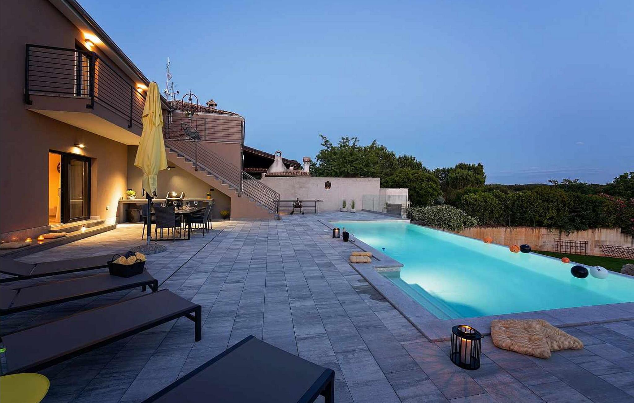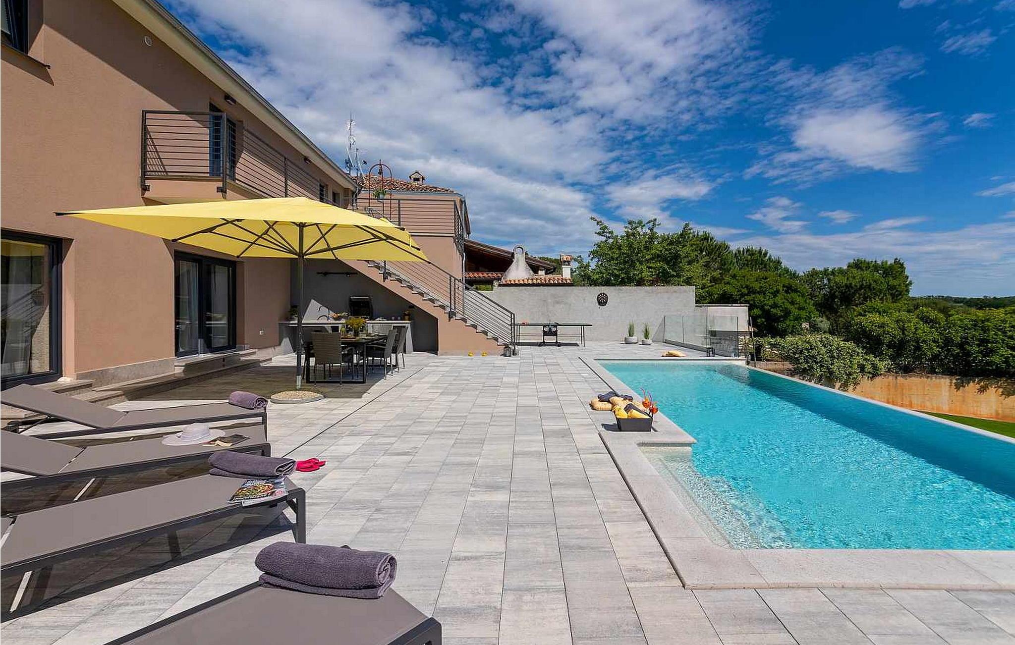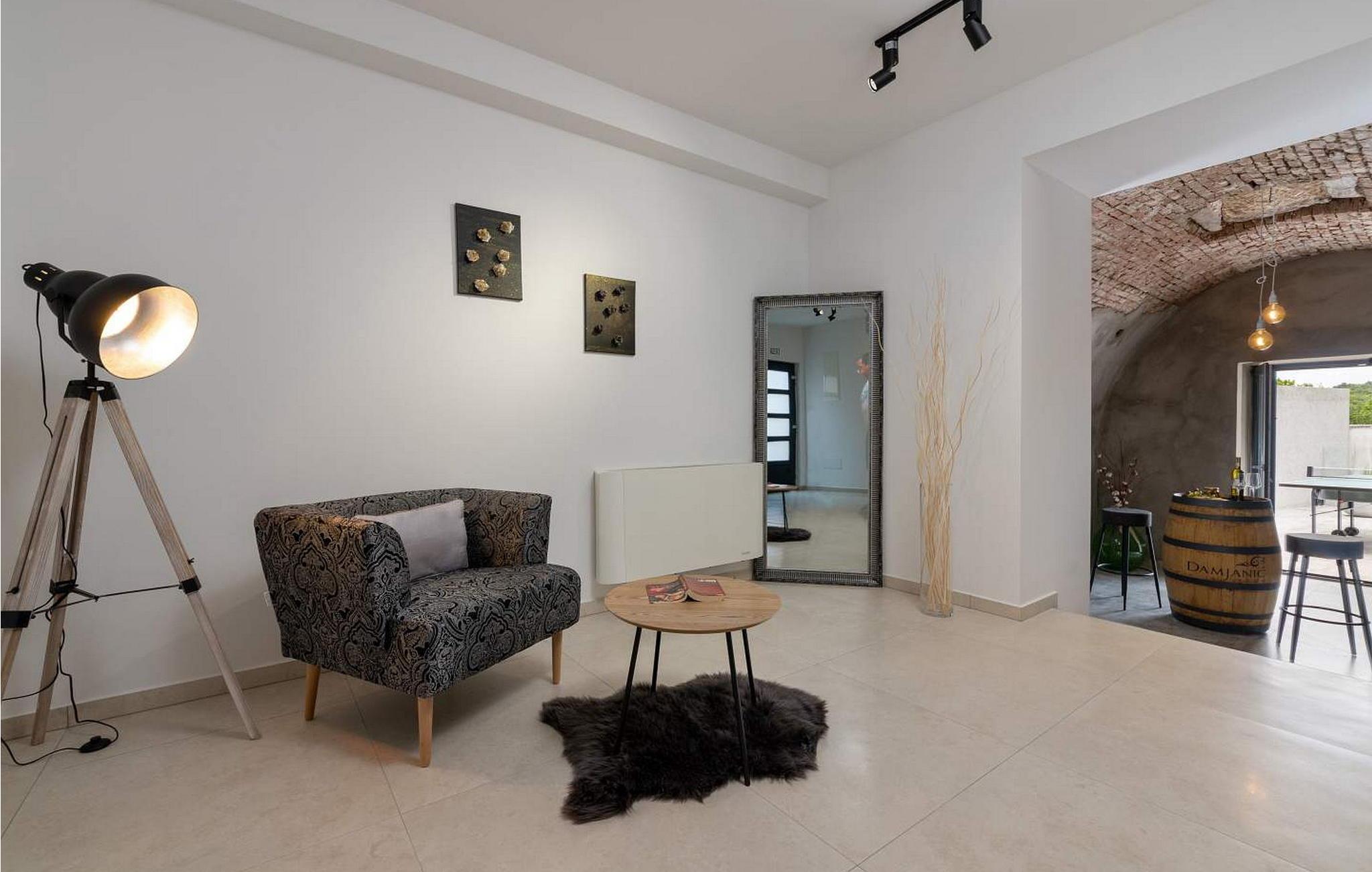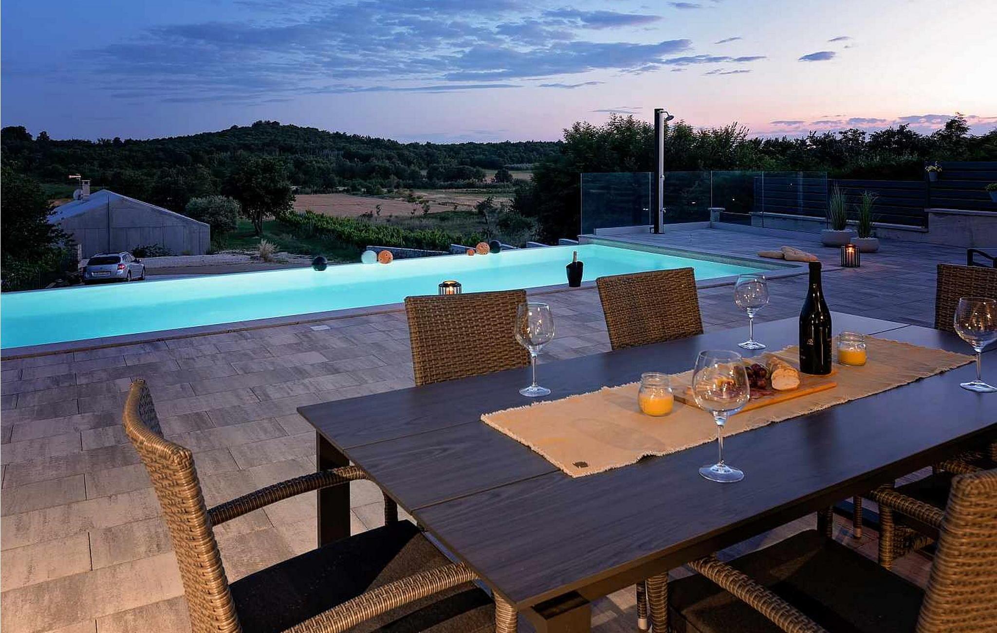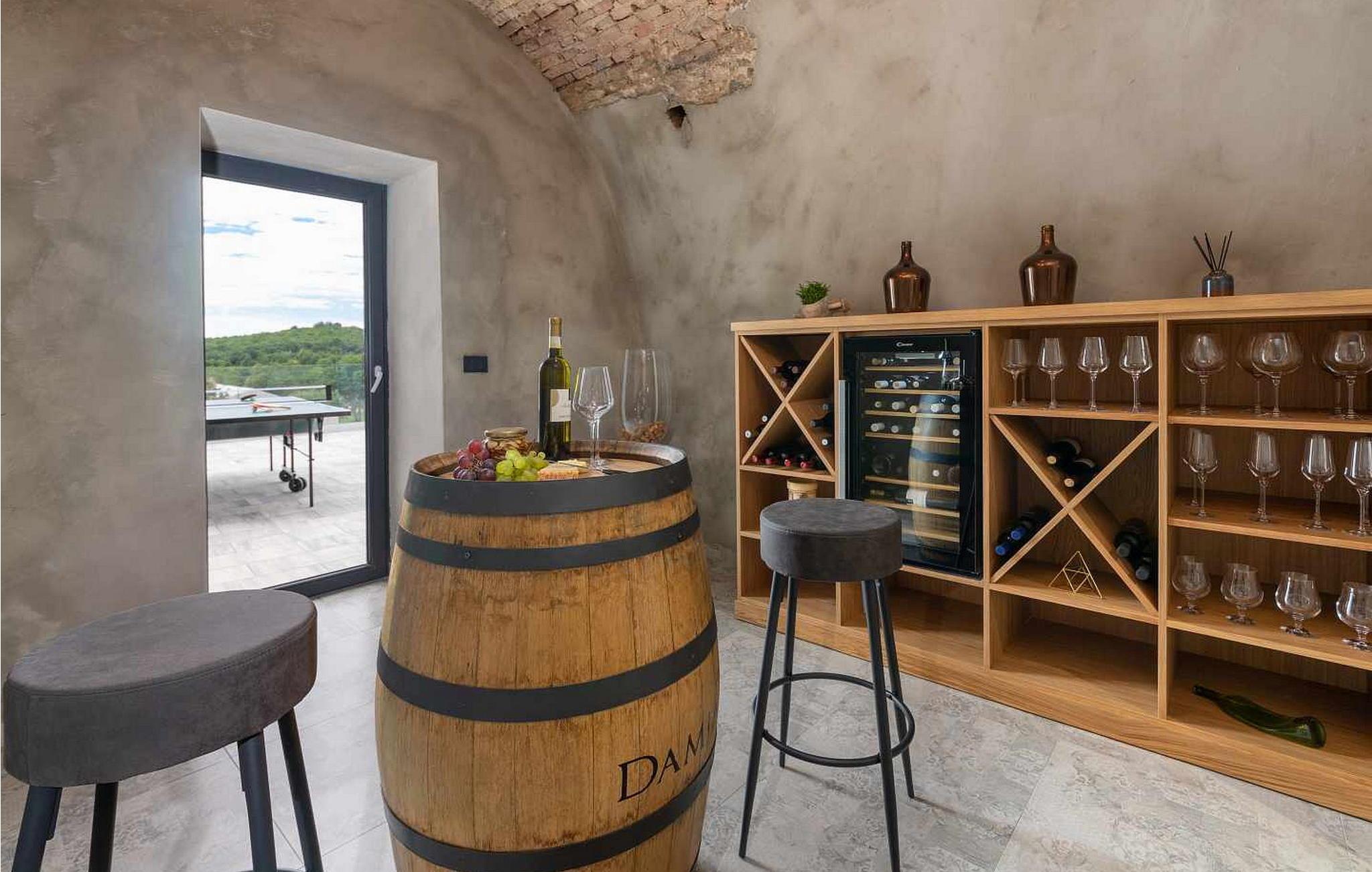 Velkommen til den imponerende Villa Sunnyside i udkanten af ??den idylliske landsby Dracevac. Dette moderne feriehus kombinerer moderne komfort med et strejf af historie, hvilket skaber en unik atmosfære. Den omhyggeligt designede vinkælder, som blev skabt af en gammel cisterne, giver boligen sin særlige charme. På den private ejendom kan I nyde fred og afslapning. Dyk ned i infinity-poolen, solbad på det rummelige solbadningsområde eller tilbring hyggelige timer ved grillen. Den udendørs spiseplads lægger op til at nyde kulinariske aftener under den istriske stjernehimmel.