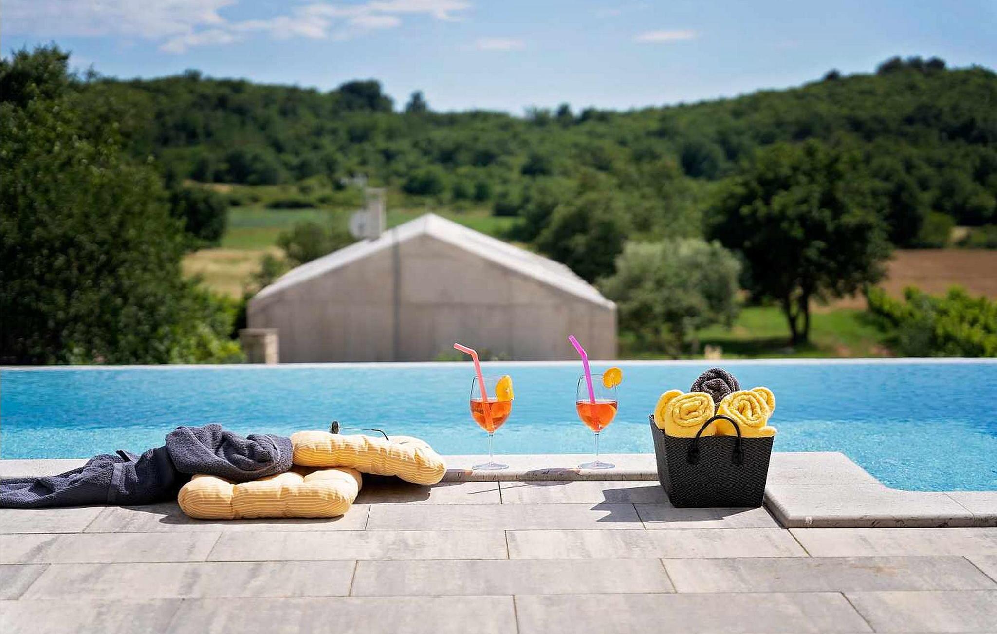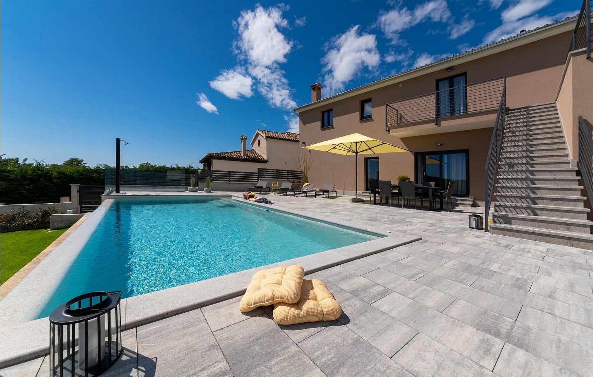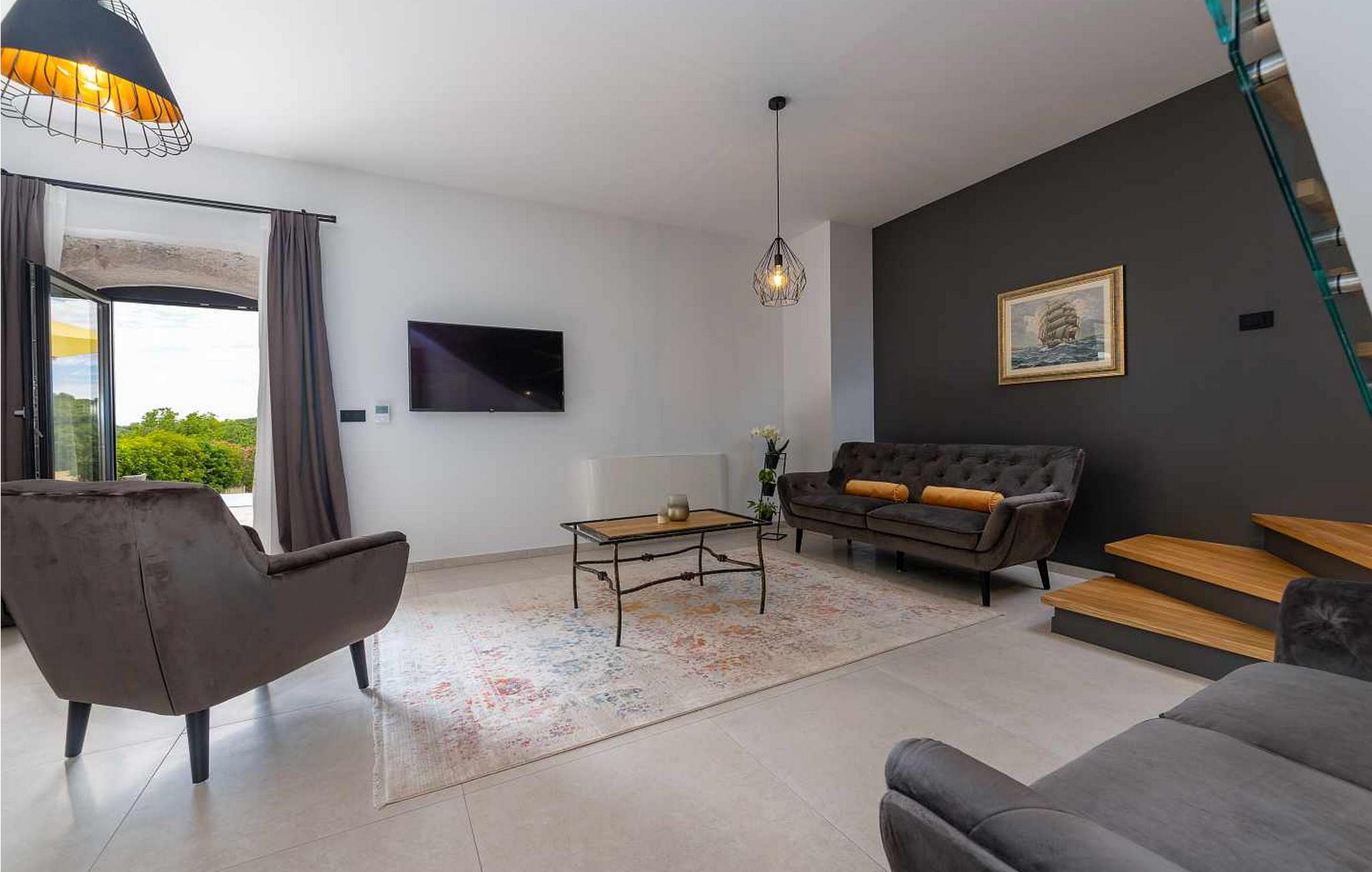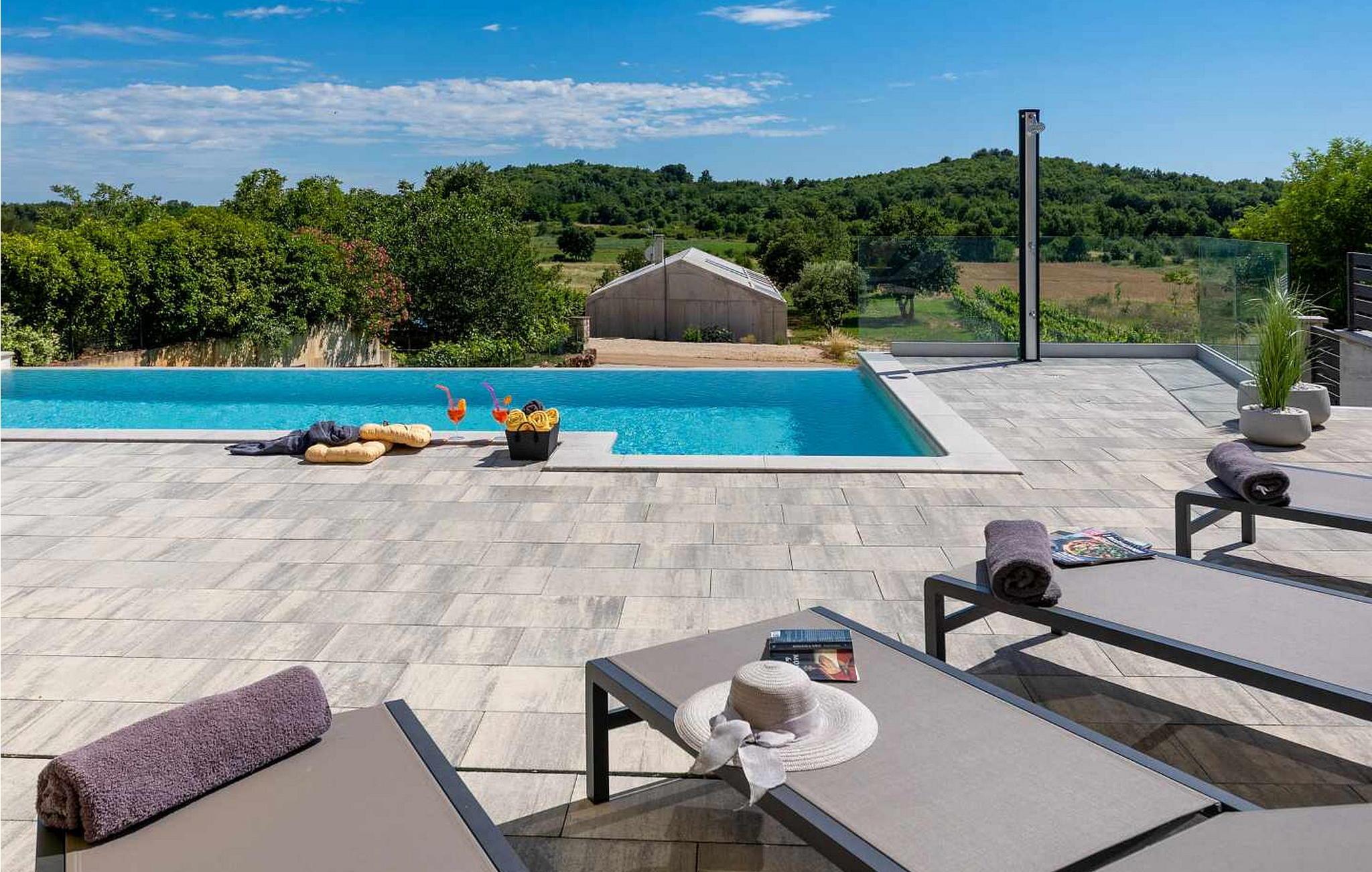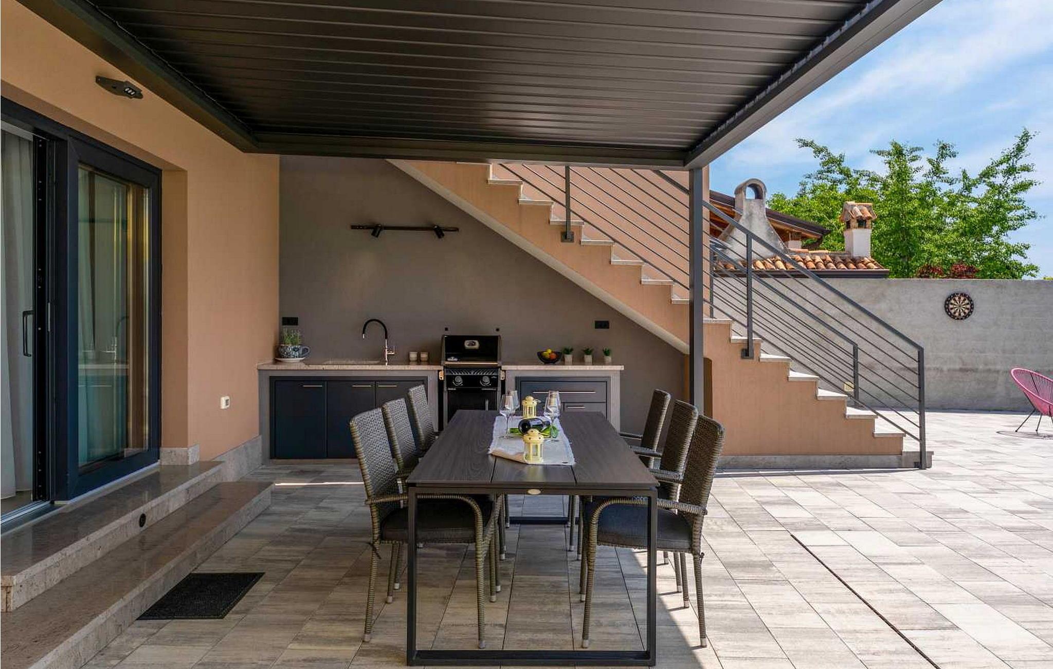 Velkommen til den imponerende Villa Sunnyside i udkanten af ??den idylliske landsby Dracevac. Dette moderne feriehus kombinerer moderne komfort med et strejf af historie, hvilket skaber en unik atmosfære. Den omhyggeligt designede vinkælder, som blev skabt af en gammel cisterne, giver boligen sin særlige charme. På den private ejendom kan I nyde fred og afslapning. Dyk ned i infinity-poolen, solbad på det rummelige solbadningsområde eller tilbring hyggelige timer ved grillen. Den udendørs spiseplads lægger op til at nyde kulinariske aftener under den istriske stjernehimmel.