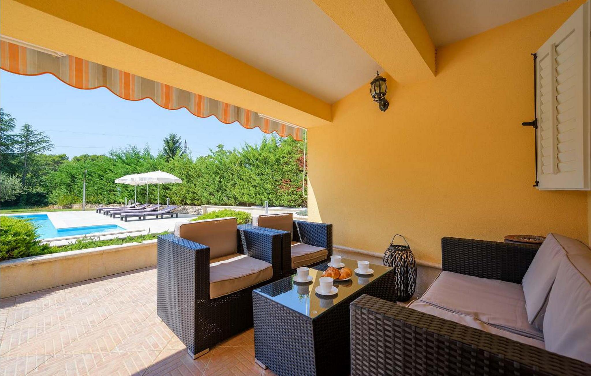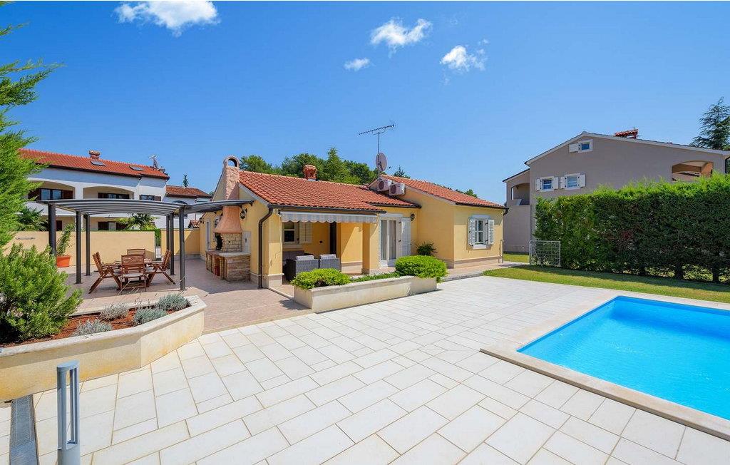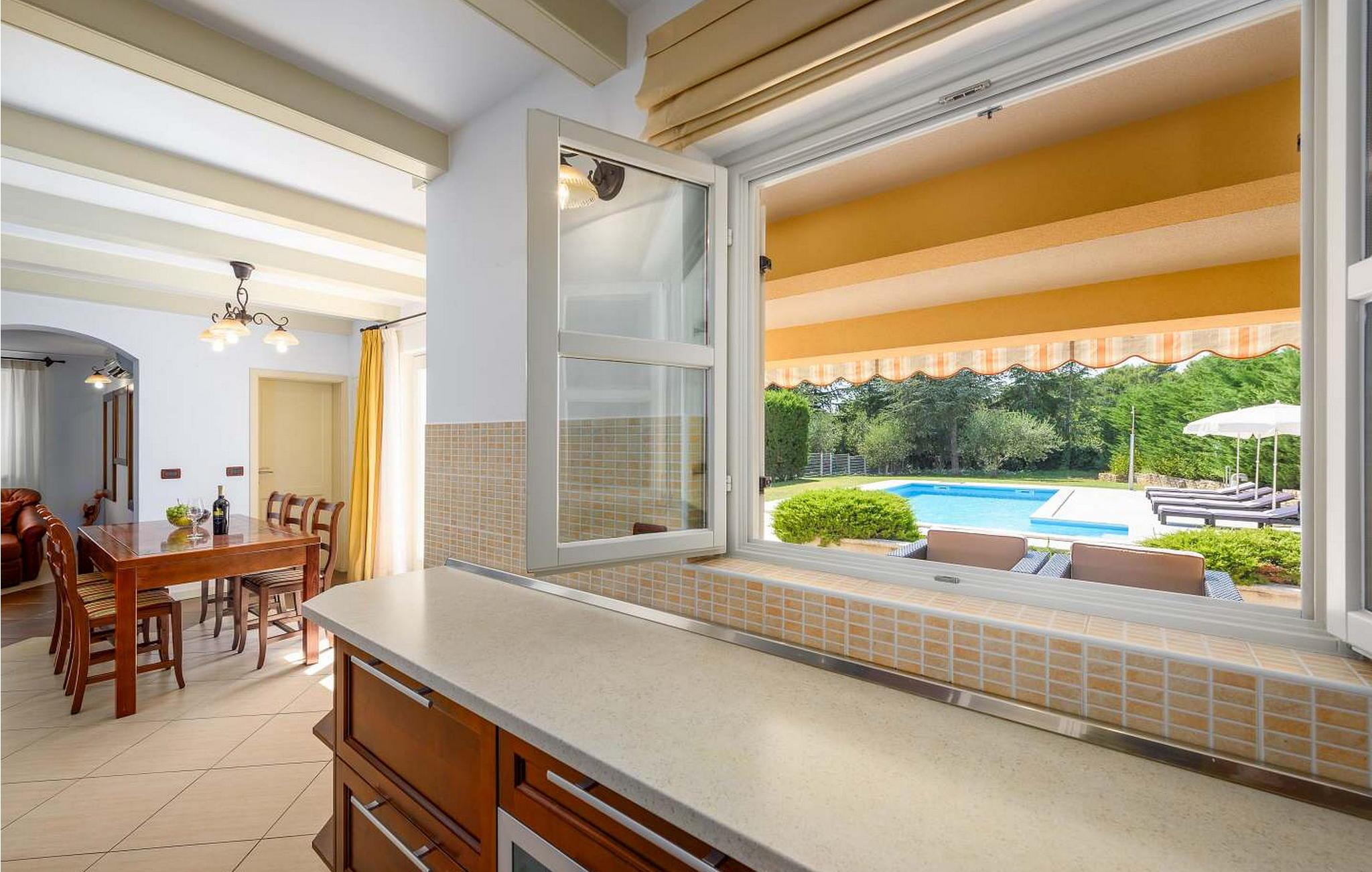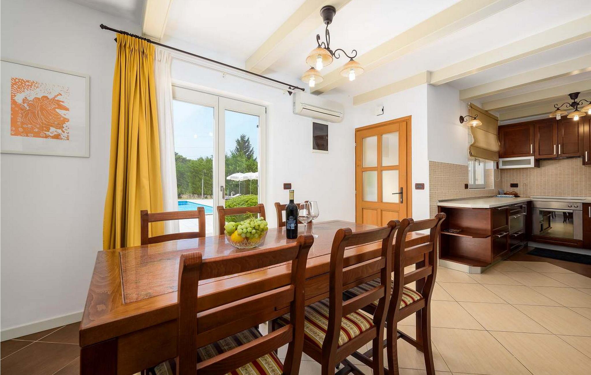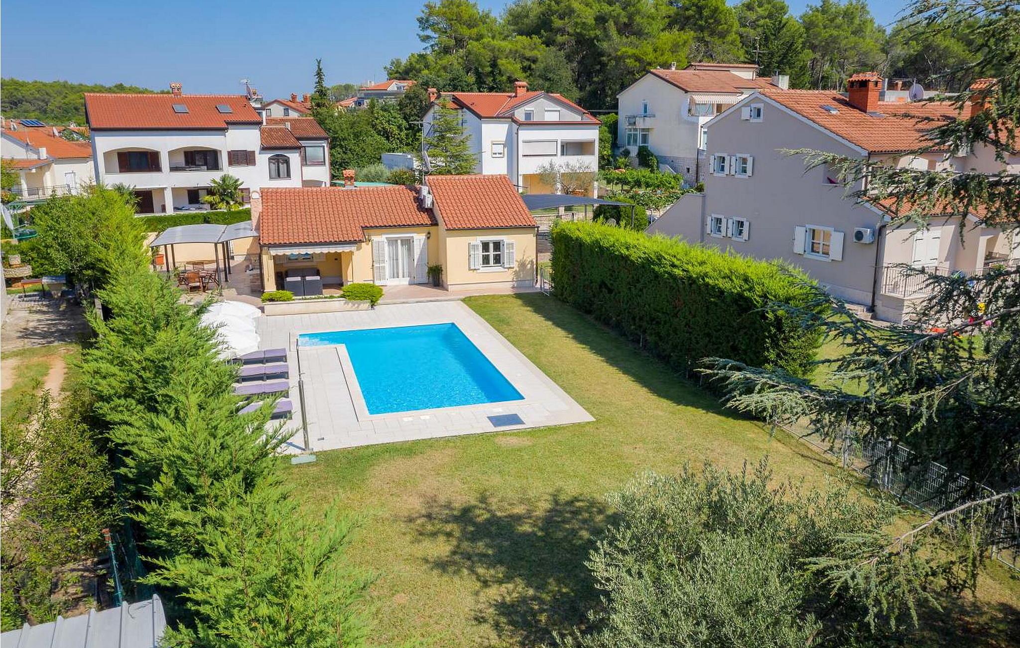 Casa Rita Porec er et dejligt en-etagers feriehus, kun 1,5 km fra Porecs travle centrum og 2 km fra stranden. Villaen er beliggende på privat, indhegnet grund med en forfriskende swimmingpool, ideel til en afslappet svømmetur på varme dage. Udendørsområdet er en sand oase med en overdækket terrasse og en muret grill med udsigt over poolen, perfekt til udendørs spisning. Et andet overdækket område med komfortable stole inviterer dig til at slappe af med en drink og nyde de rolige omgivelser. Indvendigt er opholdsstuen med aircondition designet til komfort og stil med en lædersofa og en åben grundplan, der inkluderer køkkenet og spisepladsen, begge med udsigt over poolen og opholdsstuen. Køkkenet er fuldt udstyret, hvilket gør det til en fornøjelse at tilberede måltider. Porec er let tilgængelig til fods. Der ligger en restaurant kun 300 m og en butik 500 m fra huset. Udforsk den gamle bydels livlige stengader og hyggelige restauranter, og besøg den imponerende Basilica of Euphrasia, et mesterværk fra det 6. århundrede. Bemærk venligst, at denne ejendom ikke accepterer ungdomsgrupper eller polterabender. En ungdomsgruppe på denne ejendom består af personer på 26 år eller derunder.