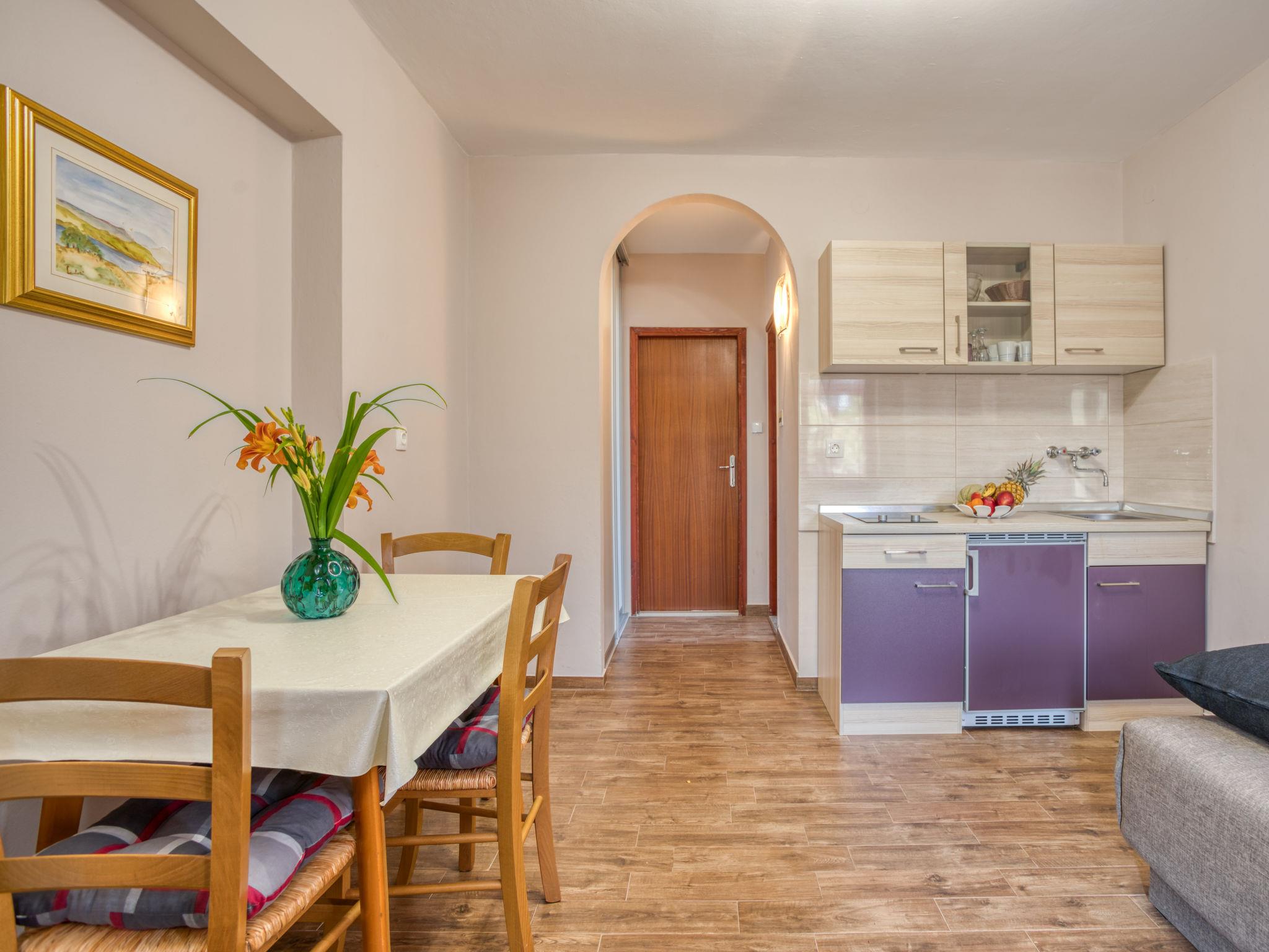 2-room apartment 31 m2, on the ground floor. Living/dining room with 1 double sofabed (150 cm, length 200 cm), air conditioning. 1 room with 1 french bed (160 cm, length 200 cm), satellite TV (flat screen). Exit to the terrace. Open kitchen (2 ceramic glass hob hotplates). Shower/WC. No heating option. Terrace 5 m2. Terrace furniture. Facilities: Internet (WiFi, free). Parking (1 car) at the house.