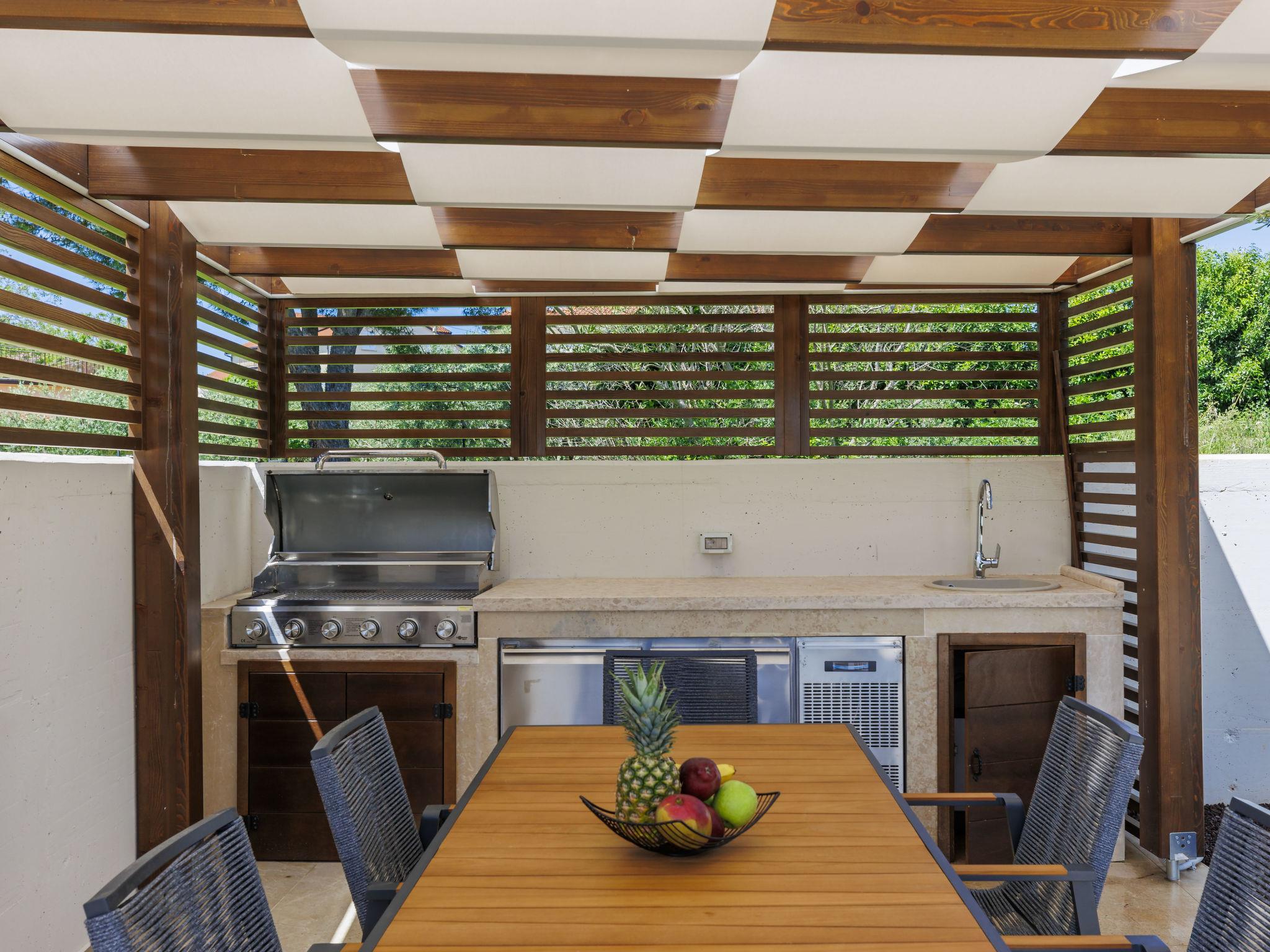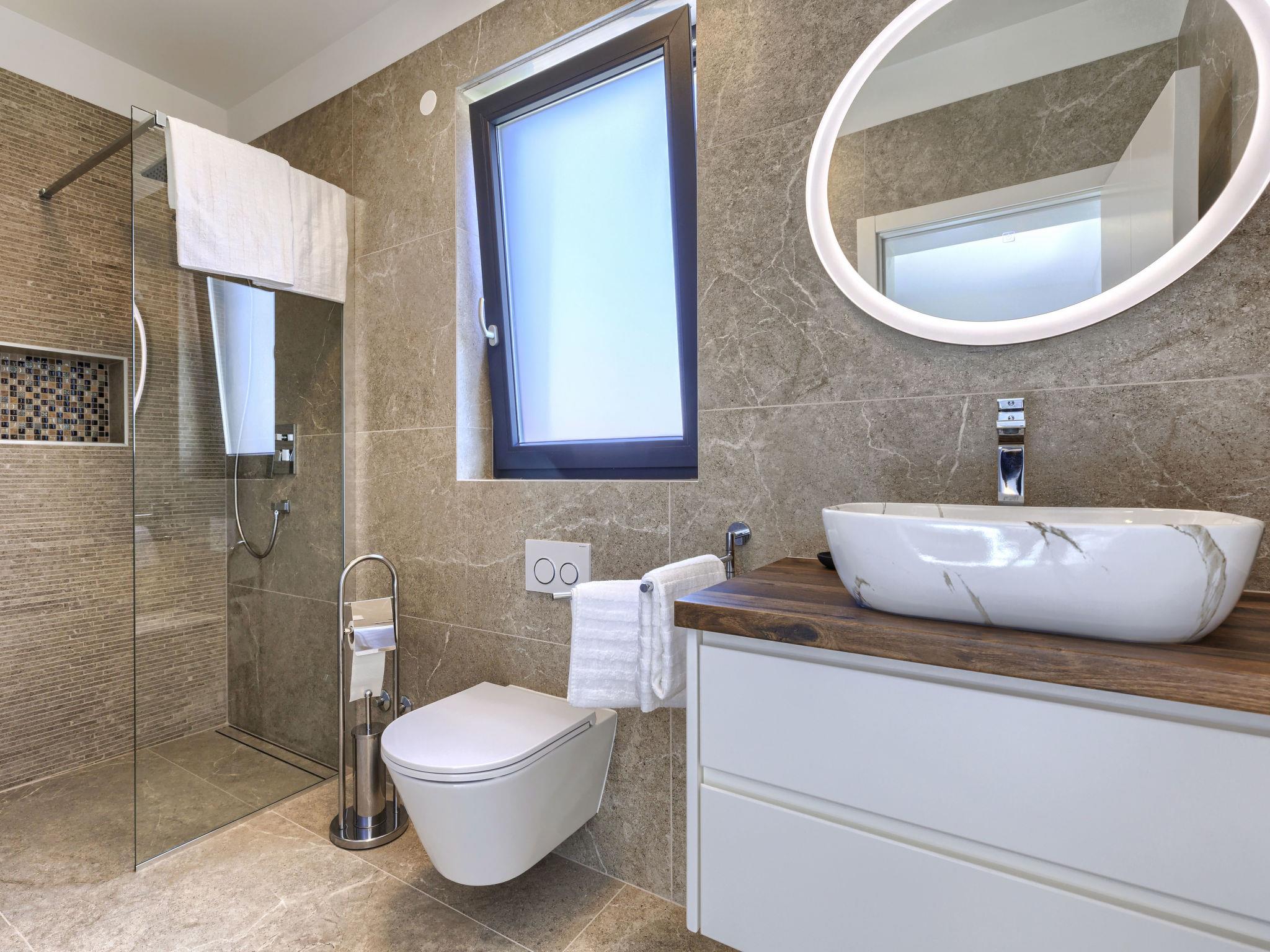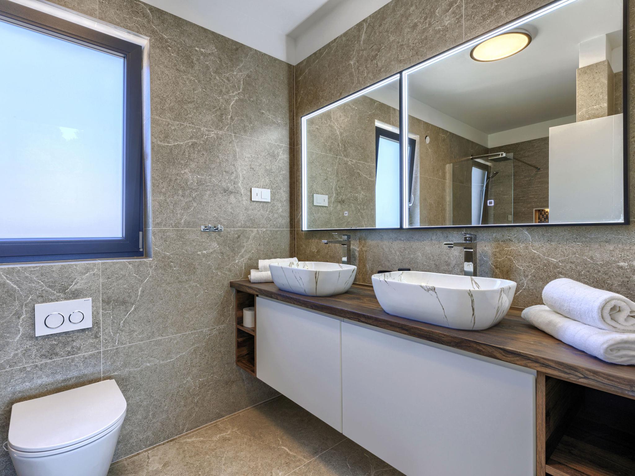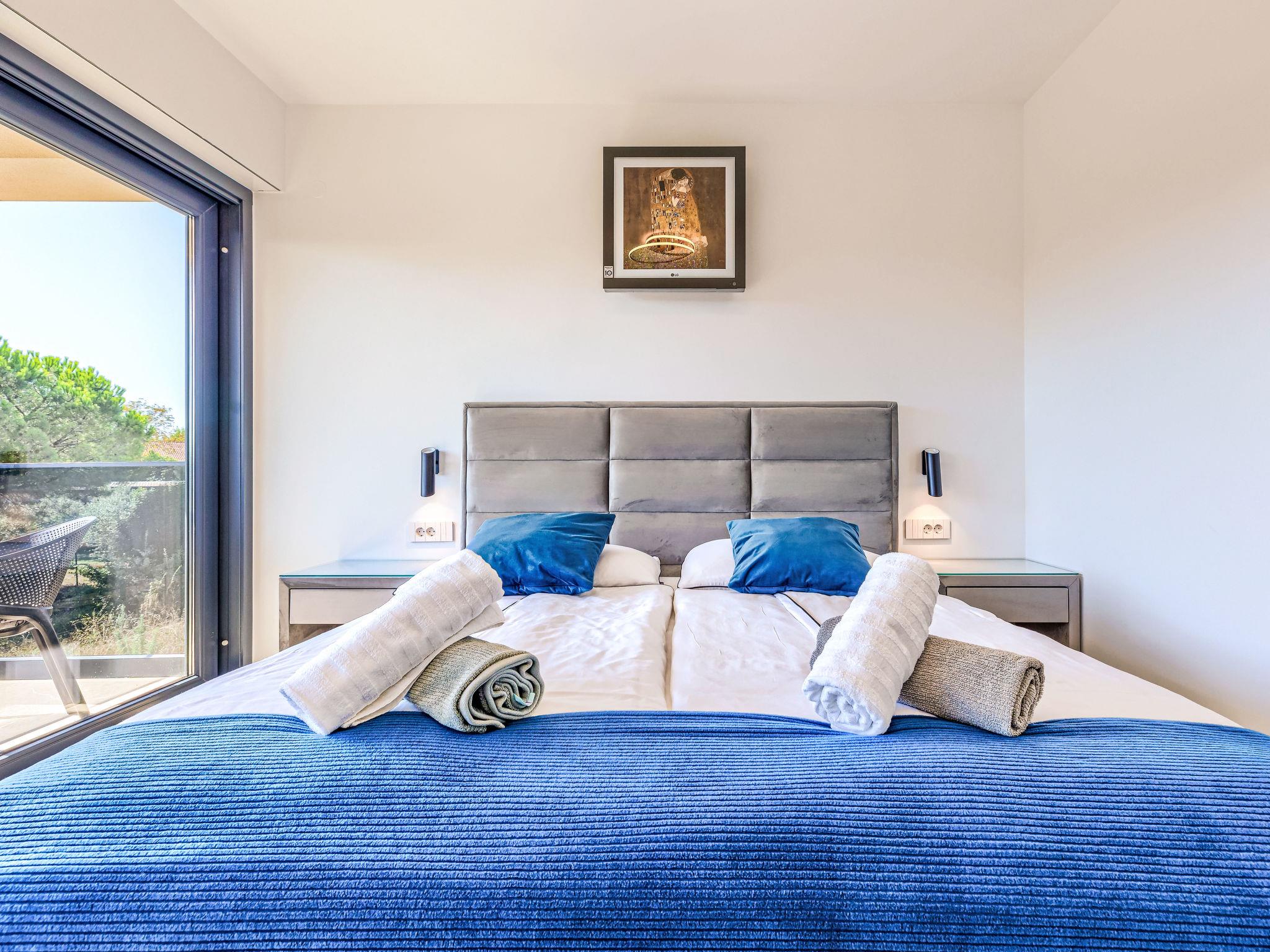 5-room villa 220 m2 on 3 levels. Spacious, beautiful and modern furnishings: living/dining room with satellite TV and air conditioning. Exit to the terrace, to the swimming pool. 1 room with 1 french bed (180 cm, length 200 cm), shower/WC, satellite TV and air conditioning. Open kitchen (oven, dishwasher, 4 ceramic glass hob hotplates, toaster, kettle, microwave, freezer, electric coffee machine). Sep. WC. On the lower ground floor: sep. WC. Upper floor: (spiral staircase), 1 room with 1 french bed (180 cm, length 200 cm), shower/WC, double hand-basin, satellite TV and air conditioning. Exit to the terrace. 1 room with 1 french bed (180 cm, length 200 cm), shower/WC, satellite TV and air conditioning. Exit to the terrace. Floor heating. Terrace 12 m2, roofed terrace 18 m2. Terrace furniture, deck chairs. Distant view of the sea. Facilities: safe, iron, mosquito net, hair dryer. Internet (WiFi, free).
