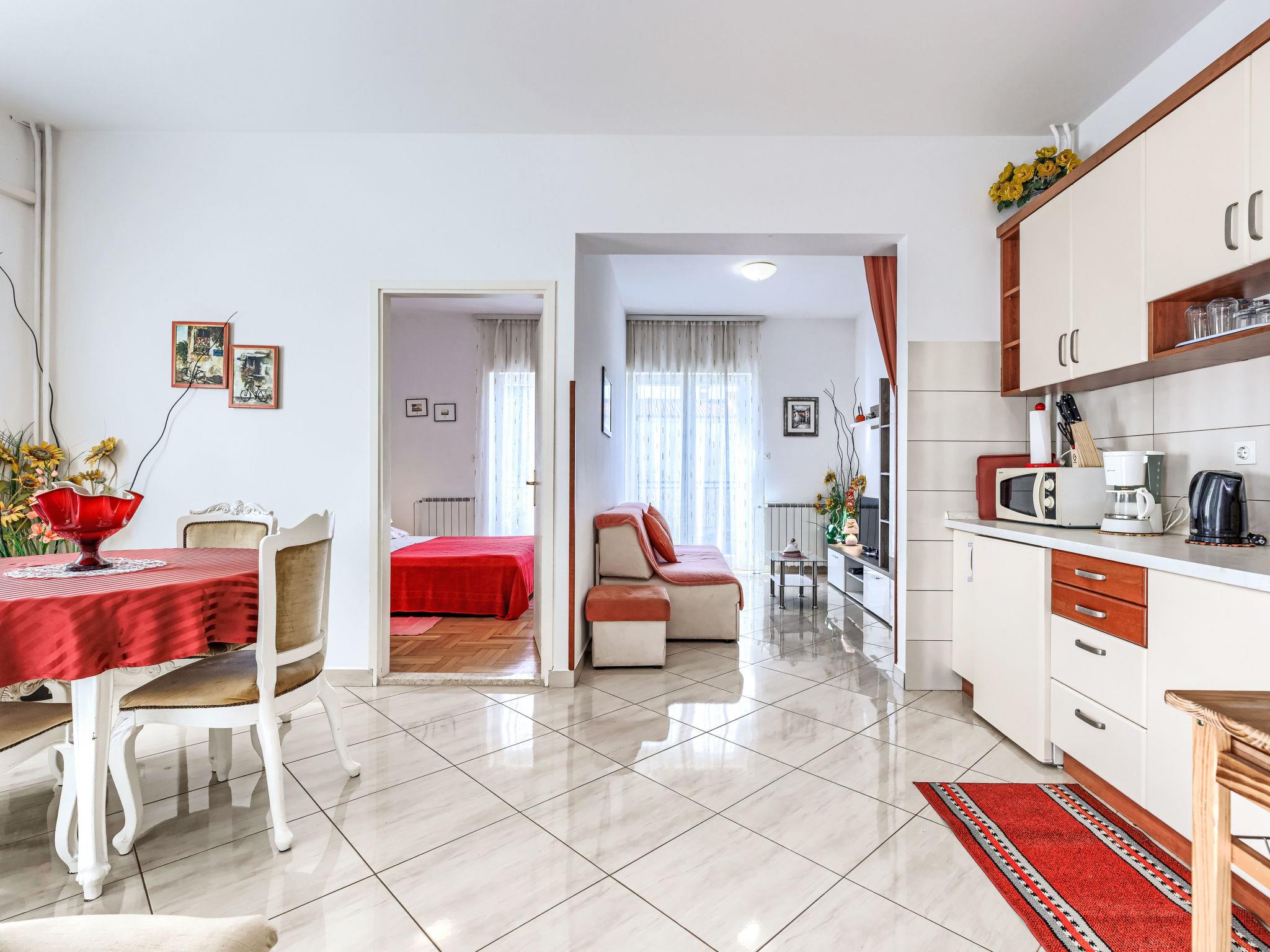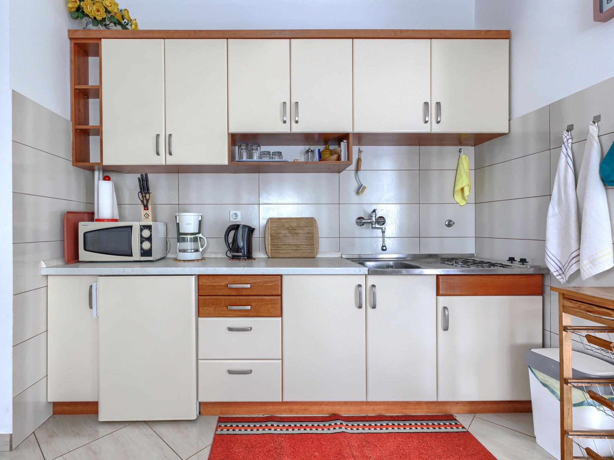3-room apartment 70 m2, on the upper ground floor. Cosy furnishings: living/dining room with satellite TV and air conditioning. Exit to the terrace. 1 room with 1 french bed (160 cm, length 200 cm). Exit to the terrace. 1 room with 1 french bed (180 cm, length 200 cm). Exit to the terrace. Open kitchen (2 gas rings, toaster, kettle, microwave, freezer, electric coffee machine). Bath/WC. Electric heating. Terrace 5 m2, roofed terrace 3 m2. Terrace furniture. Facilities: hair dryer. Internet (WiFi, free). Please note: maximum 1 pet/ dog allowed. Private entrance.