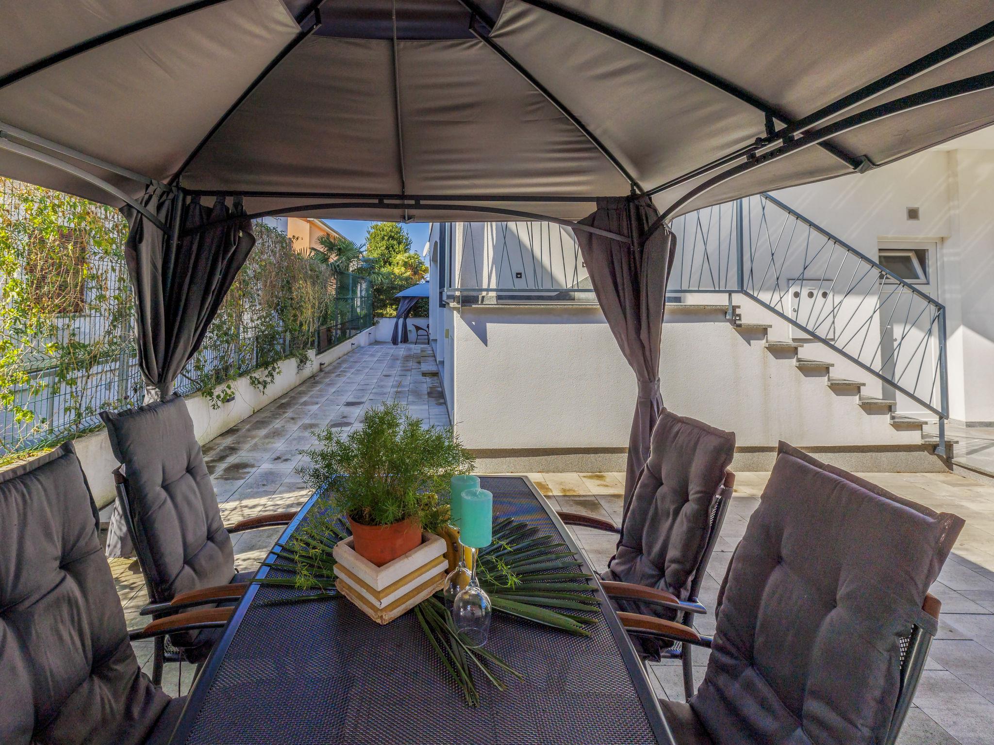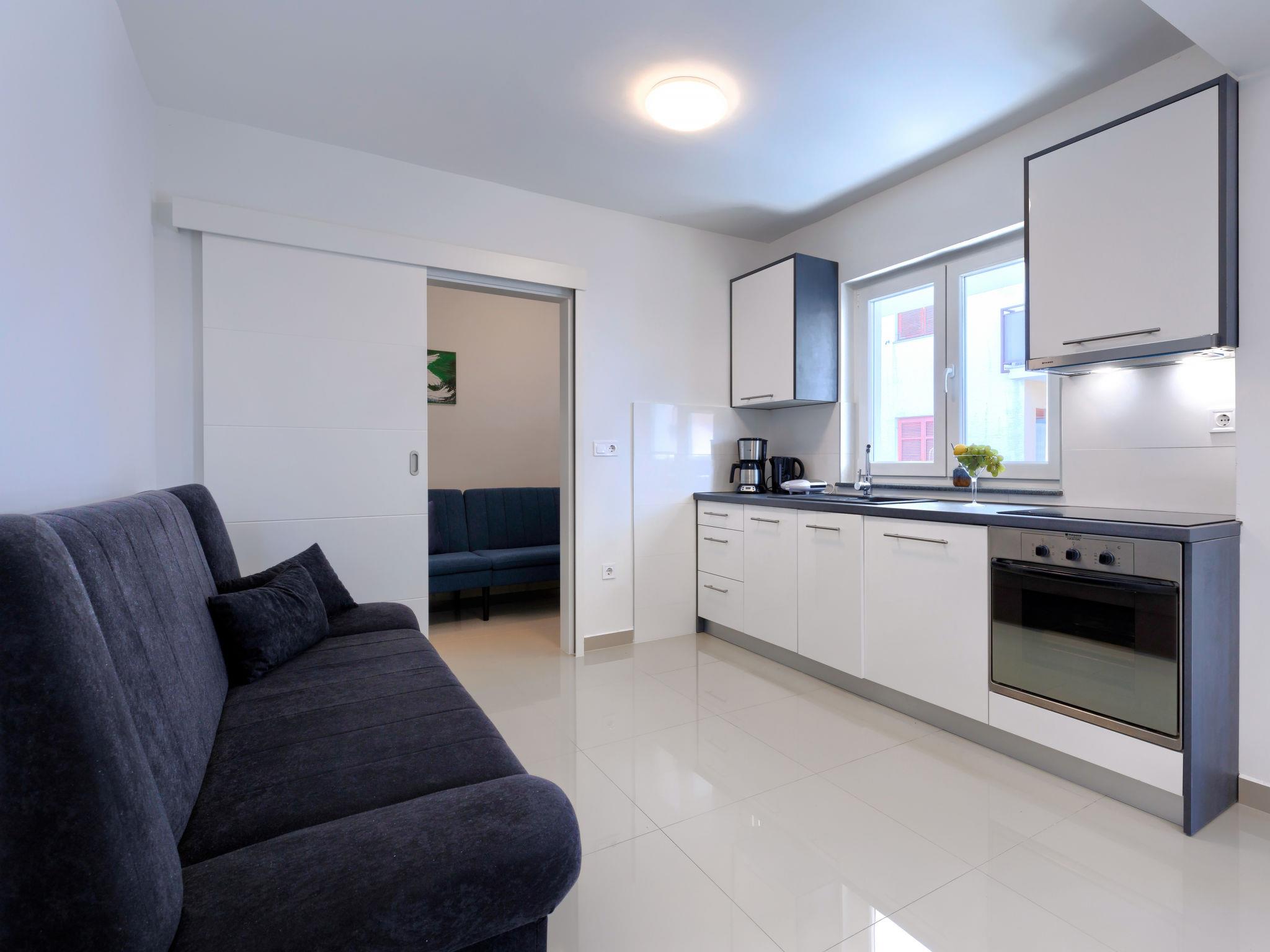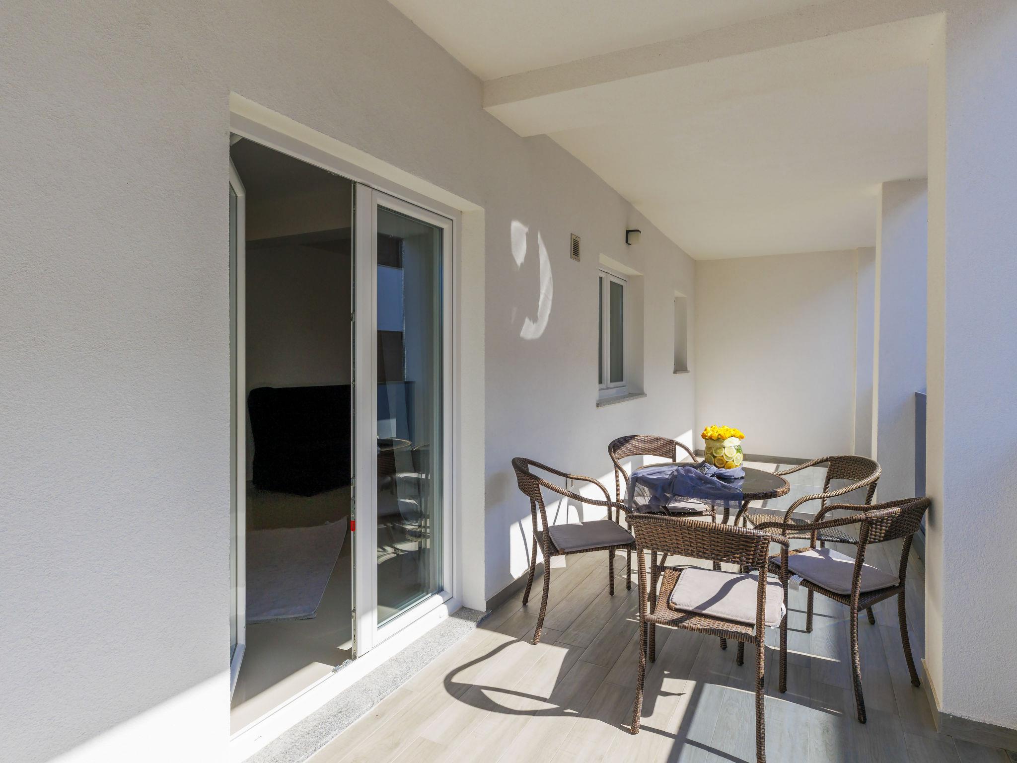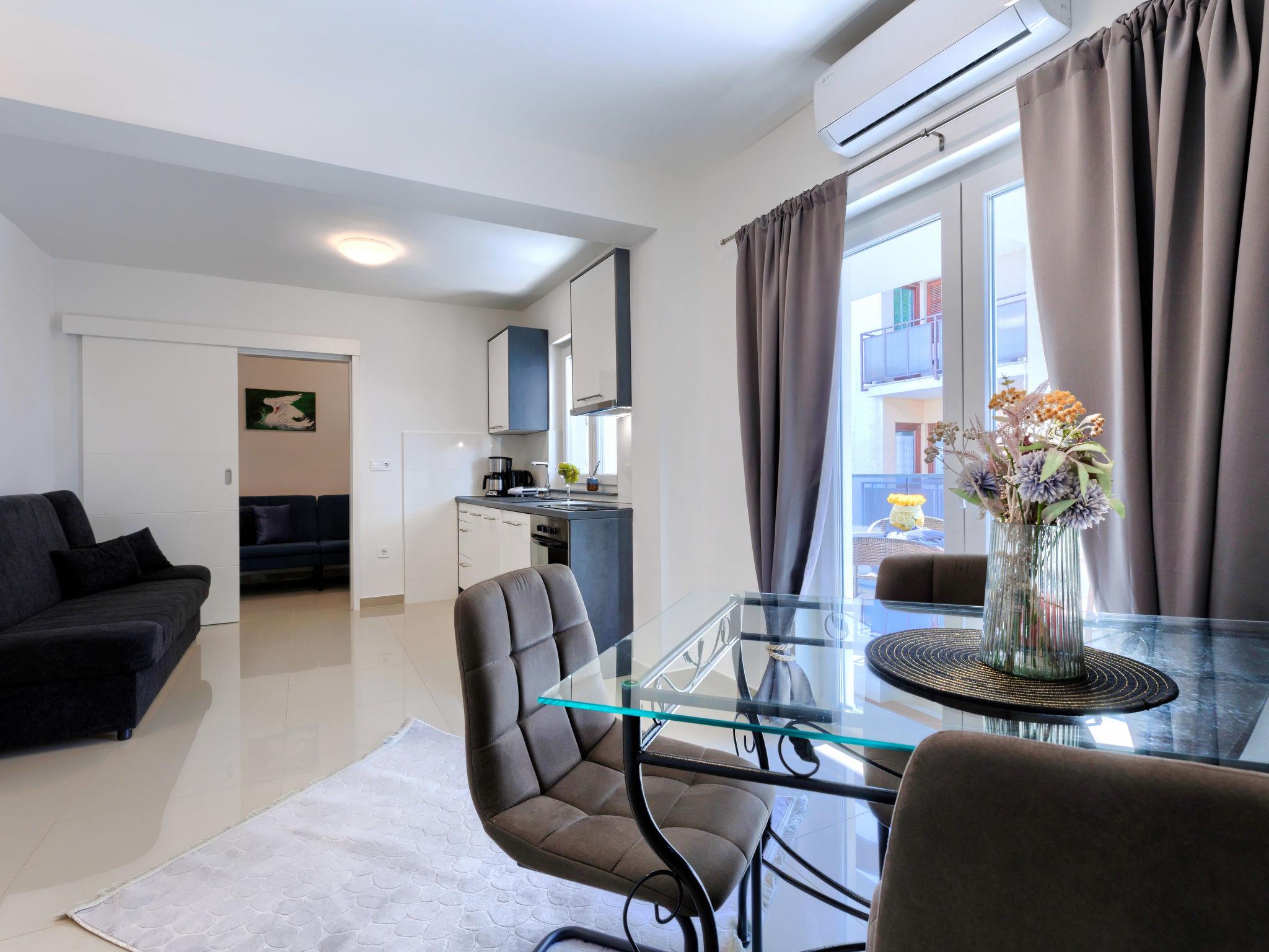"Amra 5", 3-room apartment 40 m2, on the upper floor. Cosy furnishings: living/dining room with 1 sofabed (120 cm, length 200 cm), satellite TV and air conditioning. Exit to the terrace. 1 room with 1 sofabed (120 cm, length 190 cm). 1 room with 1 french bed (160 cm, length 200 cm). Open kitchen (oven, dishwasher, 4 ceramic glass hob hotplates, toaster, kettle, electric coffee machine). Shower/WC. Forced-air heating. Terrace 12 m2, roofed. Facilities: washing machine, iron, hair dryer. Internet (WiFi, free). Parking (1 car) at the house.