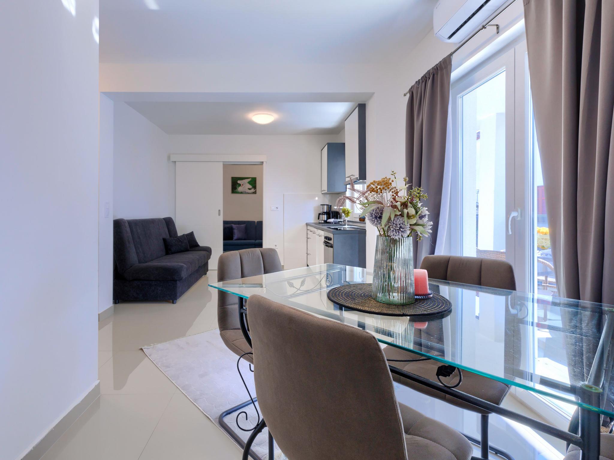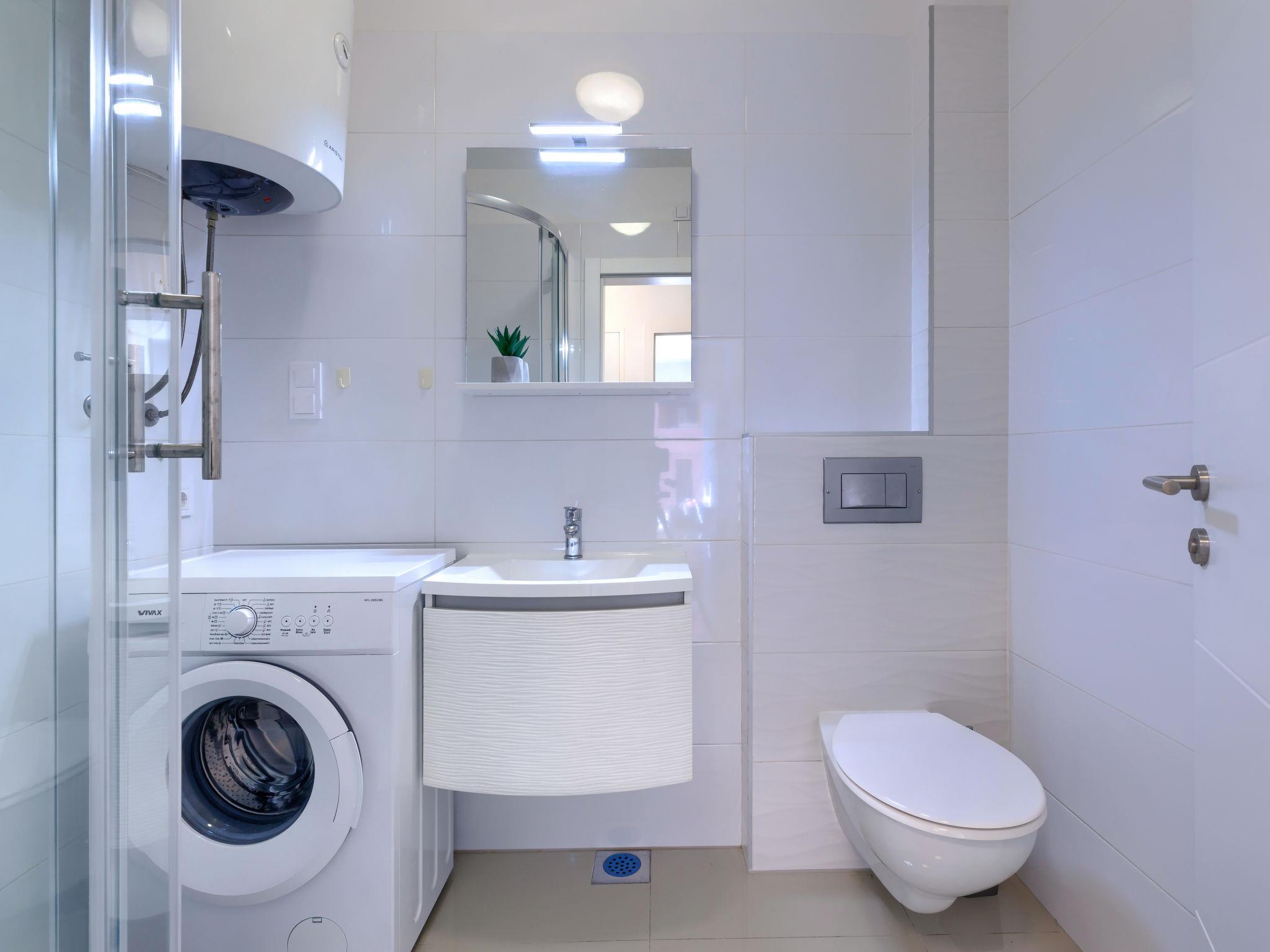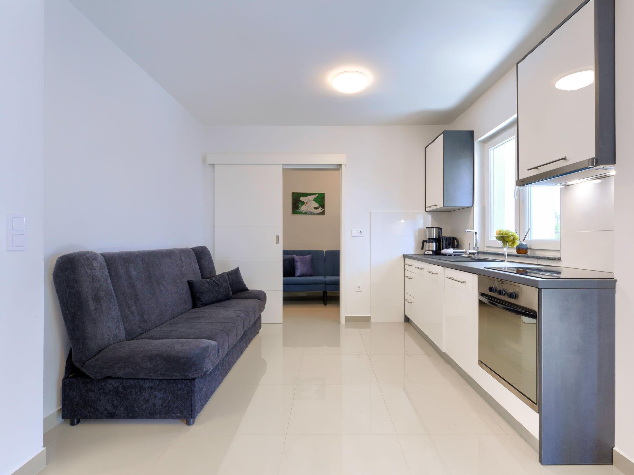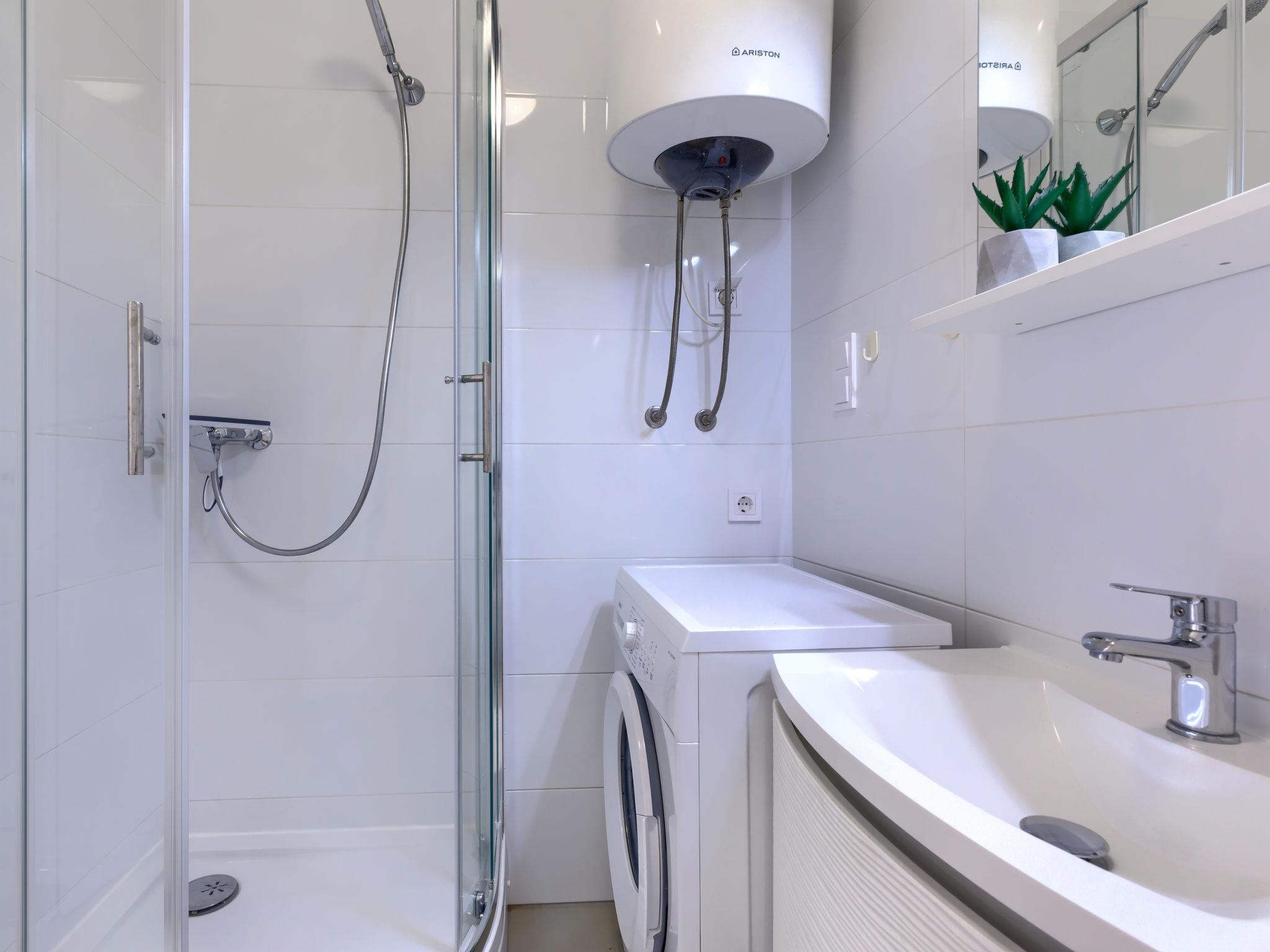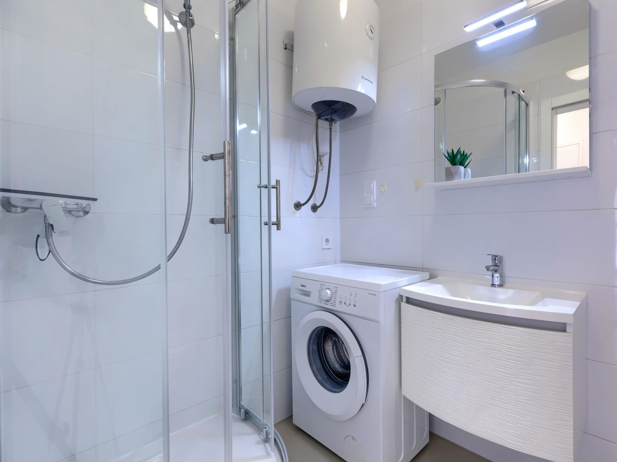 "Amra 5", 3-room apartment 40 m2, on the upper floor. Cosy furnishings: living/dining room with 1 sofabed (120 cm, length 200 cm), satellite TV and air conditioning. Exit to the terrace. 1 room with 1 sofabed (120 cm, length 190 cm). 1 room with 1 french bed (160 cm, length 200 cm). Open kitchen (oven, dishwasher, 4 ceramic glass hob hotplates, toaster, kettle, electric coffee machine). Shower/WC. Forced-air heating. Terrace 12 m2, roofed. Facilities: washing machine, iron, hair dryer. Internet (WiFi, free). Parking (1 car) at the house.