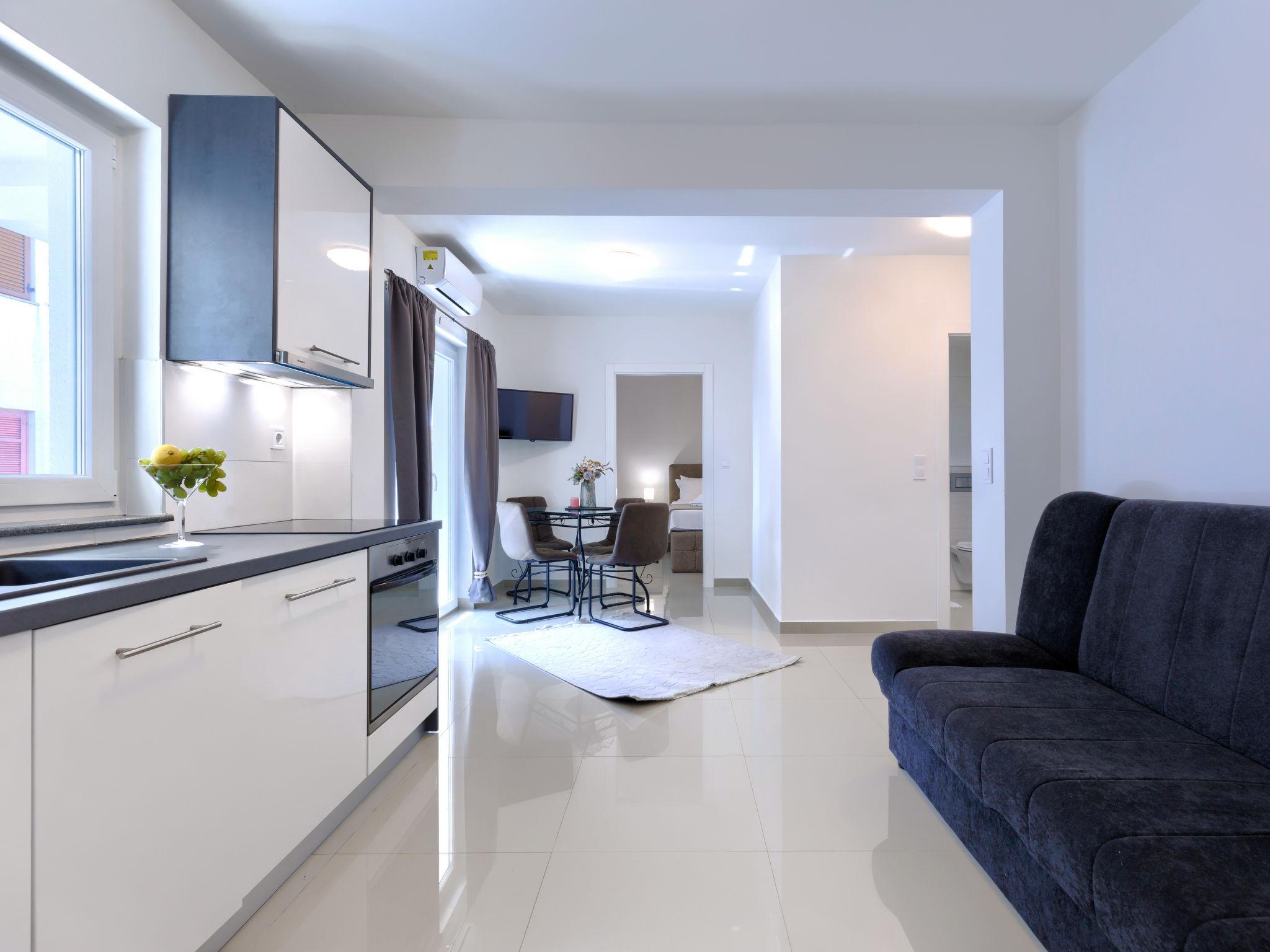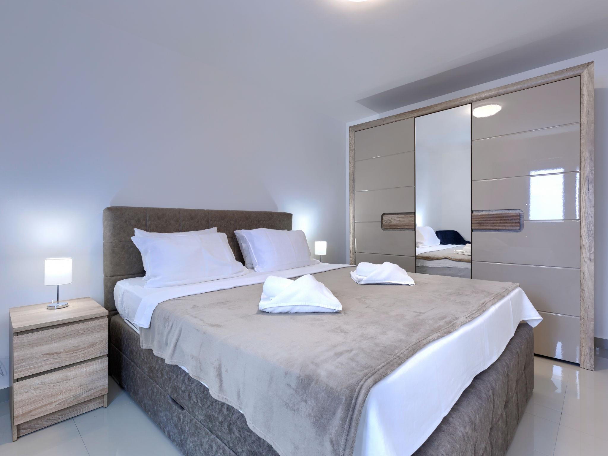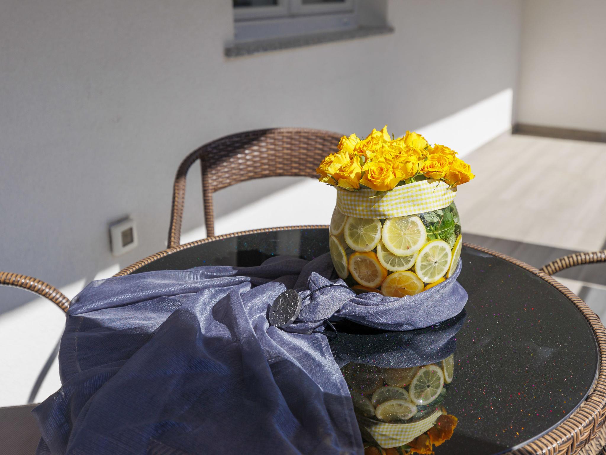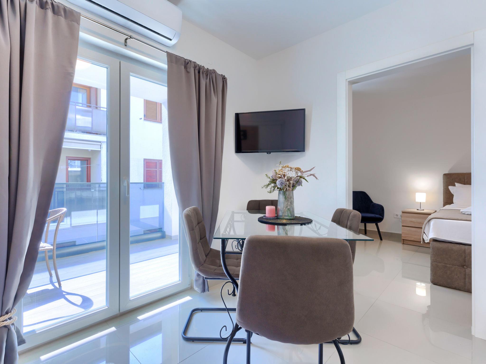"Amra 5", 3-room apartment 40 m2, on the upper floor. Cosy furnishings: living/dining room with 1 sofabed (120 cm, length 200 cm), satellite TV and air conditioning. Exit to the terrace. 1 room with 1 sofabed (120 cm, length 190 cm). 1 room with 1 french bed (160 cm, length 200 cm). Open kitchen (oven, dishwasher, 4 ceramic glass hob hotplates, toaster, kettle, electric coffee machine). Shower/WC. Forced-air heating. Terrace 12 m2, roofed. Facilities: washing machine, iron, hair dryer. Internet (WiFi, free). Parking (1 car) at the house.