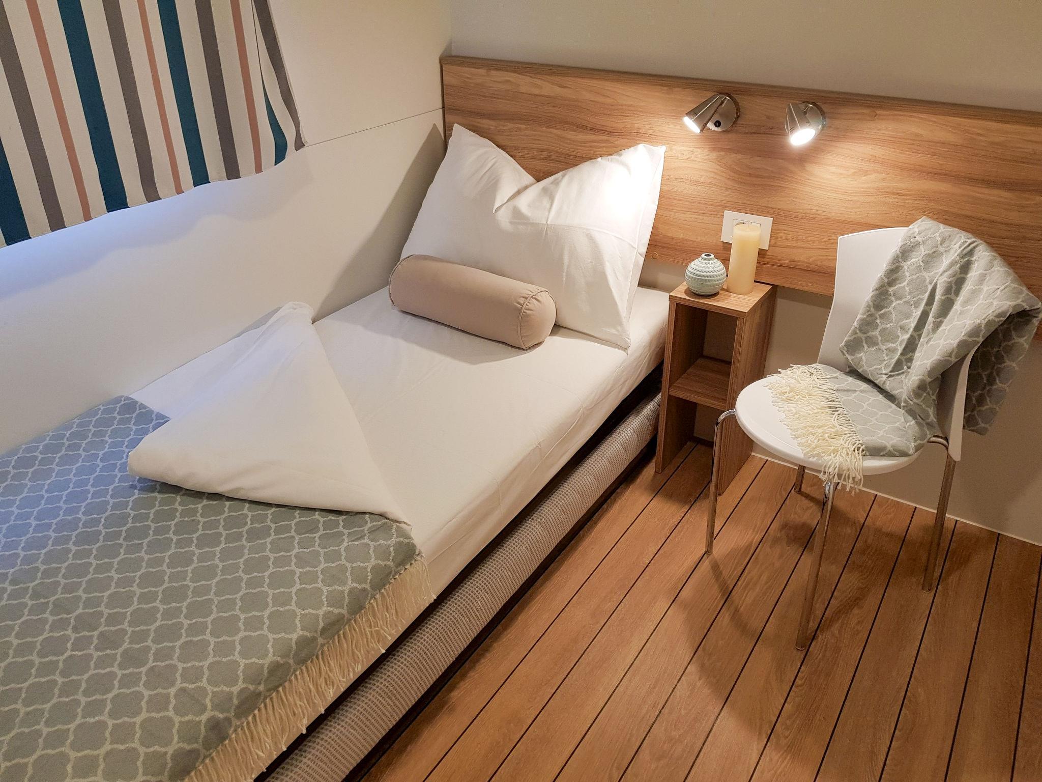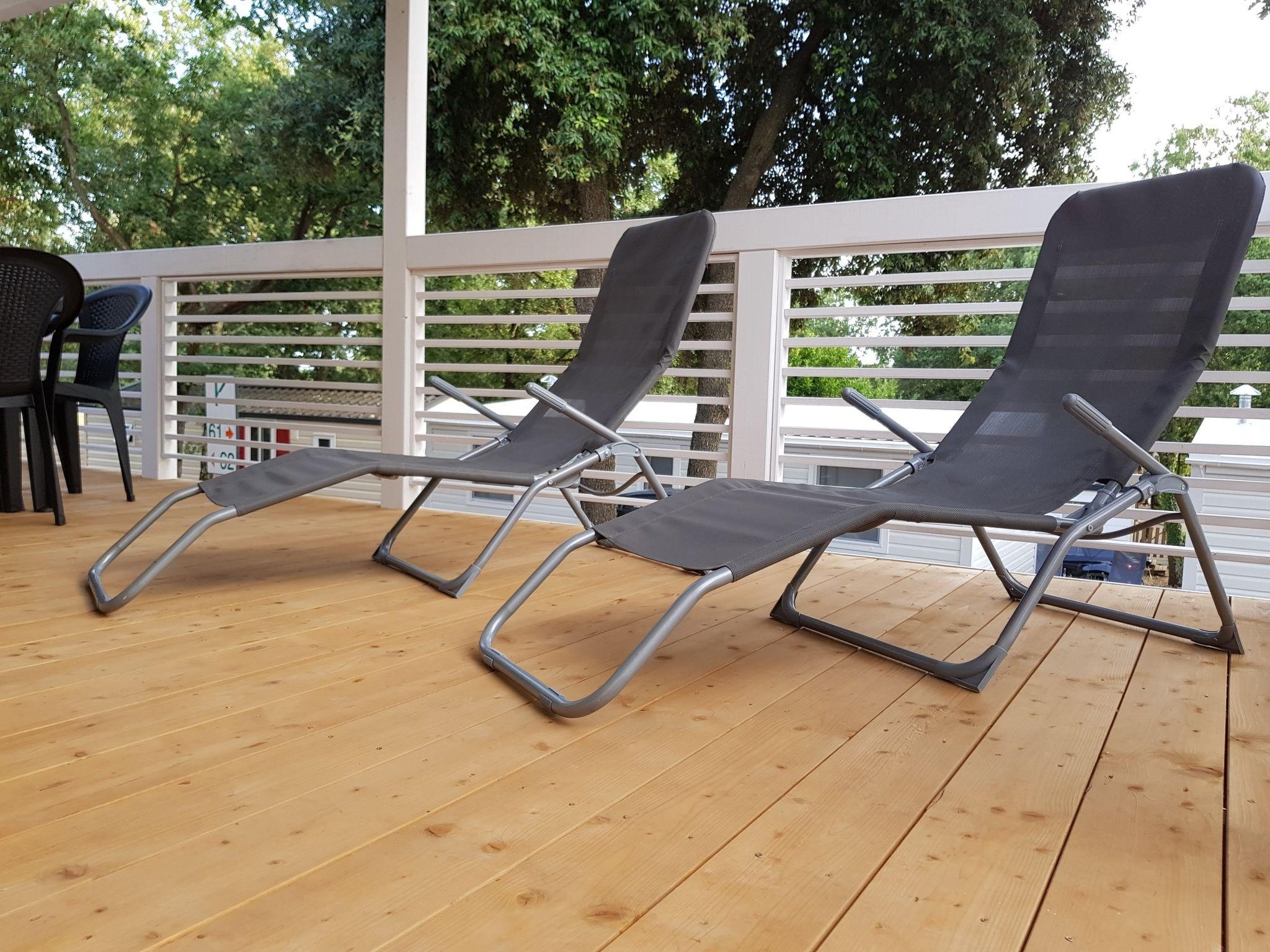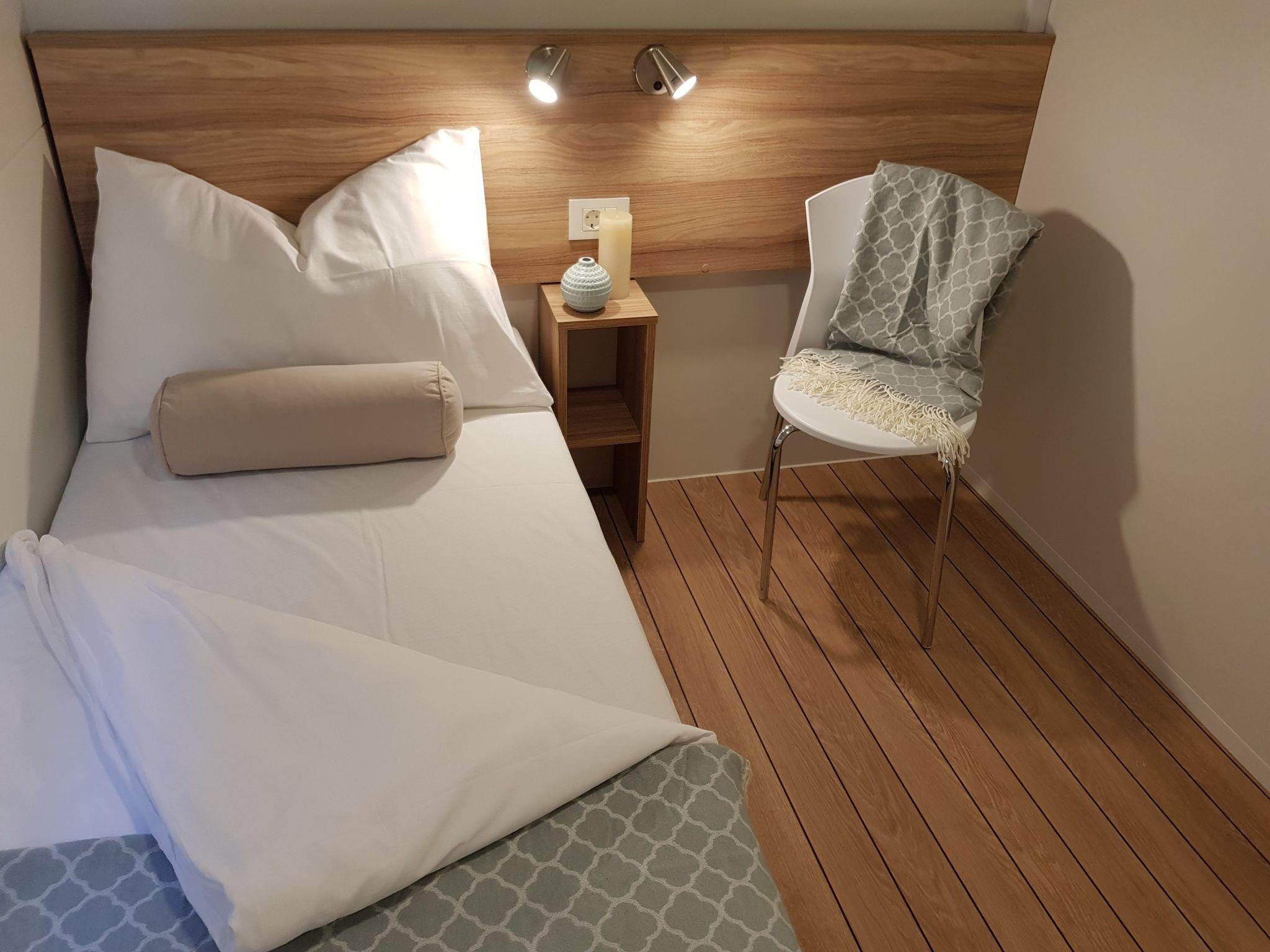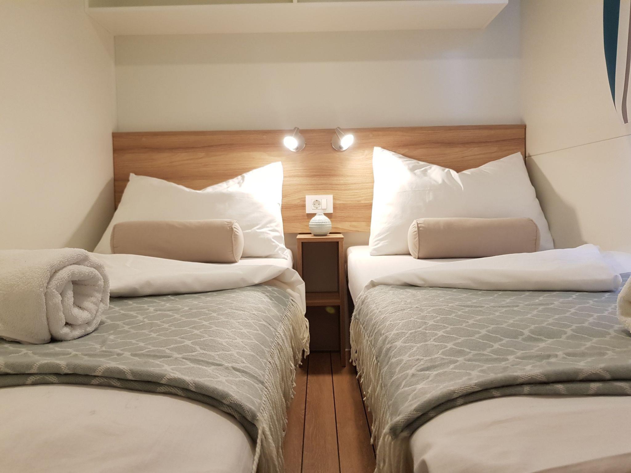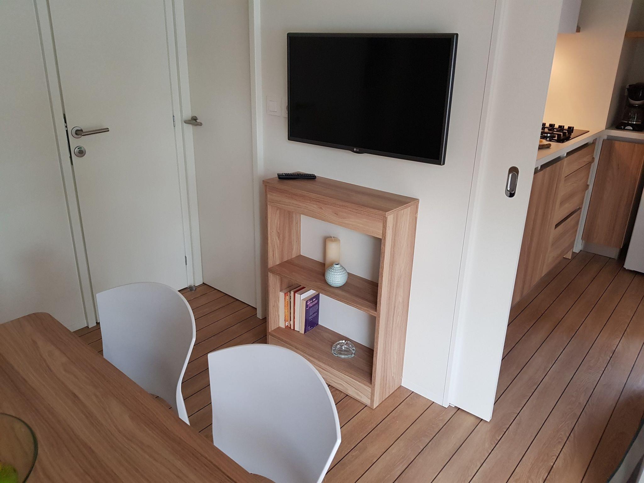 4-room mobile home 32 m2. Living/dining room with satellite TV and air conditioning. Exit to the terrace. 1 room with 1 french bed (1 x 160 cm, length 200 cm). 2 rooms, each room with 2 beds (80 cm, length 200 cm). Open kitchen (2 hot plates, 2 gas rings, kettle, microwave, freezer, electric coffee machine). Shower/WC, sep. WC. Terrace 15 m2. Terrace furniture, deck chairs (2). Facilities: children's high chair (extra). Internet (WiFi, free). Please note: non-smoking house. The property is one of a type of property or apartment. The mobile homes are situated 500 - 550 m from the sea and the beach. Parking for 1 car by the mobile home (incl.), parking for 2nd car to be paid extra. x