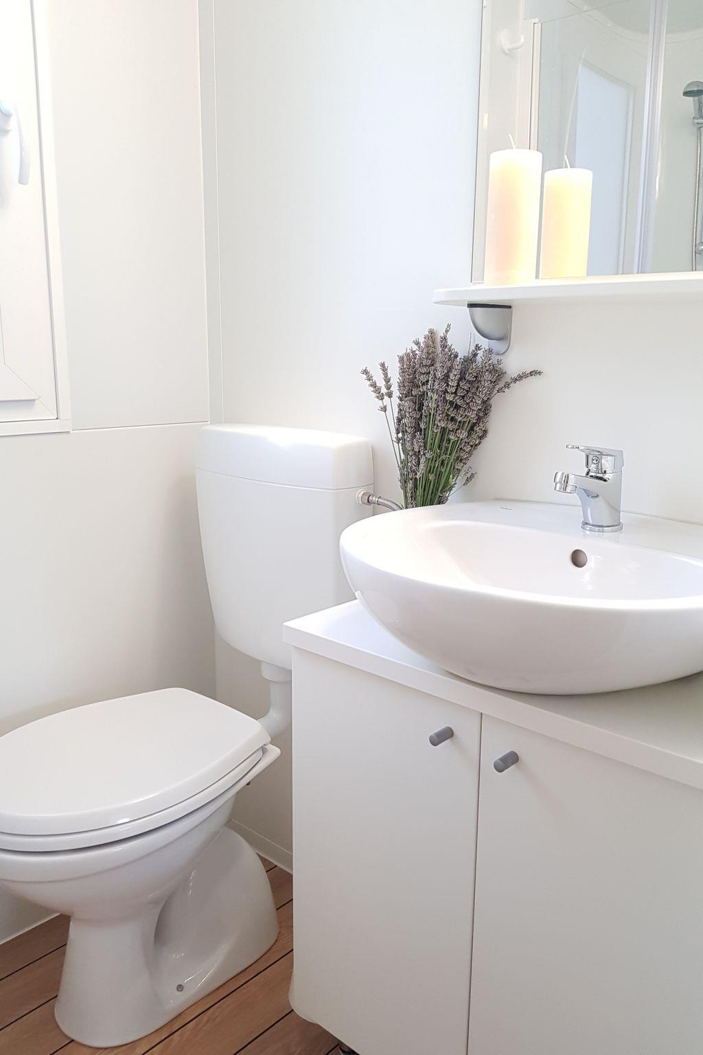 4-room mobile home 32 m2. Living/dining room with satellite TV and air conditioning. Exit to the terrace. 1 room with 1 french bed (1 x 160 cm, length 200 cm). 2 rooms, each room with 2 beds (80 cm, length 200 cm). Open kitchen (2 hot plates, 2 gas rings, kettle, microwave, freezer, electric coffee machine). Shower/WC, sep. WC. Terrace 15 m2. Terrace furniture, deck chairs (2). Facilities: children's high chair (extra). Internet (WiFi, free). Please note: non-smoking house. The property is one of a type of property or apartment. The mobile homes are situated 500 - 550 m from the sea and the beach. Parking for 1 car by the mobile home (incl.), parking for 2nd car to be paid extra.