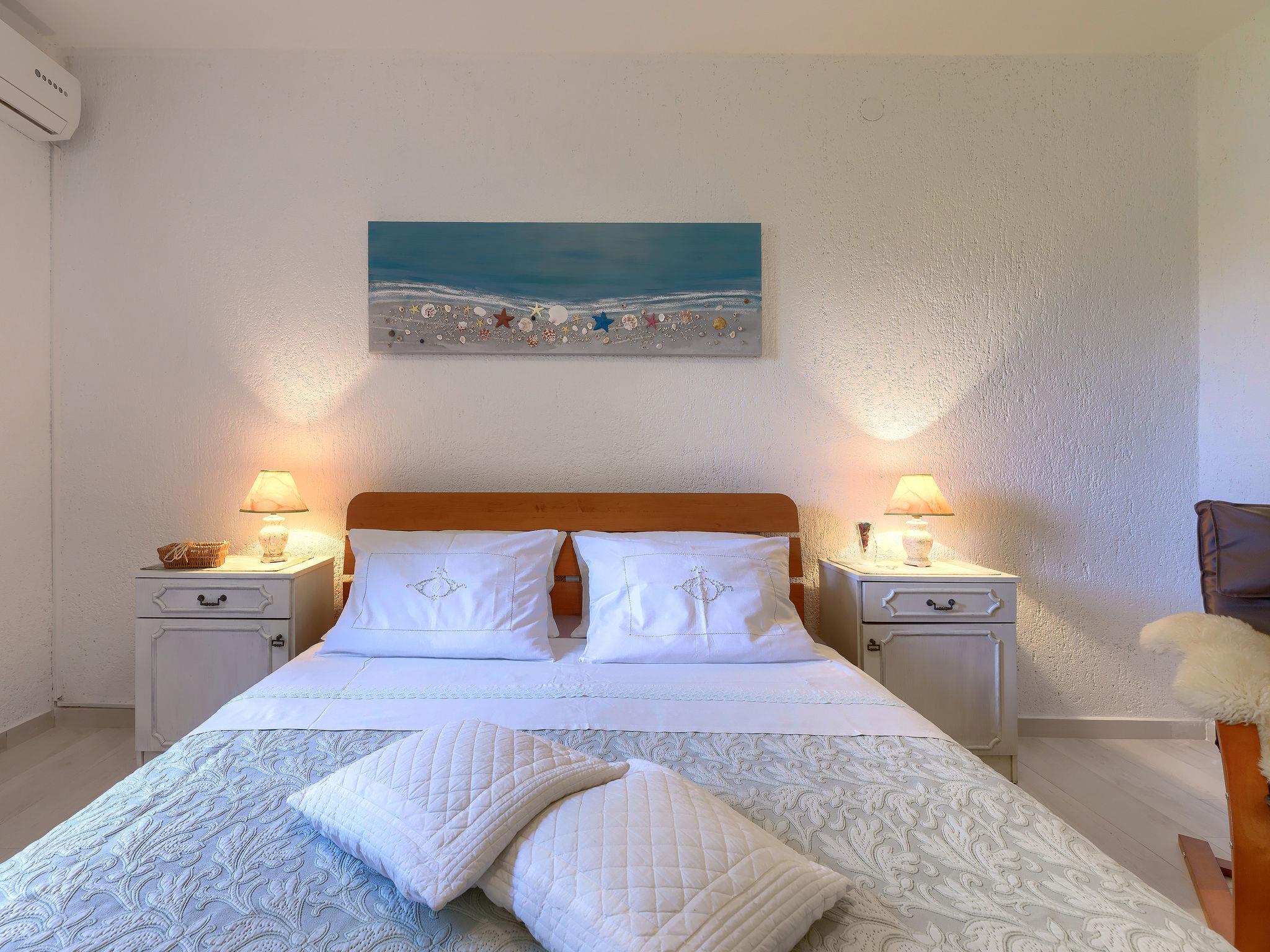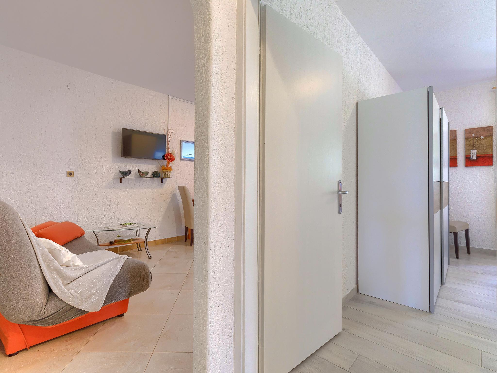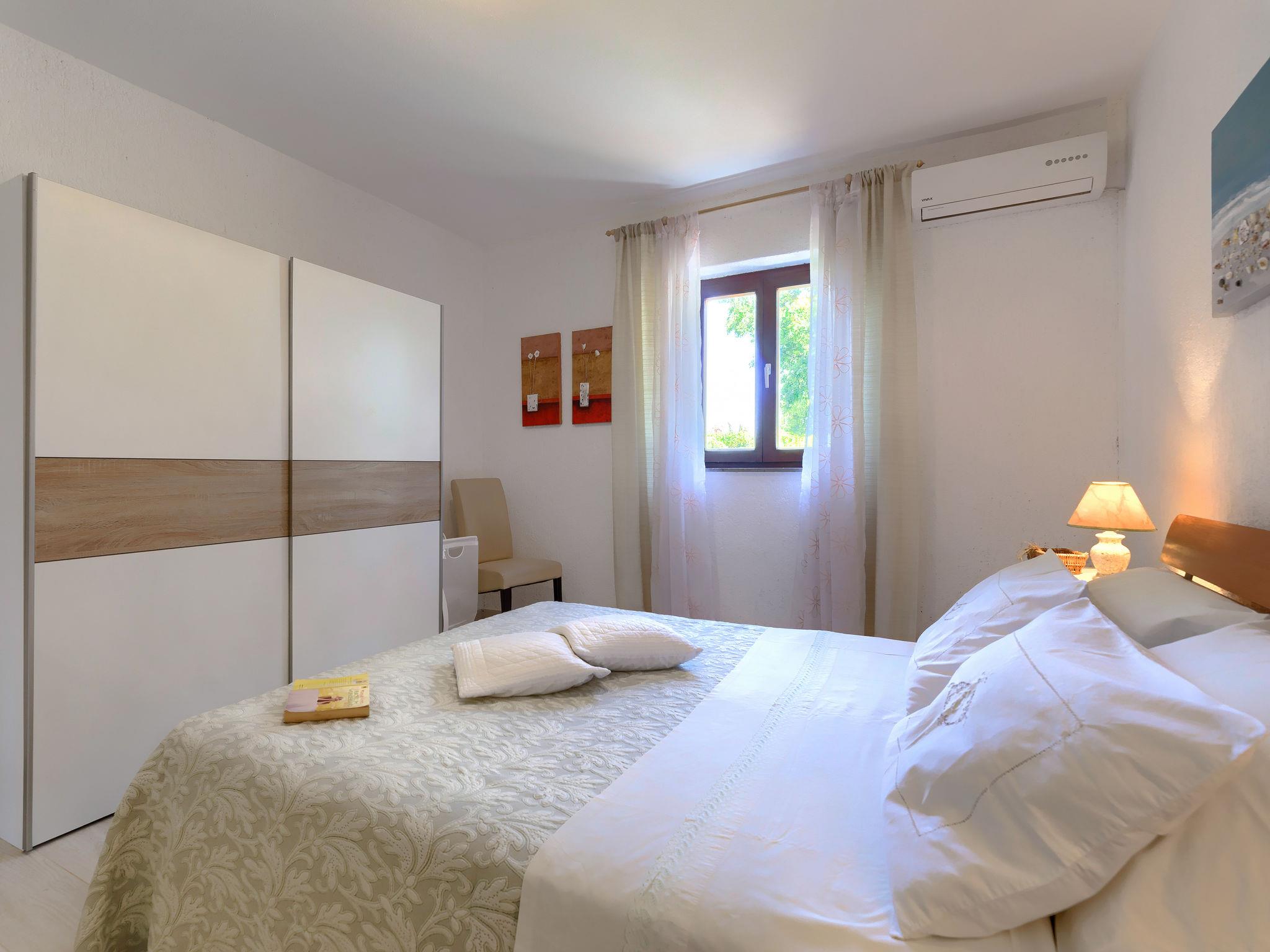 2-room apartment 40 m2 on 1st floor. Living/dining room with satellite TV (flat screen). Exit to the terrace. 1 room with 1 double bed (2 x 90 cm, length 200 cm), air conditioning. Open kitchen (oven, dishwasher, 4 ceramic glass hob hotplates, kettle, microwave, electric coffee machine). Shower/WC. No heating option. Terrace 12 m2 partly roofed. Terrace furniture. Facilities: Internet (WiFi, free).