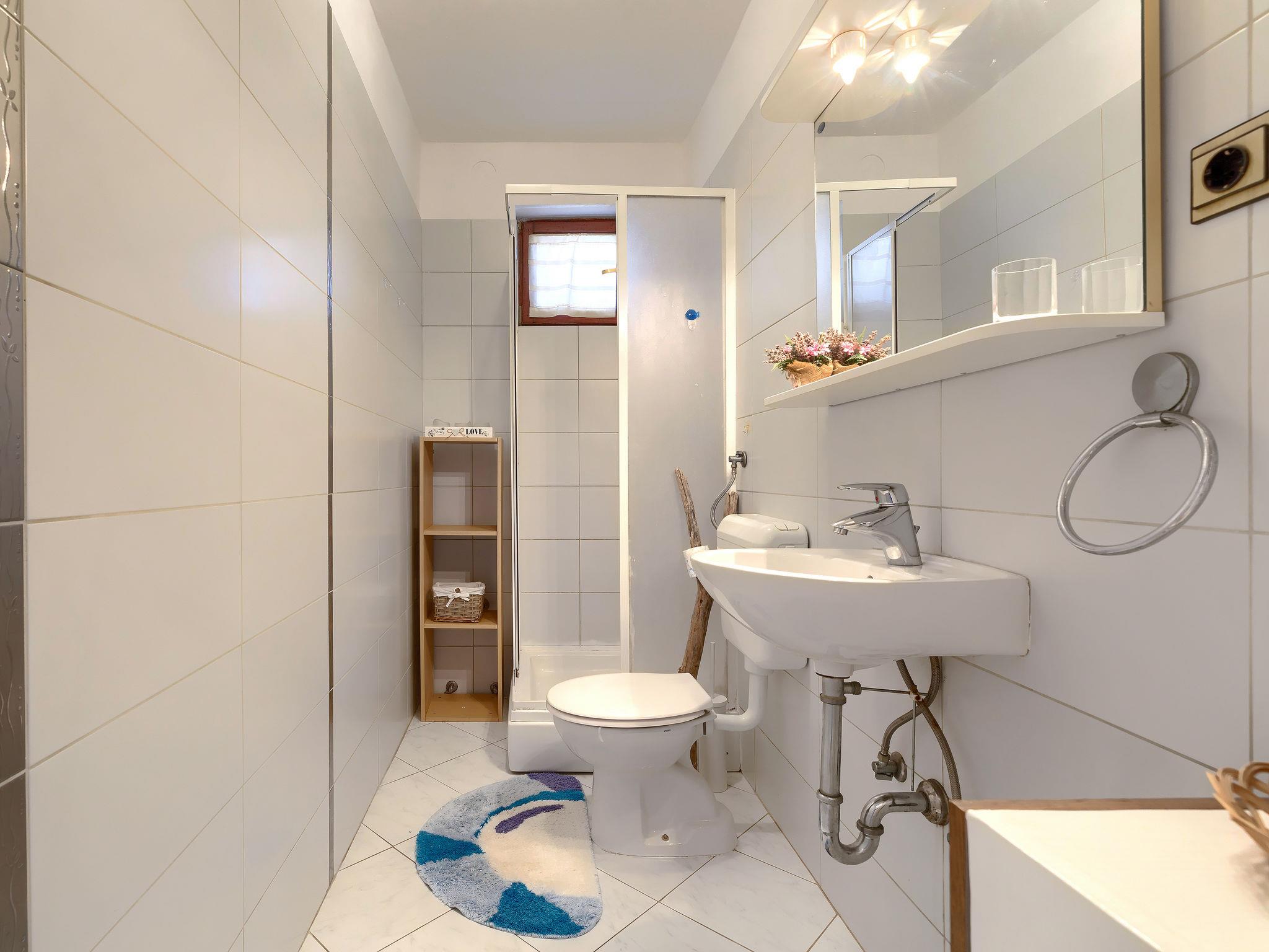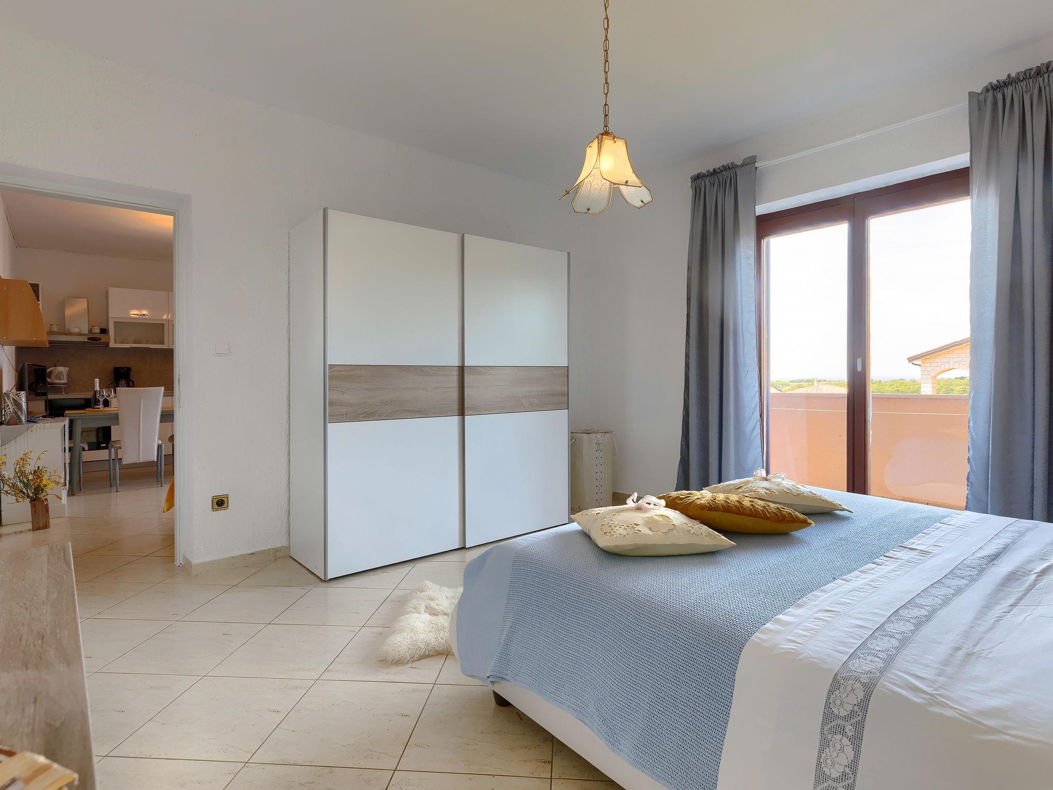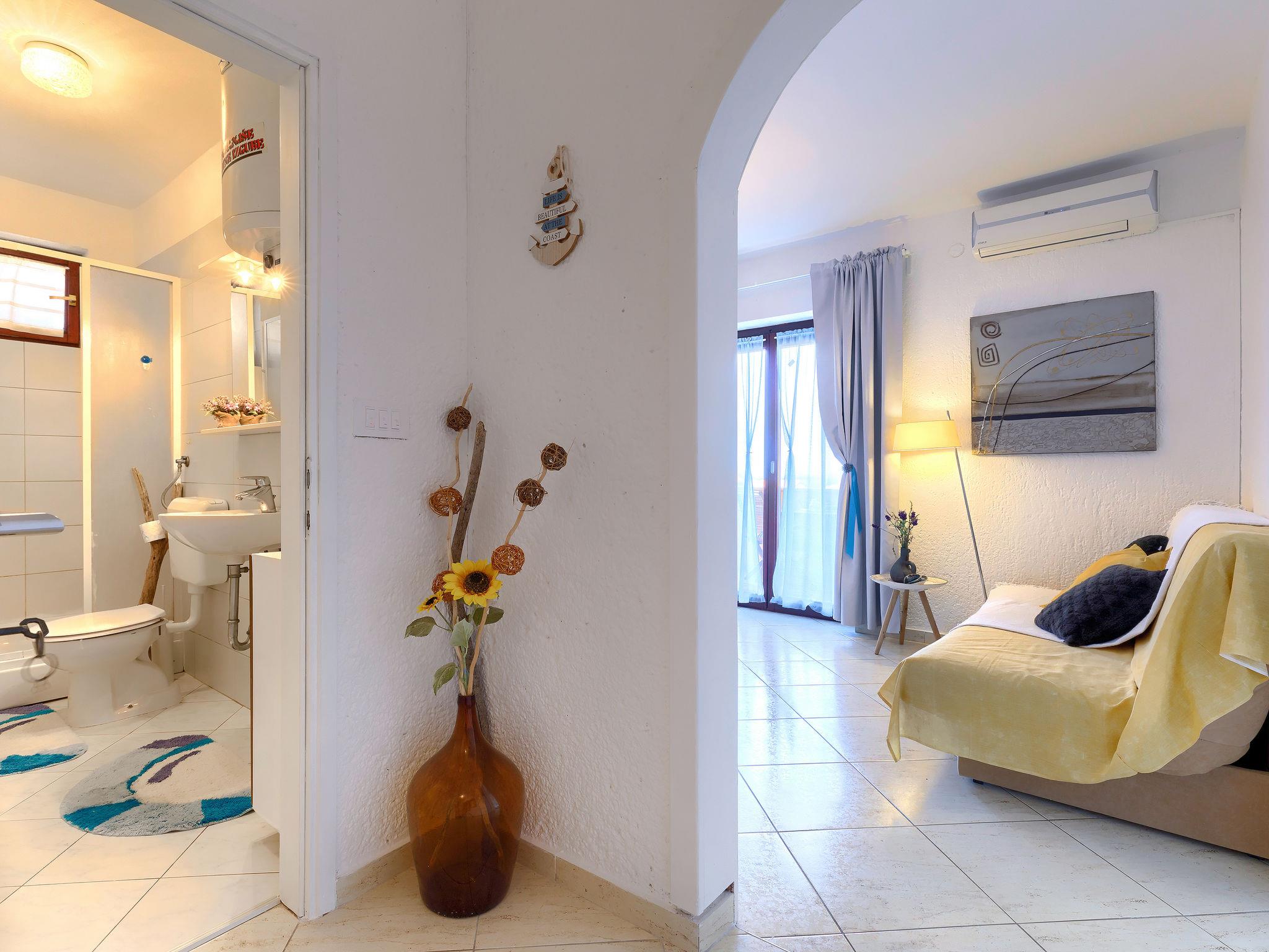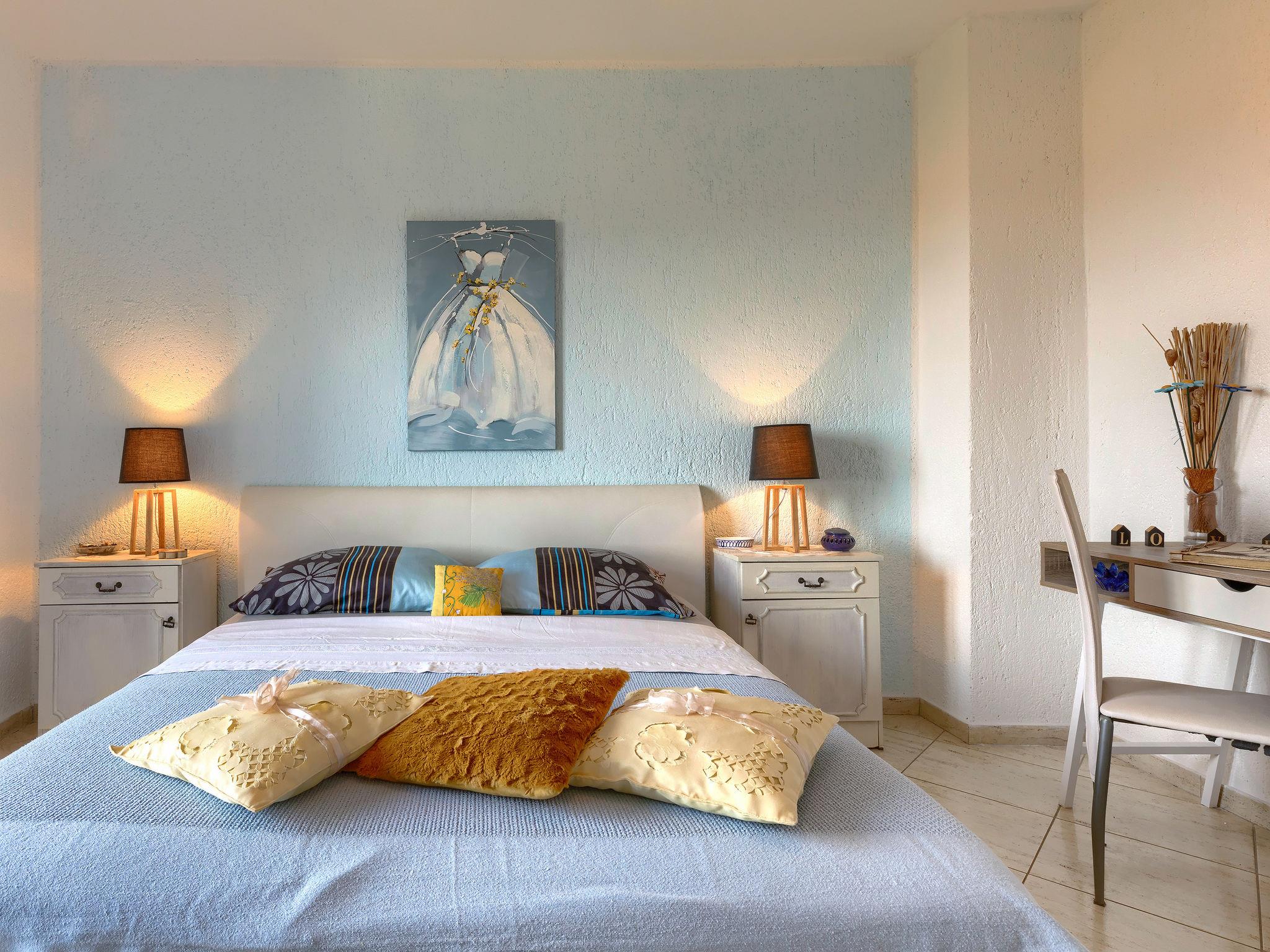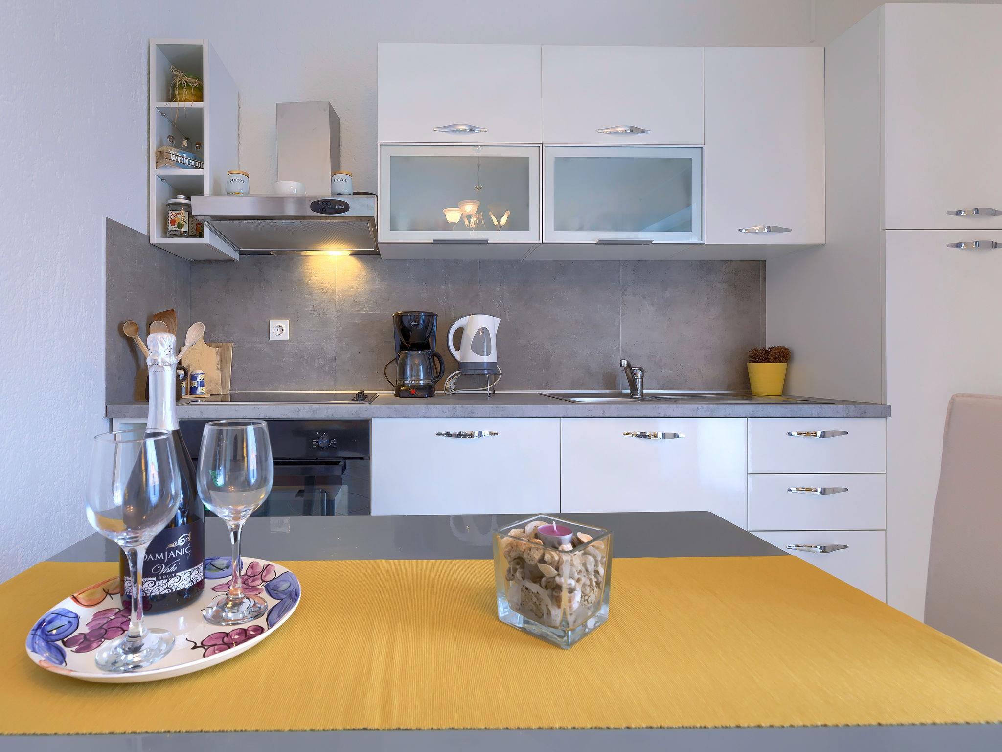 2-room apartment 40 m2 on 1st floor. Living/dining room with satellite TV (flat screen), air conditioning. Exit to the terrace. 1 room with 1 double bed (2 x 90 cm, length 200 cm). Exit to the terrace. Open kitchen (oven, dishwasher, 4 ceramic glass hob hotplates, kettle, microwave, freezer, electric coffee machine). Shower/WC. No heating option. Terrace 12 m2, roofed. Terrace furniture. Distant view of the sea. Facilities: Internet (WiFi, free).
