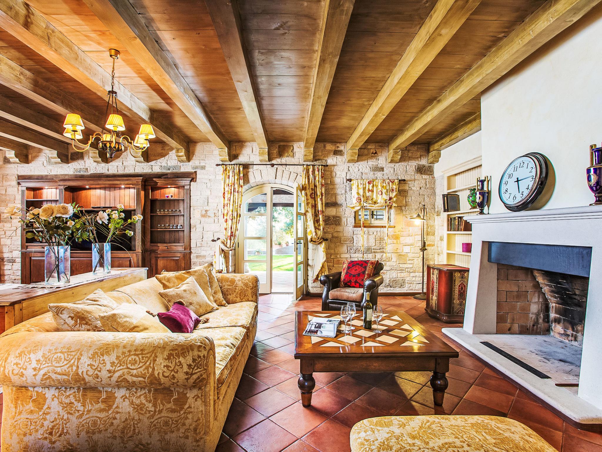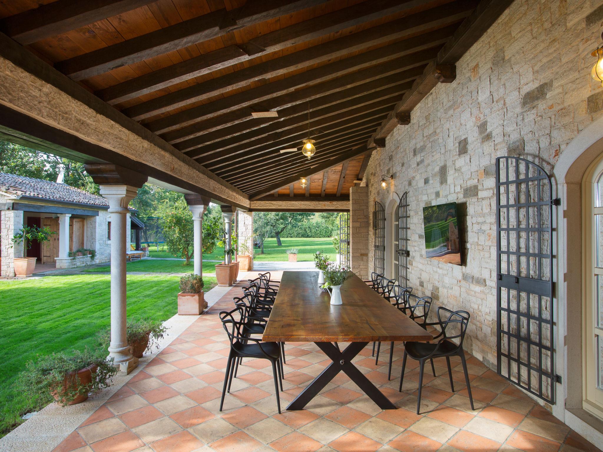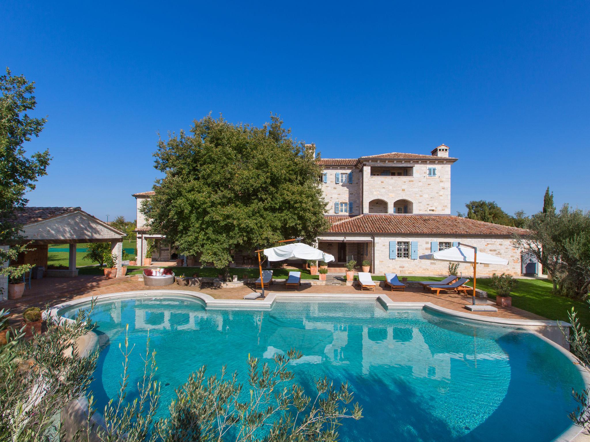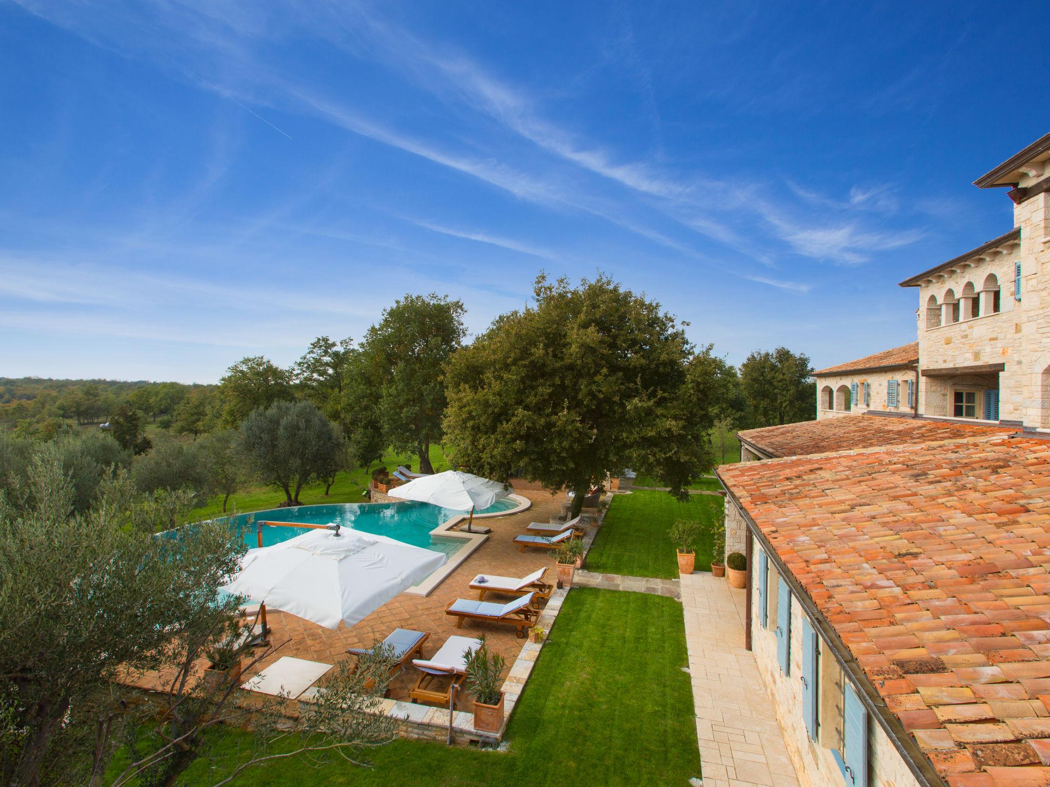 Beautiful, rustic villa "Lou", 2 storeys. In the hamlet Filipini 8 km from the centre of Porec, in a quiet, sunny position, 8 km from the sea, in a cul-de-sac, in the countryside. Private: property 35'000 m2 with lawn and wildlife garden, swimming pool kidney shaped (120 m2, depth 140 - 180 cm, seasonal availability: 01.Apr. - 01.Nov.) with internal staircase. Outdoor shower, patio (15 m2), terrace (20 m2), garden furniture, barbecue, pool maintenance by the owner/gardener. In the house: internet access, billiard table, washing machine. Roofed, parking (for 6 cars) at the house on the premises. Shop 7 km, supermarket 7 km, restaurant 4 km, bus stop 8 km, rocky beach 8 km. Walking paths from the house 50 m, cycle lane 100 m. Nearby attractions: Winery 4 km. Please note: airfield 60 km from the property.