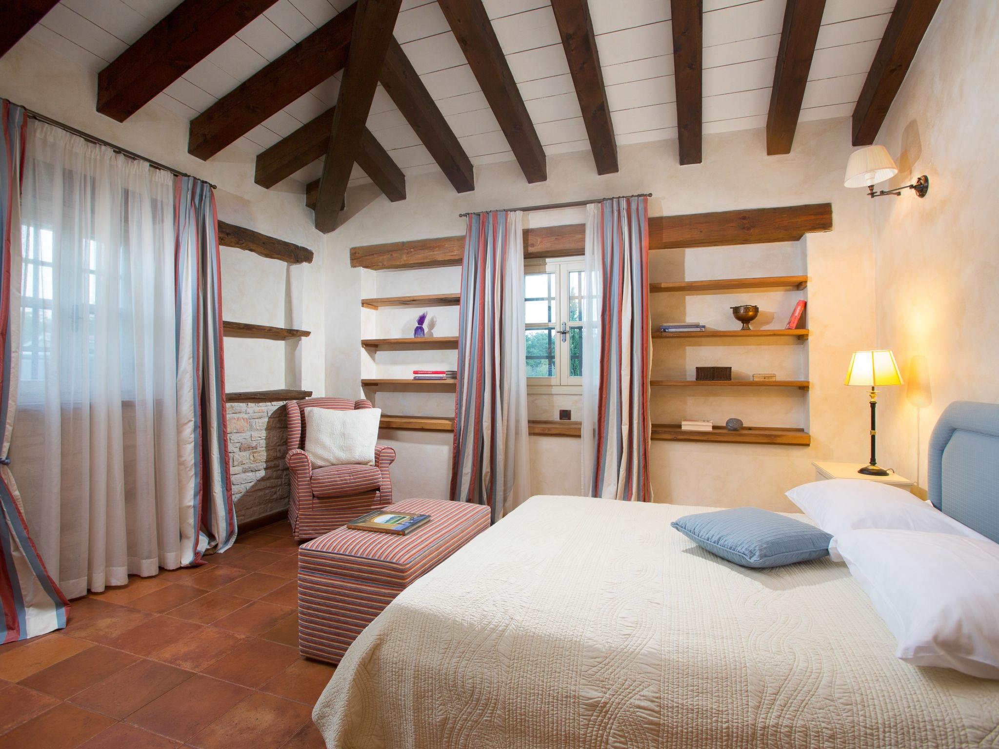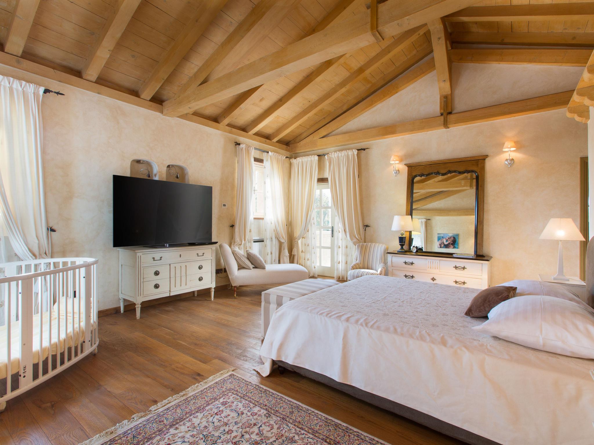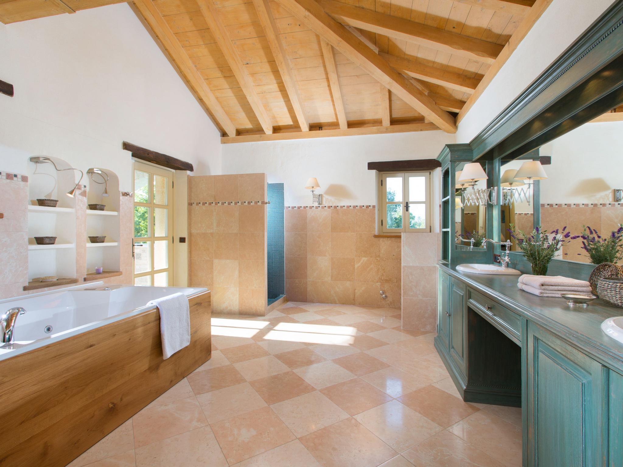 6-room villa 1'000 m2 on 2 levels. Spacious, rustic and cosy furnishings: living/dining room with open-hearth fireplace (only for decoration), cable TV and air conditioning. Exit to the terrace. 1 room with 1 french bed (160 cm, length 200 cm), shower/WC, satellite TV and air conditioning. Open kitchen (oven, dishwasher, 4 induction hot plates, toaster, kettle, microwave, freezer, electric coffee machine, cooking island). Shower/WC. Upper floor: 1 room with 1 french bed (180 cm, length 200 cm), bath/shower/WC, satellite TV and air conditioning. Exit to the terrace. 2 rooms, each room with 1 french bed (180 cm, length 200 cm), bath/shower/WC, satellite TV and air conditioning. 2 rooms, each room with 1 french bed (180 cm, length 200 cm), bath/WC, with corner bath, satellite TV and air conditioning. Forced-air heating. Terrace 60 m2. Terrace furniture, deck chairs. Beautiful view of the countryside. Facilities: iron, hair dryer. Internet (WiFi, free).