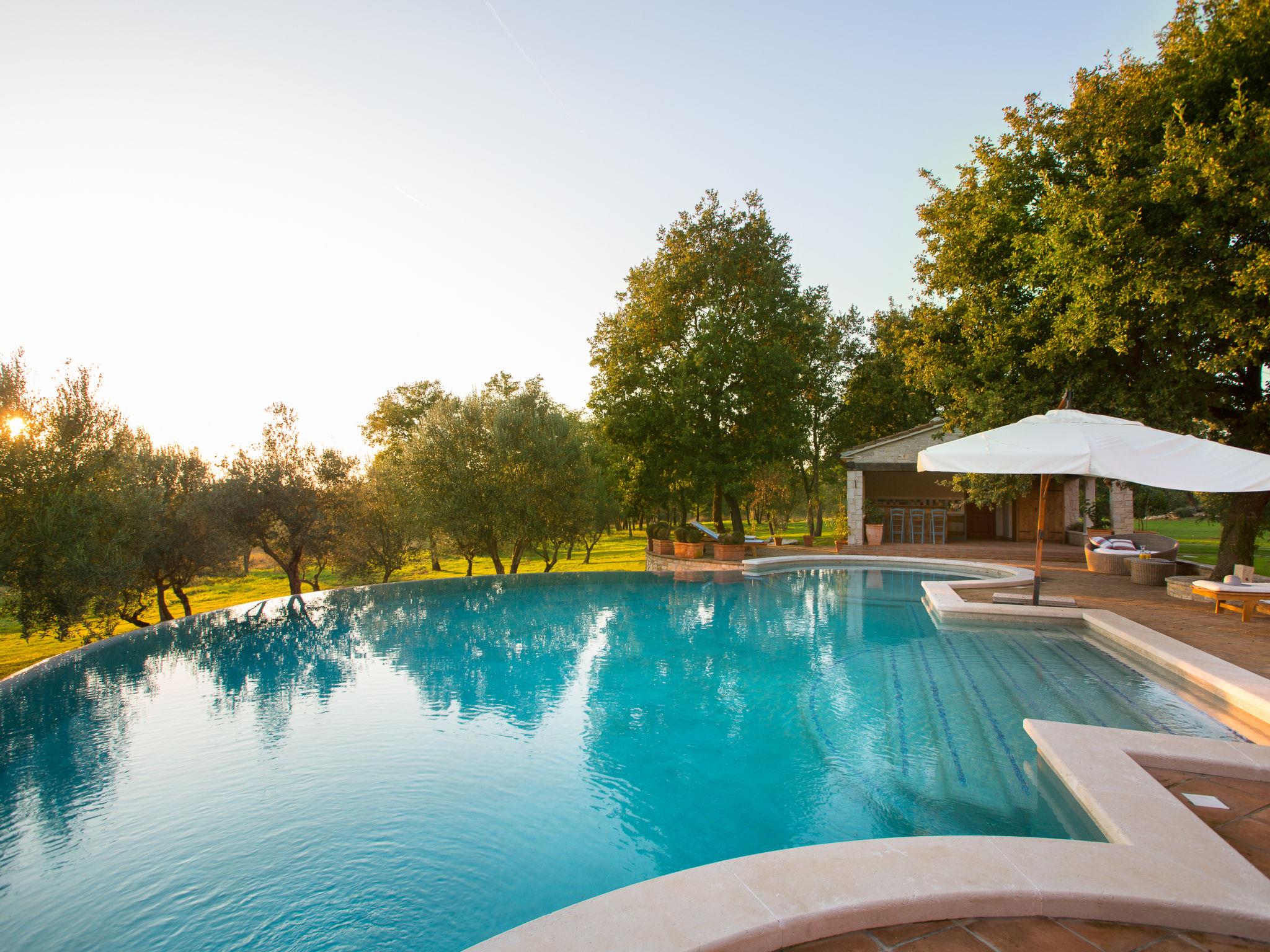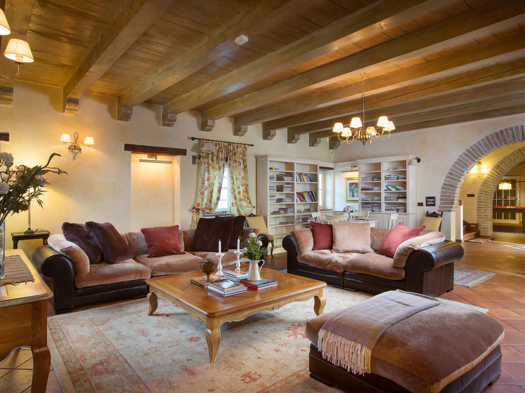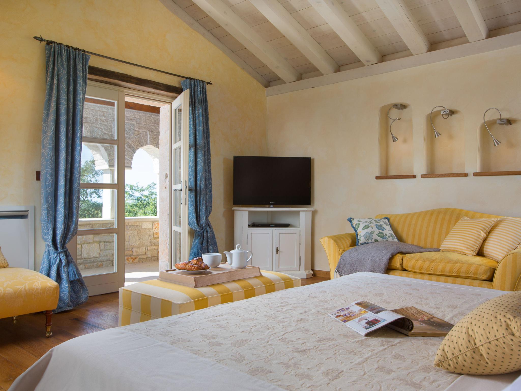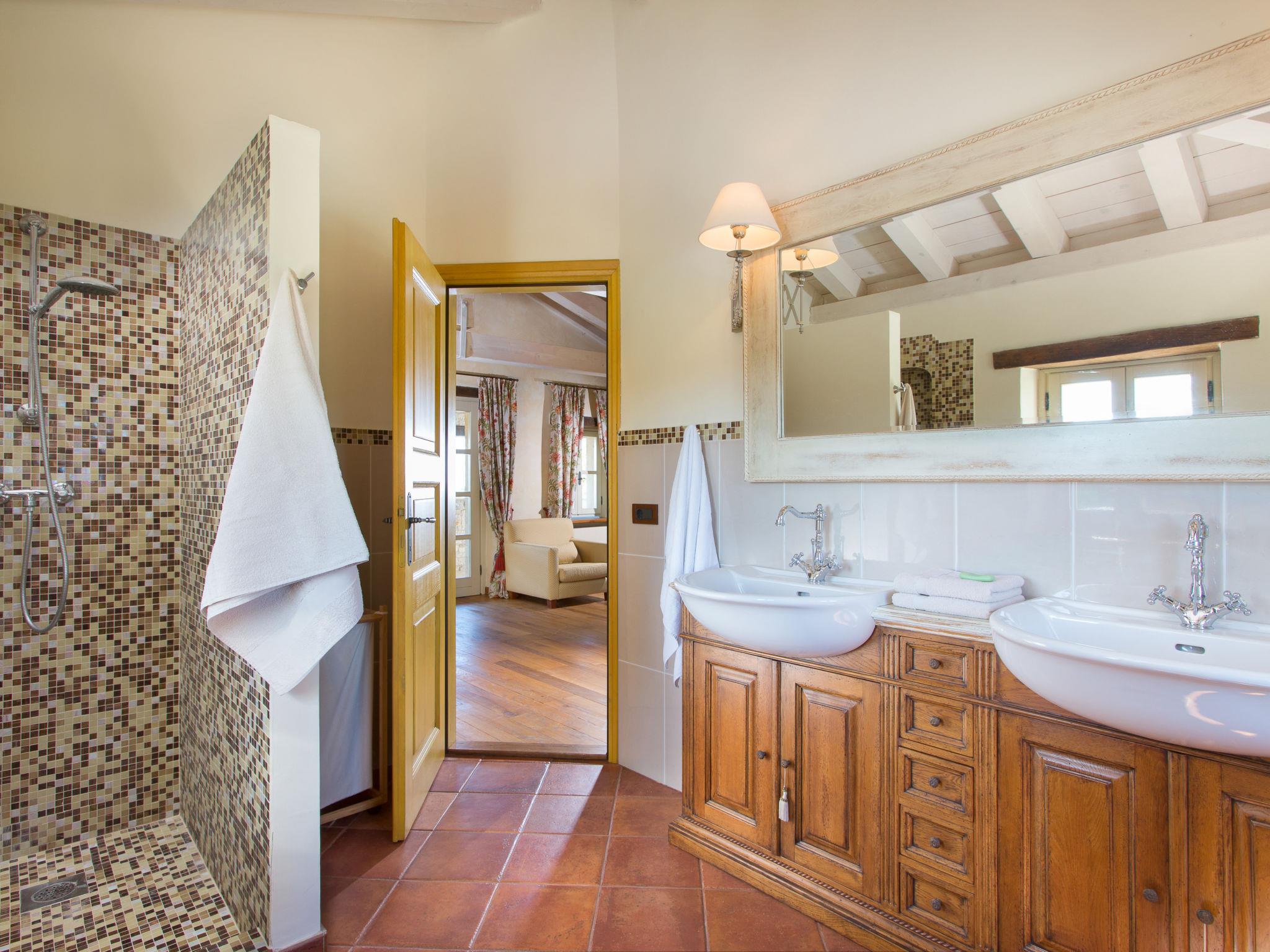 6-room villa 1'000 m2 on 2 levels. Spacious, rustic and cosy furnishings: living/dining room with open-hearth fireplace (only for decoration), cable TV and air conditioning. Exit to the terrace. 1 room with 1 french bed (160 cm, length 200 cm), shower/WC, satellite TV and air conditioning. Open kitchen (oven, dishwasher, 4 induction hot plates, toaster, kettle, microwave, freezer, electric coffee machine, cooking island). Shower/WC. Upper floor: 1 room with 1 french bed (180 cm, length 200 cm), bath/shower/WC, satellite TV and air conditioning. Exit to the terrace. 2 rooms, each room with 1 french bed (180 cm, length 200 cm), bath/shower/WC, satellite TV and air conditioning. 2 rooms, each room with 1 french bed (180 cm, length 200 cm), bath/WC, with corner bath, satellite TV and air conditioning. Forced-air heating. Terrace 60 m2. Terrace furniture, deck chairs. Beautiful view of the countryside. Facilities: iron, hair dryer. Internet (WiFi, free).