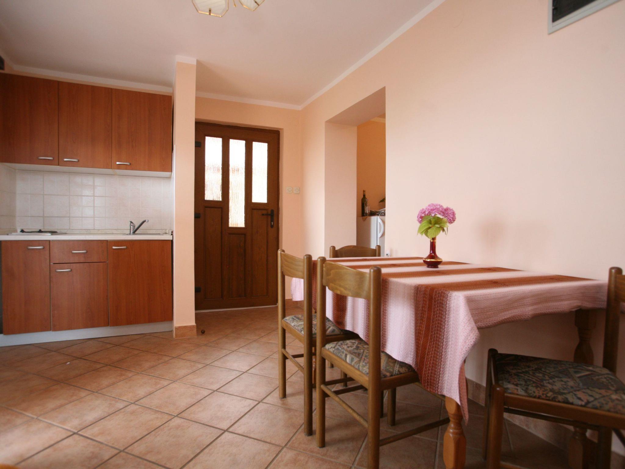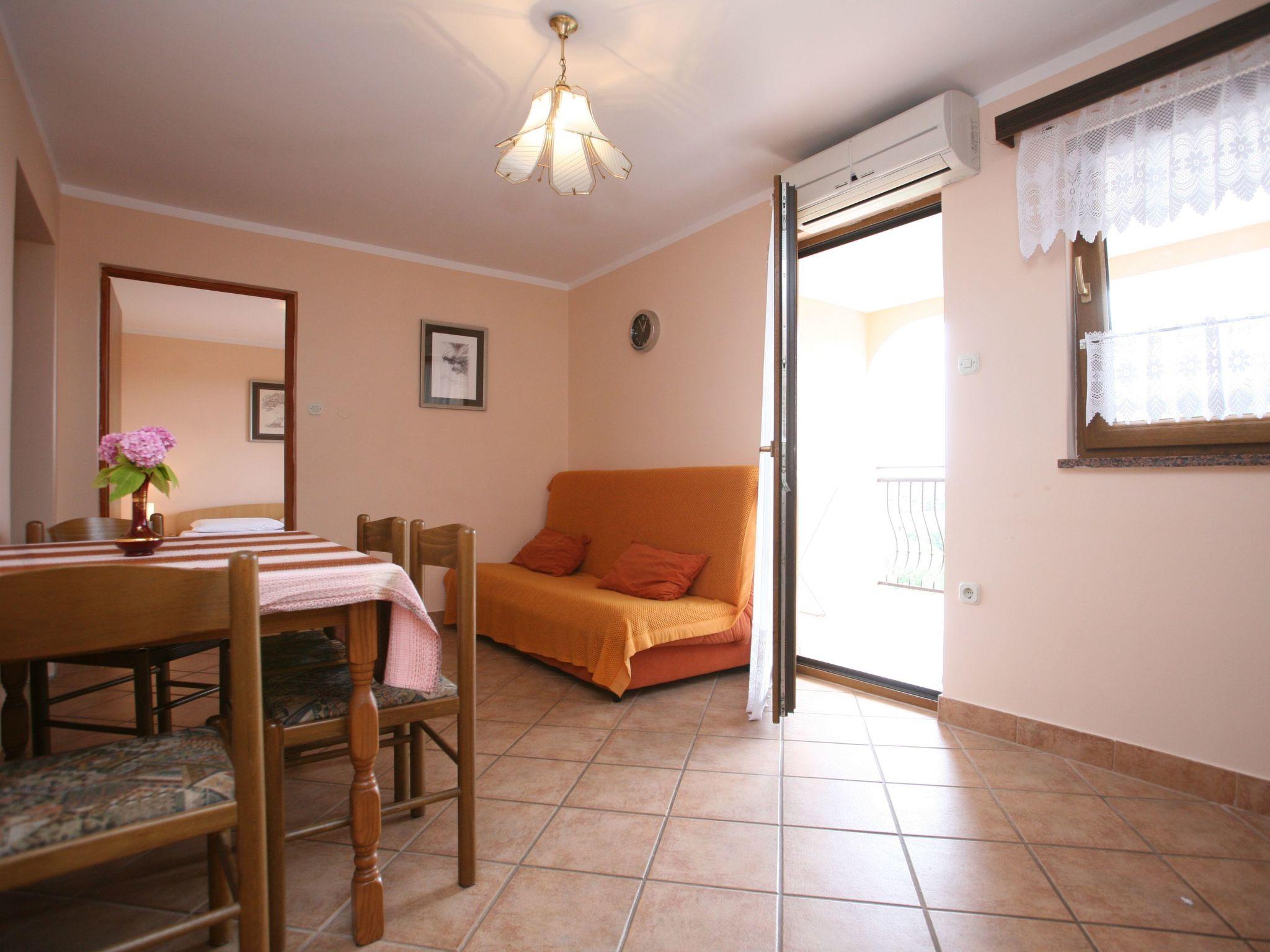Inside, the apartment is equipped with everything you need for a comfortable stay. Air conditioning ensures a pleasant atmosphere throughout, providing a cool respite from the warm Istrien sun. The apartment features two cozy bedrooms for a restful night's sleep and one well-appointed bathroom equipped with a shower and a hairdryer. For your convenience, the kitchen comes complete with a fridge, stove top, filter coffee machine, electric kettle, and sink, making it easy to prepare your favorite meals even while on vacation.