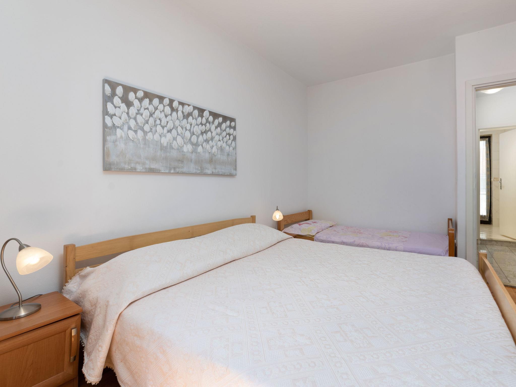 "Ružic", 4-room terraced house 95 m2 on 2 levels. Living/dining room with satellite TV and air conditioning. Exit to the terrace. Open kitchen (1 hot plate, oven, dishwasher, Gas stove, 3 gas rings, toaster, kettle, freezer, electric coffee machine). Shower/WC. Upper floor: 1 room with 1 bed and 1 double bed. Exit to the balcony. 1 room with 1 double bed. Exit to the balcony. 1 room with 2 beds. Exit to the balcony. Shower/WC. No heating option. Balcony, terrace 20 m2 partly roofed, lawn. Terrace furniture, barbecue, deck chairs. Facilities: washing machine. Internet (WiFi, free). Please note: non-smoking house.