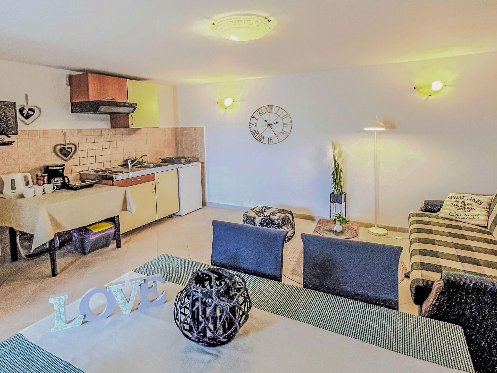 2-room terraced house 42 m2 on 2 levels. Living/dining room with satellite TV and air conditioning. Exit to the terrace. Open kitchen (2 hot plates, oven, toaster, kettle, electric coffee machine). Shower/WC. Upper floor: (steep stair), 1 room with 1 bed, 1 double bed and air conditioning. Exit to the balcony. Forced-air heating. Balcony. Facilities: Internet (WiFi, free). Please note: non-smoking house. Maximum 1 pet/ dog allowed.