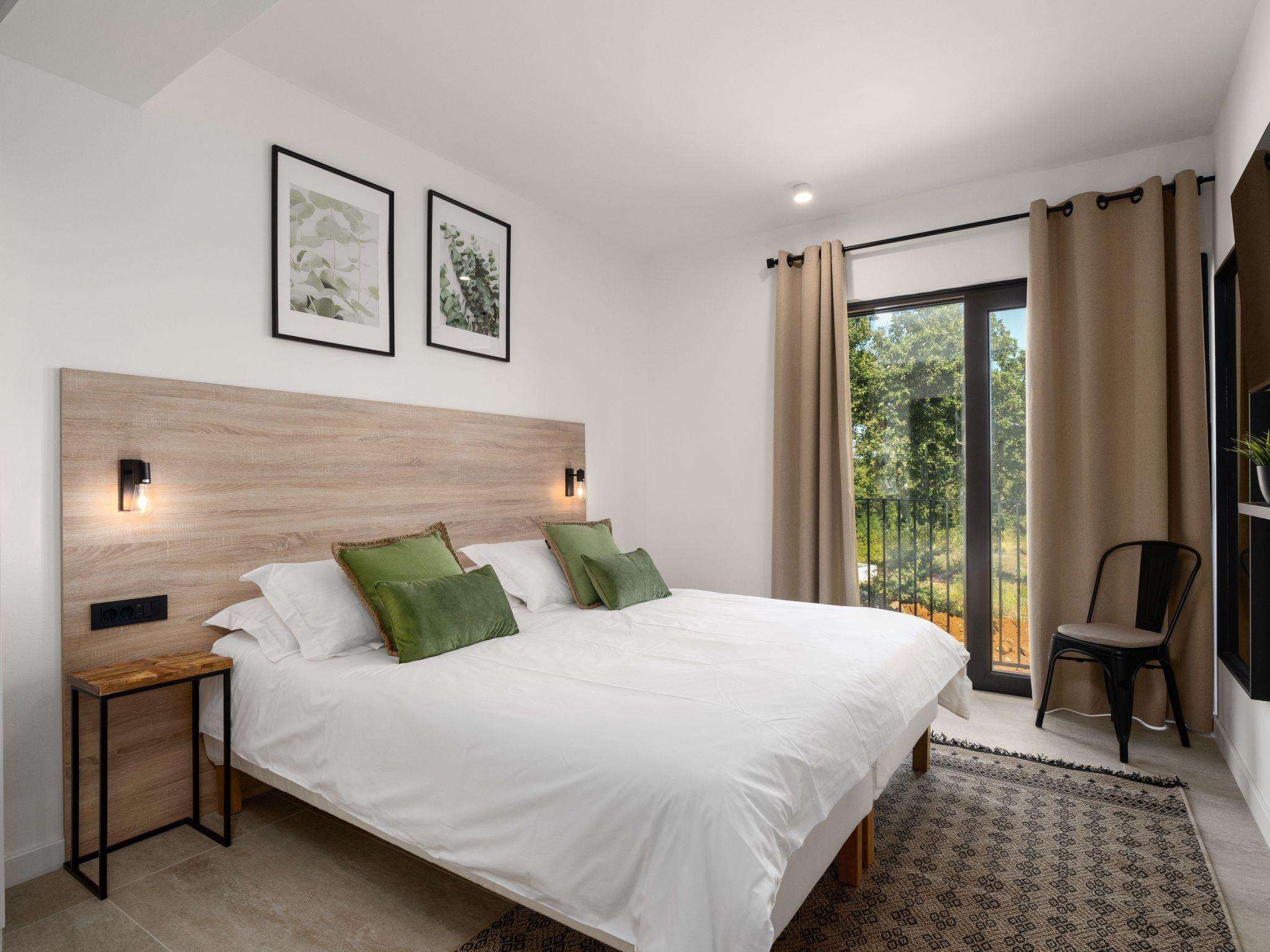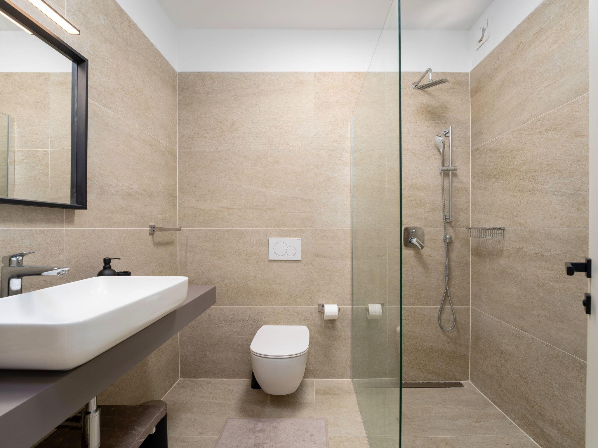 This modern villa for 8 people with a total area of 290 m² is spread over three fully air-conditioned floors. On the ground floor there is a spacious living room with access to the terrace and pool, a fully equipped kitchen, dining table and a separate toilet. On the first floor of the house there are four bedrooms with double beds, each with its own shower/WC and small balcony overlooking the pool and the green surroundings.