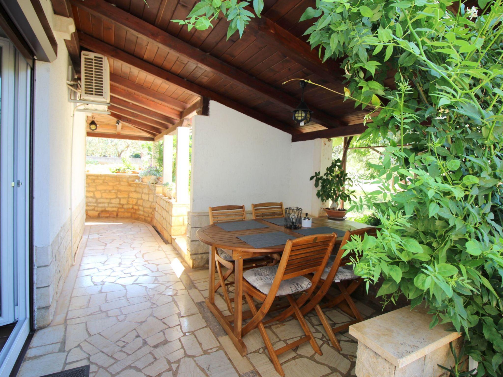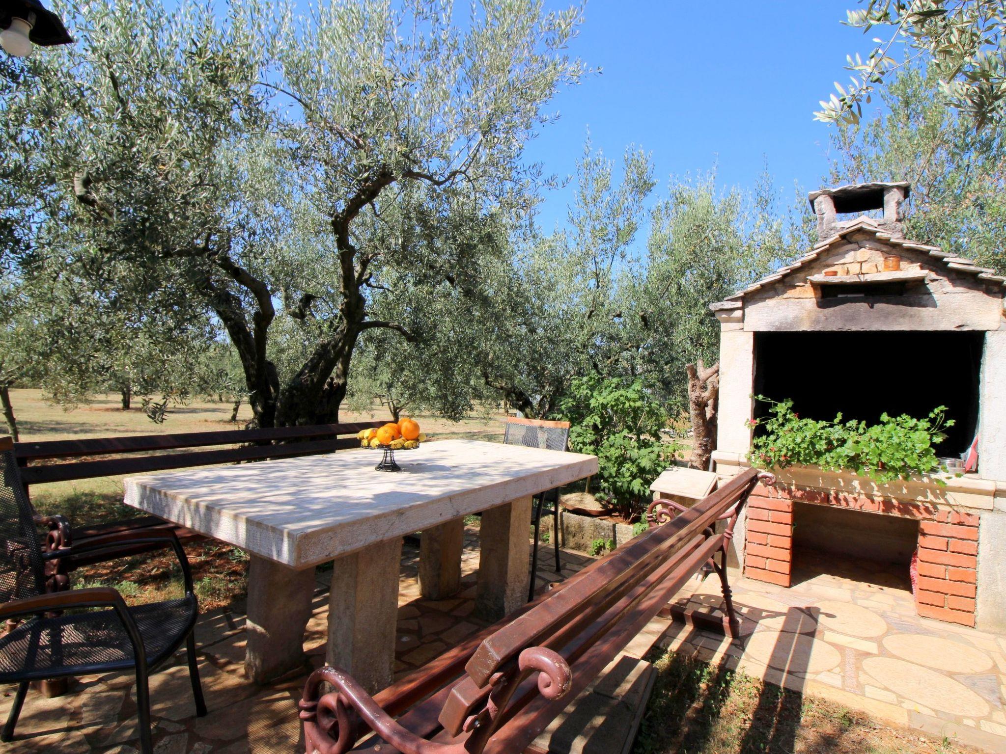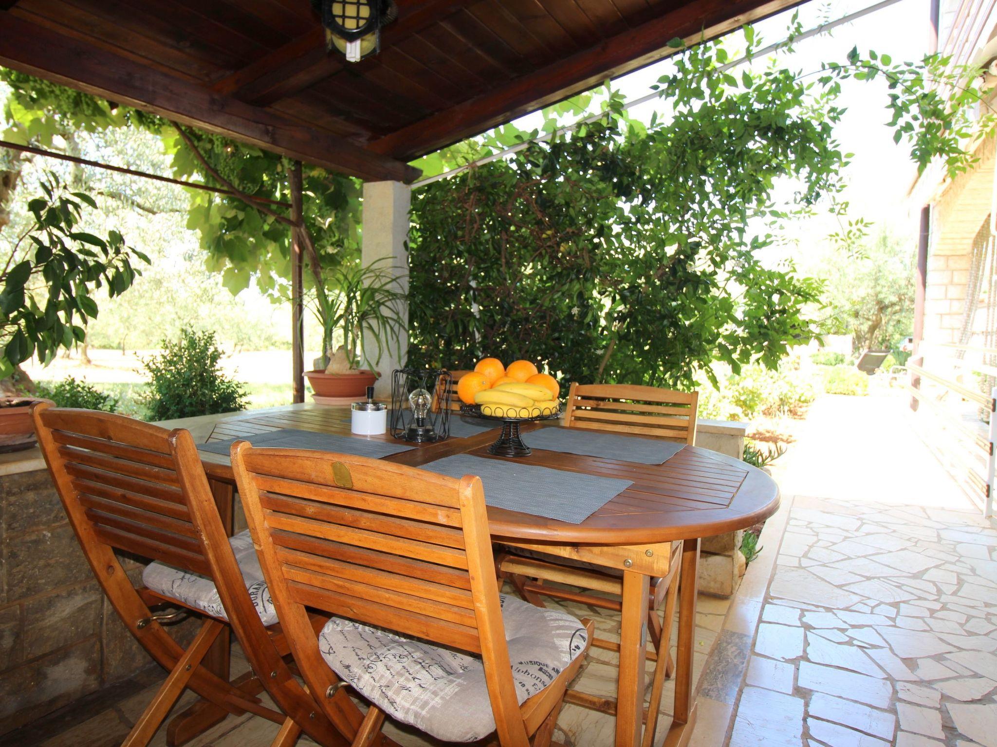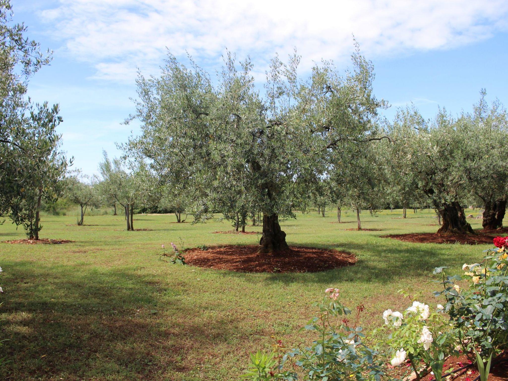 Outside, the covered terrace with comfortable seating invites you to spend relaxing hours outdoors. The surrounding garden, which is shared, is lovingly decorated with blooming flowers, olive trees and a brick barbecue, providing the perfect setting for cosy barbecues in the open air. Here guests can enjoy the peaceful atmosphere and switch off.