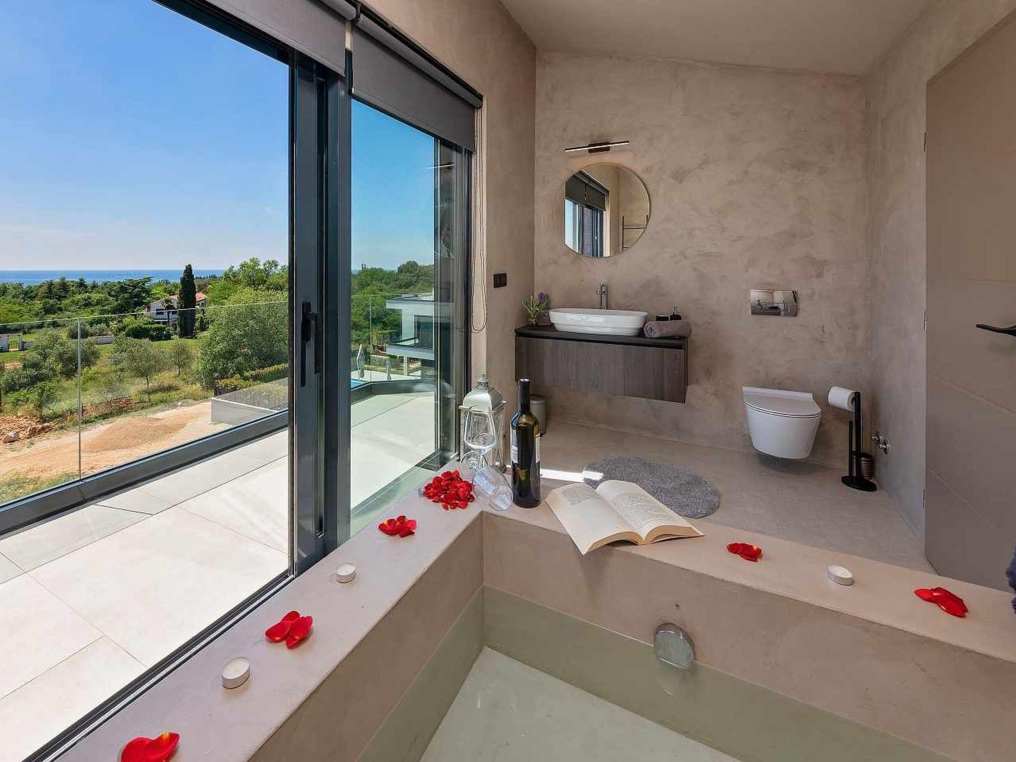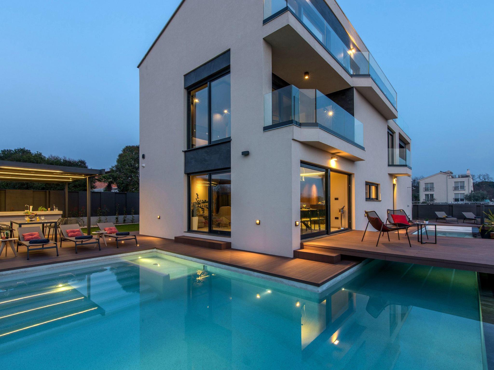 Modern Villa Mare Exclusive is located on the edge of the suburb of Spadici near Porec, only 700 m from the sea and 2 km from the town centre. The villa (semi-detached house) has a fenced plot with a wonderful 50m2 infinity pool, sunbeds, covered terrace with barbecue, table and chairs for outdoor dining and the other with a lounge set. The speciality of the house is the enchanting sea view from the garden and ground floor as well as from all floors so that you can enjoy the sunset in the evening. Thanks to its location, Villa Mare Exclusive is an ideal holiday home for a holiday in Porec, relaxing in peace and quiet but at the same time only 10 minutes walk to the beach, shop, restaurant and other leisure facilities. The landlord occasionally lives in the other half of the house, but the garden and pool area are for exclusive use.