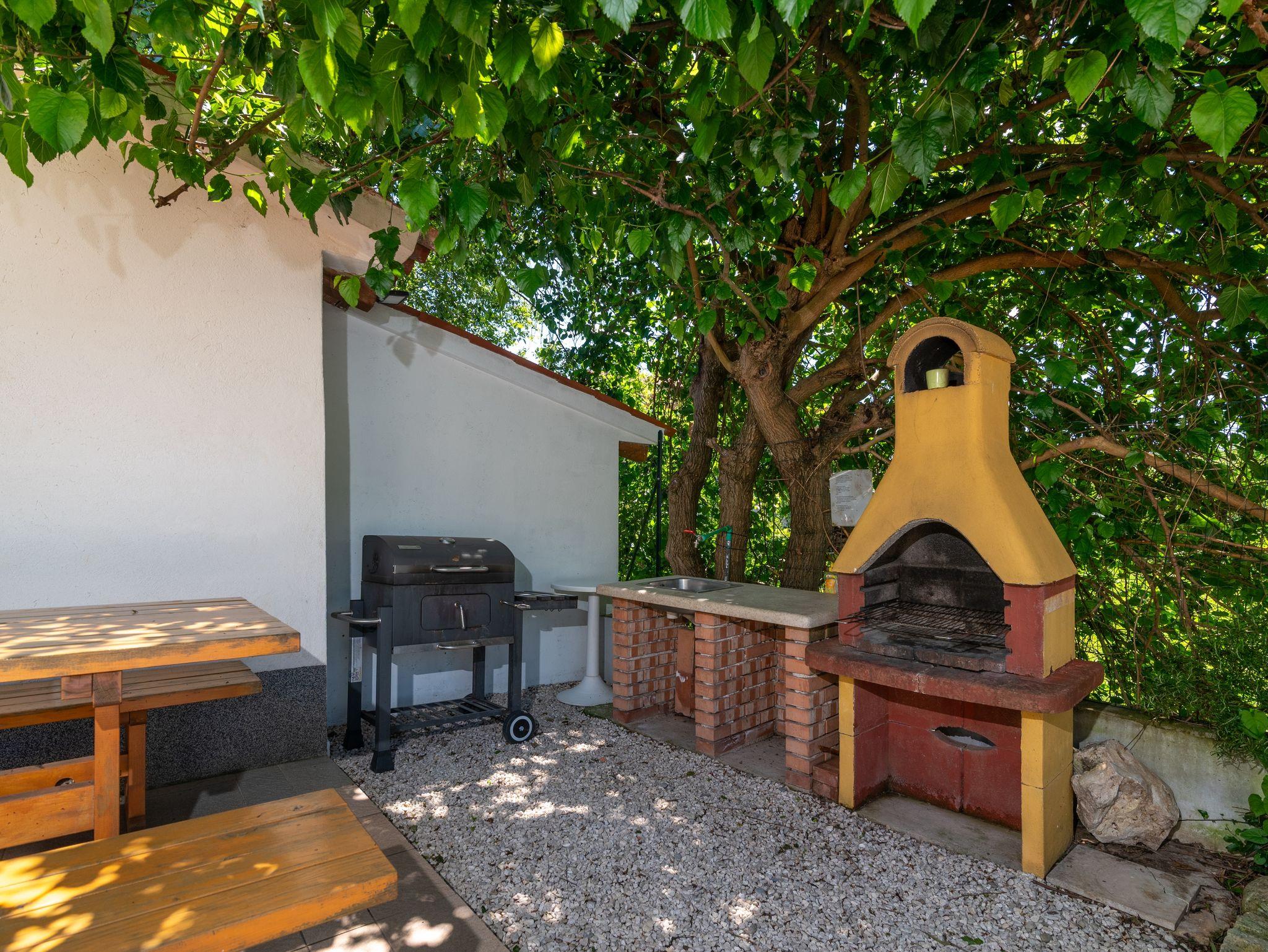 Umgebung des Objekts (Eingerichtet), Hof (300m2, Kinderbereich, Sitzbereich), Parkplatz (Anzahl der Parkplätze: 7, Entfernung vom Objekt: im Hof), Pool: gemeinsam, Dimensionen: 8m x 4m x 1.5m, Wassertyp: Süßwasser, Grill: gemeinsam, WiFi Internet, Wäschewaschen, Föhn, Bügeleisen, Bügelbrett, Tragbarer Grill, Sonnenschirm, Liegestühle, Kinderbett