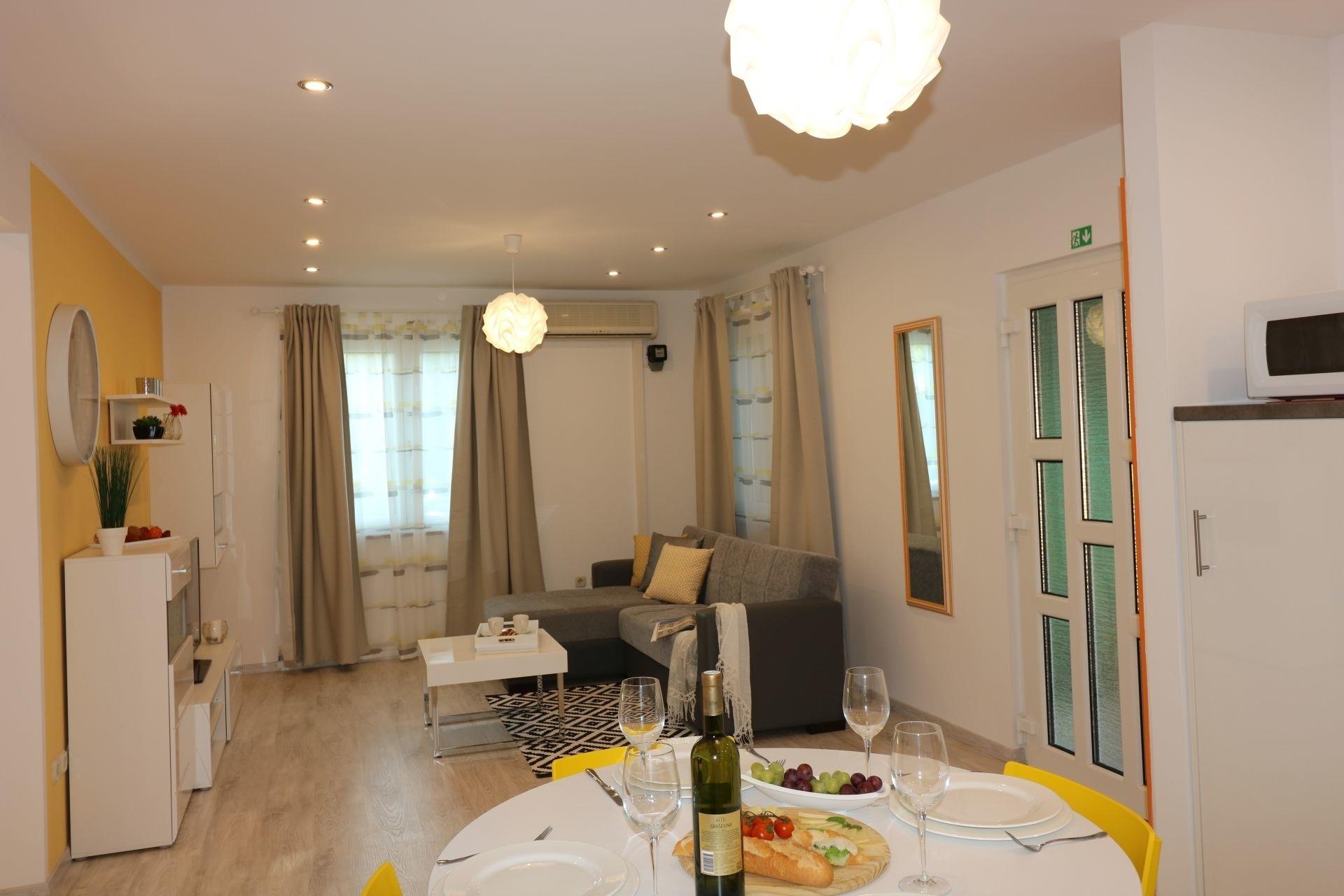 Schön und modern eingerichtet: Wohn -/ Esszimmer mit 1 Diwan , SAT-TV, Klimaanlage, Ausgang zum Garten und zur Terrasse.